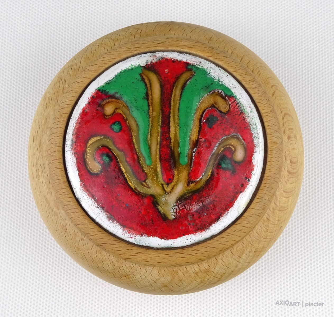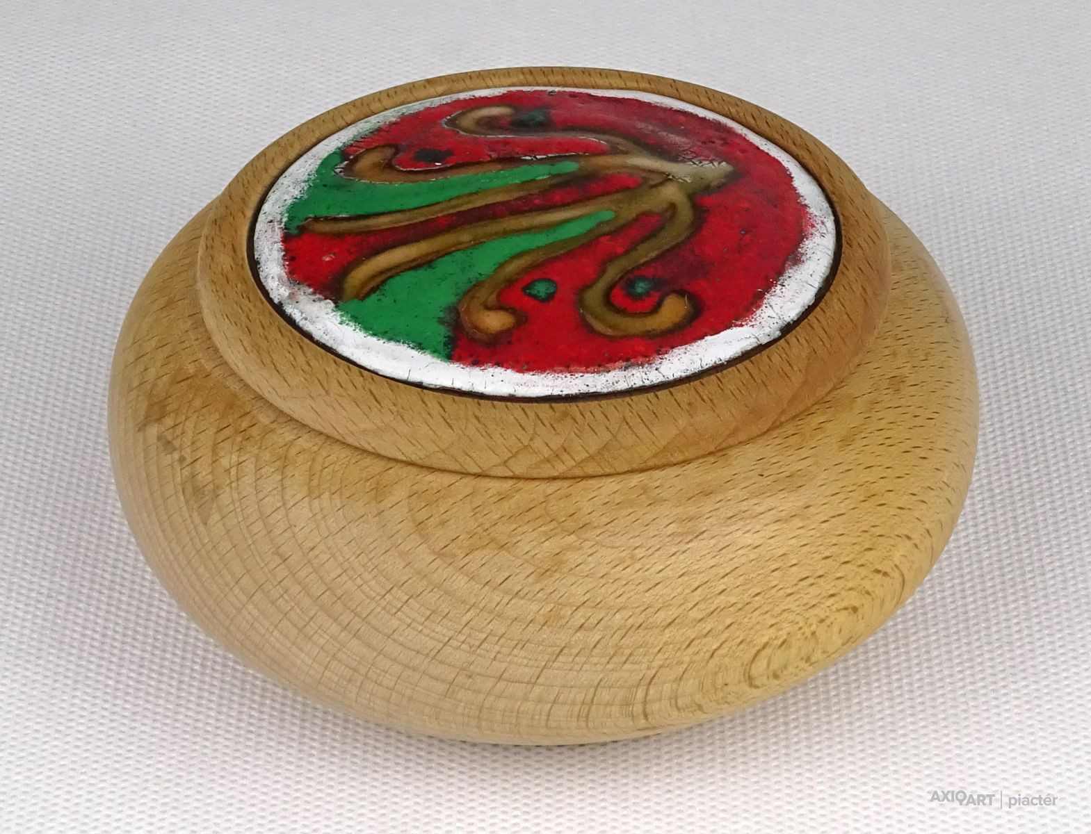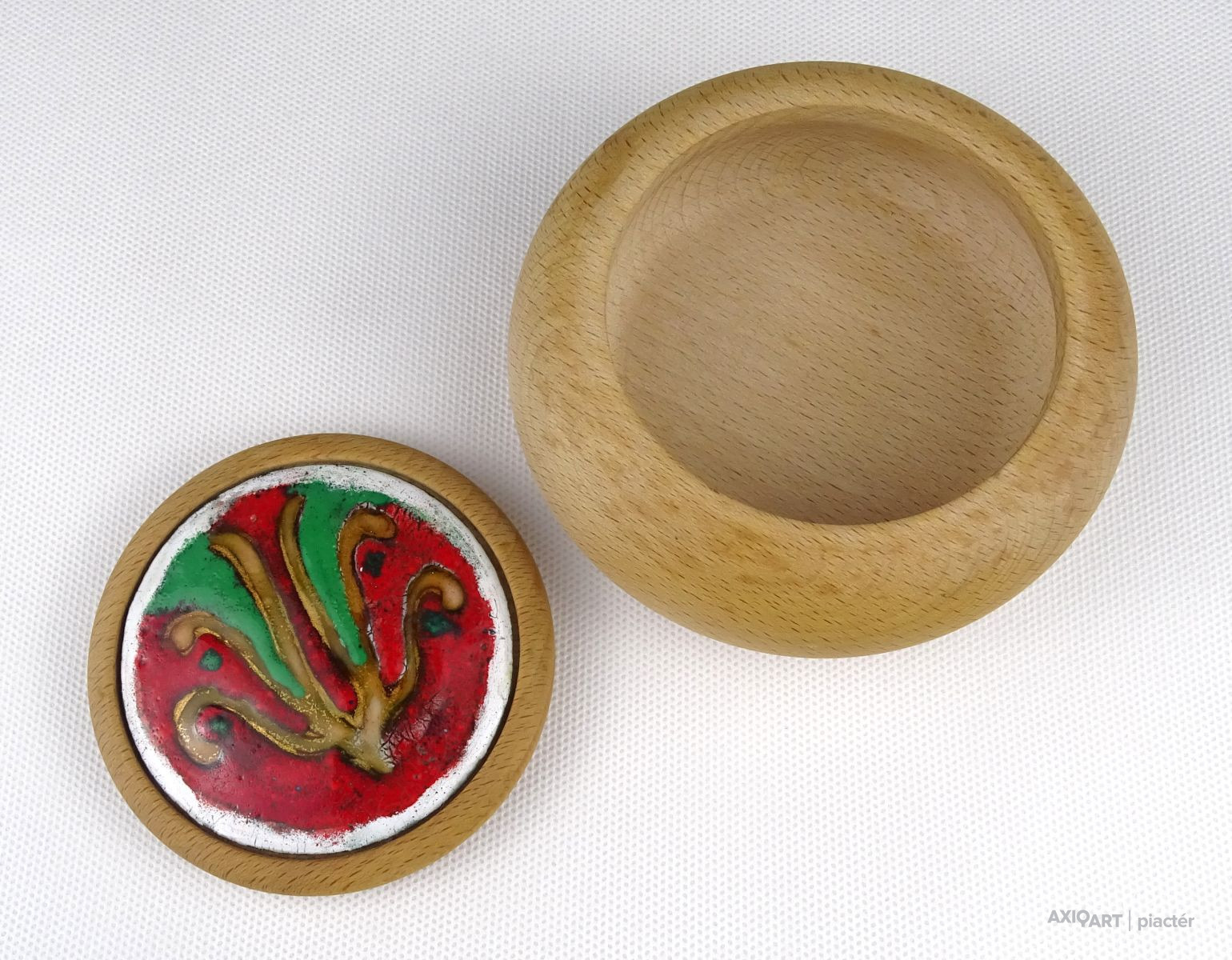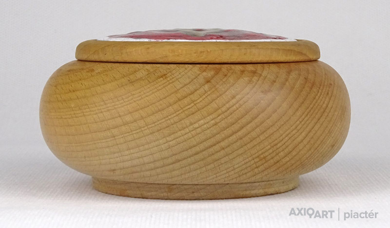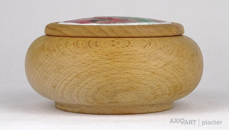 Jelzett művészi alkotás. Ékszertartó, gyűrűtartó fa bonbonier, zománcbetétes tetővel. Ajándékozható állapotban van.