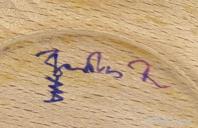[1Y029/Z018] Olaj farost festmény, üveglap mögött, hibátlan képcsarnokos keretben. Hátoldalán Képcsarnok Vállalat papír címkéje: A művész neve: SCHÉNER MIHÁLY A kép címe: TÁJ Magasság: 66.5 cm Szélesség: 86 cm Súly: 6.54 kg Schéner Mihály festő, grafikus, szobrász, keramikus, bábtervező Medgyesegyháza, 1923-01-9 Elhalálozott: Budapest, 2009. május 11. Honlap: http://www.kormendigaleria.hu/kiadvany.html 1942-1947: Magyar Képzőművészeti Főiskola, tanára: Rudnay Gyula. 1978: Munkácsy-díj; 1984: érdemes művész; 1989: kiváló művész; 1995: Kossuth-díj. 1992-től a Magyar Művészeti Akadémia, 1993-tól a Széchenyi Irodalmi és Művészeti Akadémia tagja. 1956-ig tanított. 1982: Nagyatádi Faszobrász Alkotótelep, 1985: Nemzetközi Acélszobrász Alkotótelep, Dunaújváros. A stílusában felismerhető, mégis sokféle műtárgyat létrehozó ~ gazdag, állandóan alakuló életműve a folyton változó világban helyét kereső, az alkotói szabadságot megvalósító XX. századi képzőművész példázata lehetne. Magát expresszív-szürrealista alkotónak nevezi. Egyaránt dolgozik festékkel, textillel, fával, fémmel. Rajzol, szerkeszt, farag, épít, gyúr, varr és ragaszt, felhasználja a mézesbábok öntőformáit. Festő, rajzoló, textilszobor- és bábkészítő, fazekas, asztalos, esztergályos. Háromlépcsős folyamatban gondolkozik: rajzban tervez, majd fest, szobrot készít, “formába önt”, mindig a végső plasztikai megoldást keresi. Ami állandó és mégis játékosan változékony megjelenésű Schéner művészetében, az a gyermekkori emlékek által meghatározott népi mesterségek iránti tiszteletet kifejező motívumkincs, a tárgyi folklór formakészlete, amely már-már kézjegyként ismétlődik munkáin. Mitologikussá nőtt képzelete új lényeket teremt, pl: a Pigulát, amely disznótestű, emberfejű teremtmény. Schéner festményein a szürrealista motívumokat konstruktív szerkezetbe rendezi, a geometriát és az organikus természeti motívumokat egyaránt beépíti műveibe. A népi, népművészeti formakincsből merített lovas huszárok, betyárok, szegénylegények cifra szűr mentéje, piros csákója, fekete csizmája, az önálló életet élő zsinórdíszek és mézeskalács bábok, a kiskocsik a gyermekkori vásárok, búcsúk színes forgatagába vezet. A primér motívumokat aztán felváltják a vastagon felhordott felületbe karcolt jelek, vonalhálózatok, amelyek a játszó gyermek homokba rajzolt ábráit, a pásztorember fába vésett üzeneteit, az ősember barlang falába rótt mágikus jeleneteit idézik meg. A művész pillanatnyi érdeklődésének megfelelően a színek búvópatakként tűnnek el és jelennek meg ismét. A 60-as években leginkább a formákkal való játék érdekelte, a festmények felülete egyre gazdagodott: a táblaképek felületén applikációk jelentek meg, vagy lemállasztott rétegek hagyták maguk után hiányukat, motívumok nélküli ősformák, archetipikus képzetek bukkantak fel művészetében. A véletlenszerűnek látszó rétegekkel való játék azonban tudatos komponálás eredménye, amely később nyilvánvaló ritmusnak és formai szerkesztettségnek adja át a helyét, mint a Törvénytáblák c. sorozaton. A különböző művészi kifejezési formák egymásra termékenyítő hatással vannak, át- meg áthatják egymást. Textilszobrai, amelyekkel új műfajt teremtett, ugyanazzal az automatikus, expresszív-szürrealista módszerrel készülnek, mint festményei. A hagyományosan a népművészetben alkalmazott anyag, a filc lehetőséget ad a népi formakincs felelevenítésére, amely azonban a művész különös szürrealista átiratában jelenik meg. A szívekkel kivarrt, zsinórdíszes Posztókotlós c. művén mézesbábok lógnak, hátán huszárok lovagolnak. Egész sor textilből készült kéz-plasztikát alkot, amelyeket az ujjakra rávarrt díszekkel öltöztet, személyesít meg. A színes-különös világból aztán ~ újra puritán képi és formai rendbe juttatja el a nézőt, majd nemsokára tépett, gyűrt, vágott, csorgatott, repedezni hagyott szenvedélyesen vonagló képi felületeket hagy hátra. Schéner készített apró gyermekjátékokat, térstruktúra-tereket, mászókákat is. A magyar népi formák mellett szürreális játékaiban gyakran alkalmaz görög mitológiai alakokat, “elkentaurosodott” lovakat, Gorgó-fejeket, sellőket, hárpiákat, Pán-ábrázolásokat. Schéner nemcsak saját művészetéről publikál, hanem művésztársairól is számos írása jelenik meg, elsősorban az Új Auróra c. folyóiratban, amelynek egy ideig főmunkatársa volt. Irodalom kiállítása, Magyar Építőművészet, 1962/4. Húsz év után, Művészet, 1965/4. BOZÓKY M.: ~, Tiszatáj, 1968/5. PERNECZKY G.: Nincs uborkaszezon, Élet és Irodalom, 1969. augusztus 8. BARÁNSZKY-JÓB L.: ~, Művészet, 1969/9. LÁSZLÓ GY.: ~ kaposvári kiállítása, Jelenkor, 1969/4. MAJOR M.: Pásztorok, betyárok, huszárok - kezek, Tükör, 1970. szeptember 15. FRANK J.: Bemutatjuk ~t, Élet és Irodalom, 1972. május 6. ról kiállítása ürügyén, Képzőművészeti Almanach, Budapest, 1972 Sötétkék kokasok, Élet és Irodalom, 1973. szeptember 9. MAJOR M.: ~ játékai, Élet és Irodalom, 1974. július 27. BARTA J.: Egy különös művész, Alföld, 1974/6. VADAS J.: Szárnykészítők, Élet és Irodalom, 1975. október 4. JUHÁSZ F.: A halál ellen játszani, Élet és Irodalom, 1975. május 17. PAP G.: Kincsek és műkincsek, Művészet, 1975/6. P. SZŰCS J.: Az utak kettéválnak, Művészet, 1978/3. Békési művészet, Művészet, 1978/7. SZAMOSI F.: ~ [kismonográfia], Budapest, 1978 VADAS J.: Játék a játékkal, Élet és Irodalom, 1979. augusztus 18. NÉMETH L.: ~ műveiről, Művészet, 1979/4. MIKLÓS P.: Mit akar ez a múzeum?, Művésze