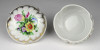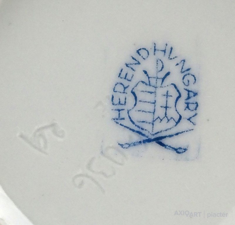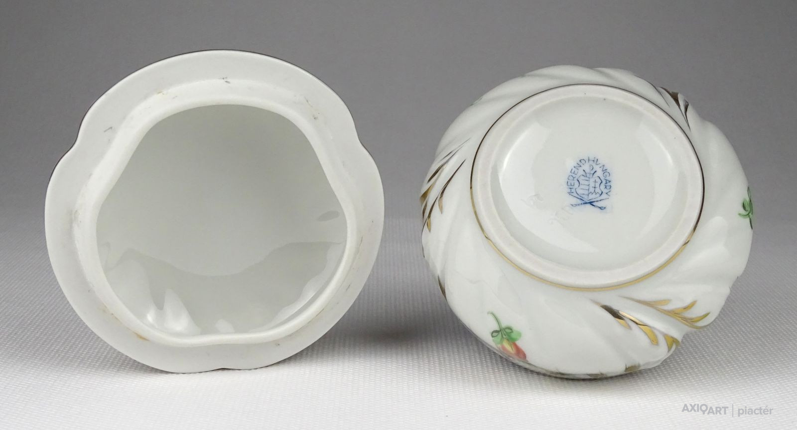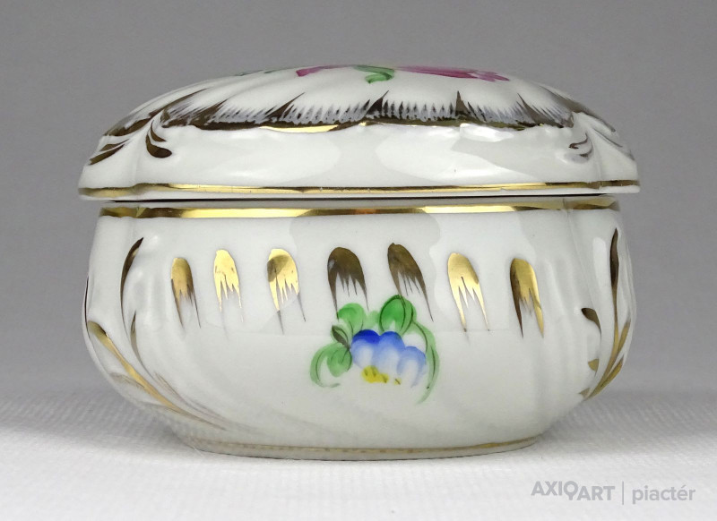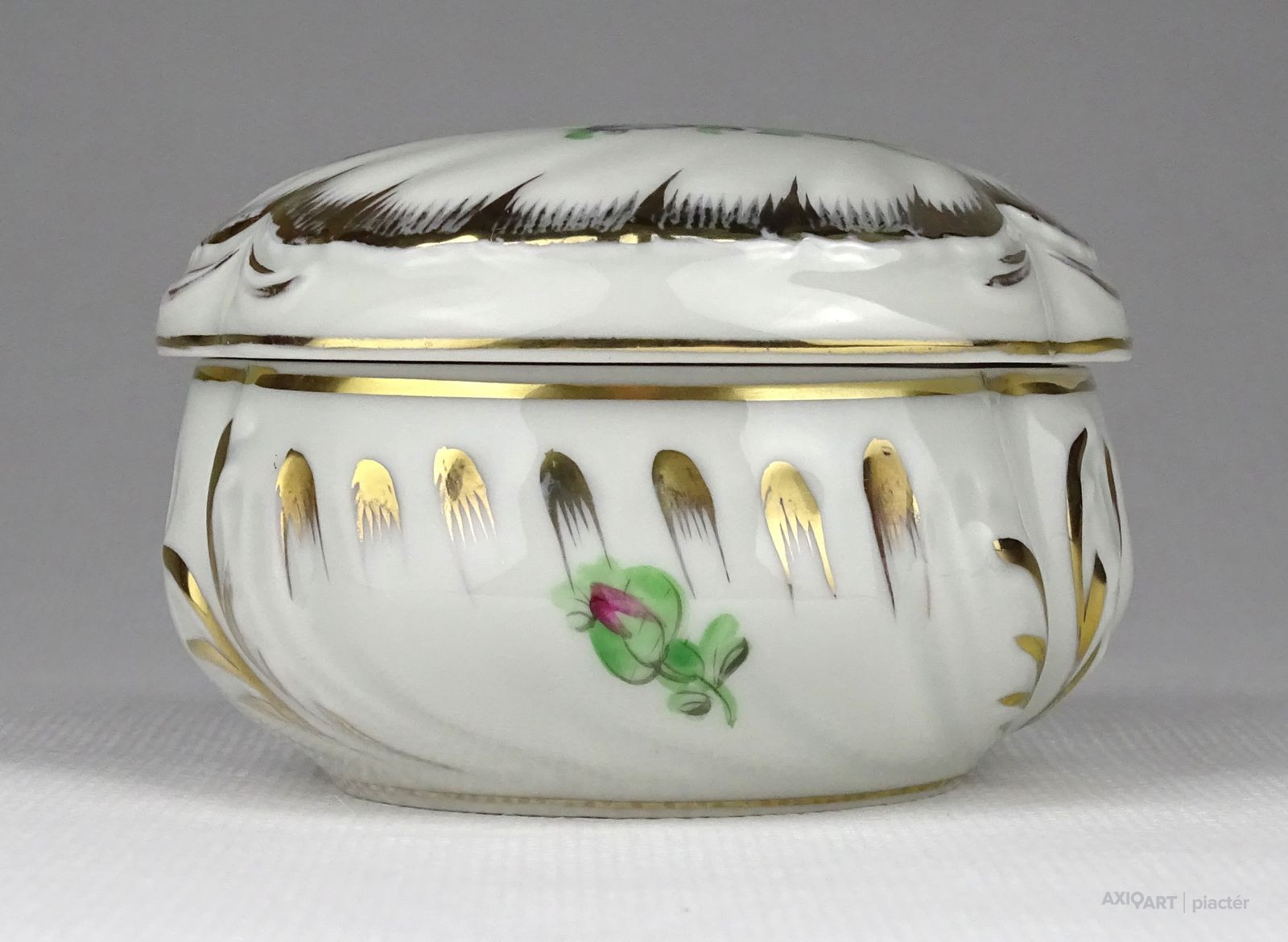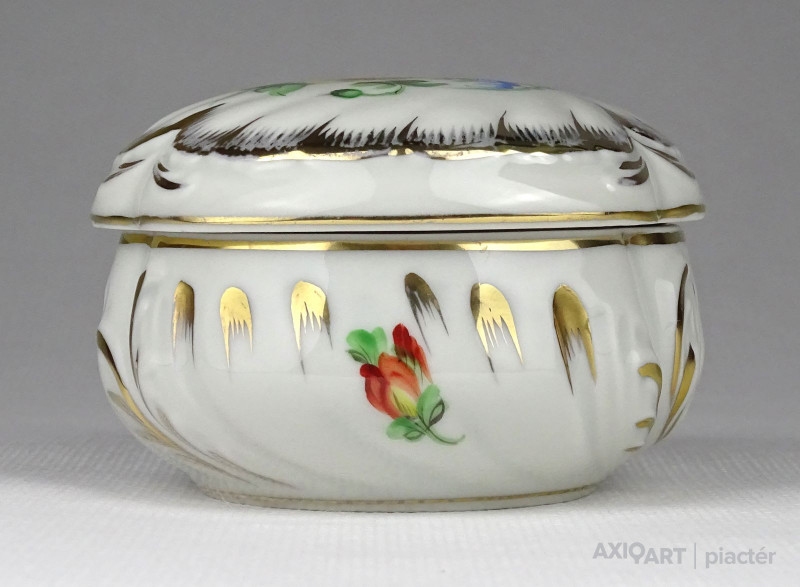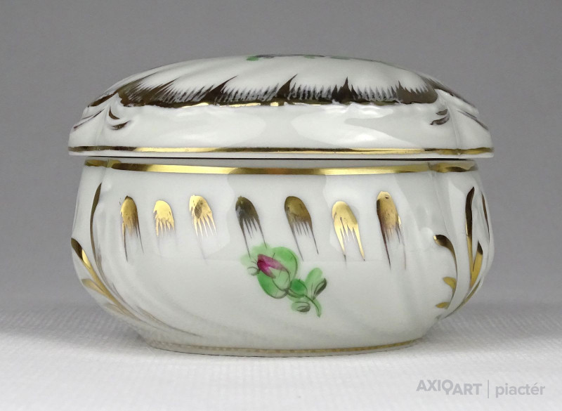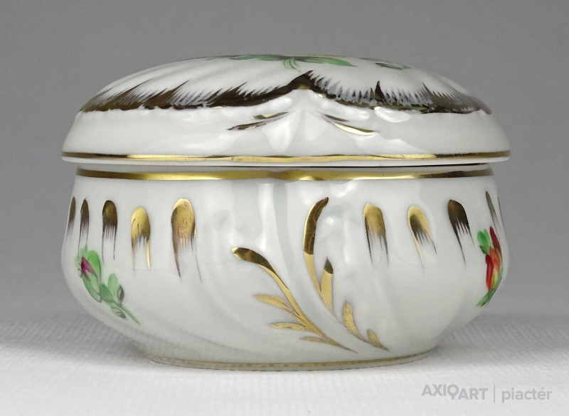 [1K538/VTR-7] Régi, hibátlan állapotú, kézzel festett, aranyozott díszítésű, virágmintás gyűrűtartó, bonbonier. Alján kék első osztályú Herendi jelzés: HEREND HUNGARY Mélynyomással: HEREND Formaszám: 3936 Magasság: 5.3 cm Szélesség: 8 cm Súly: 0.15 kg