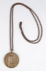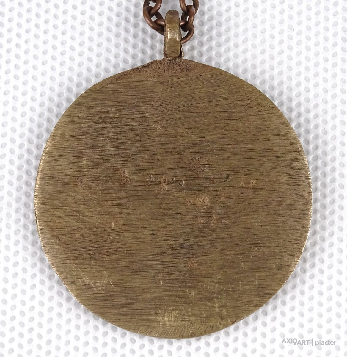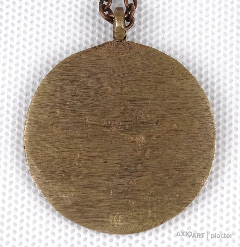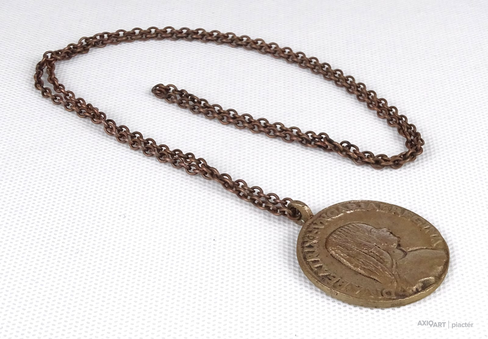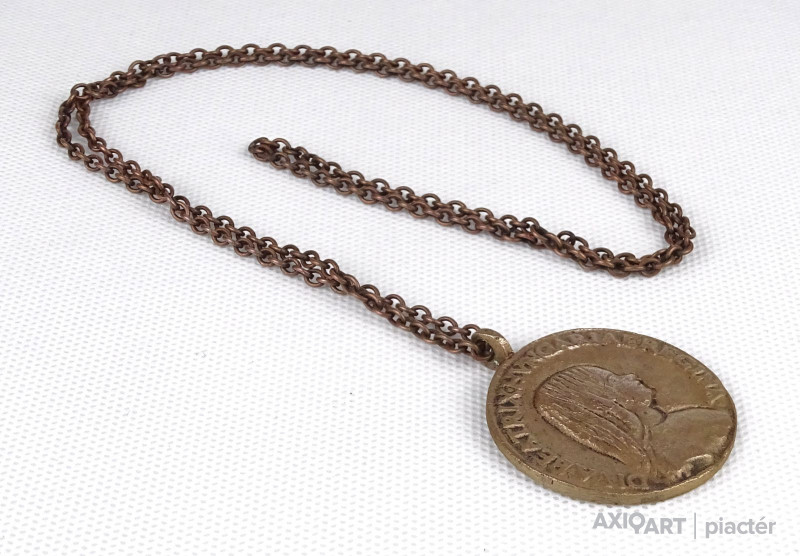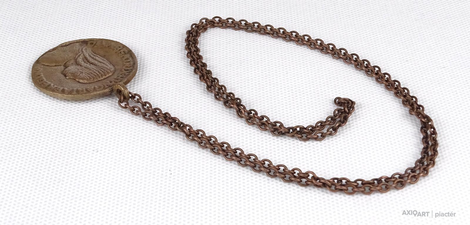 Réz láncon található réz plasztikus medállal.