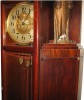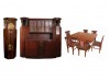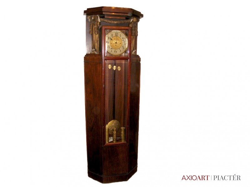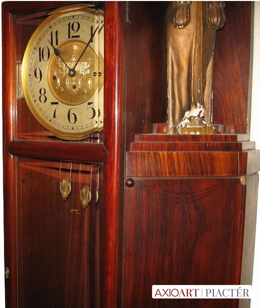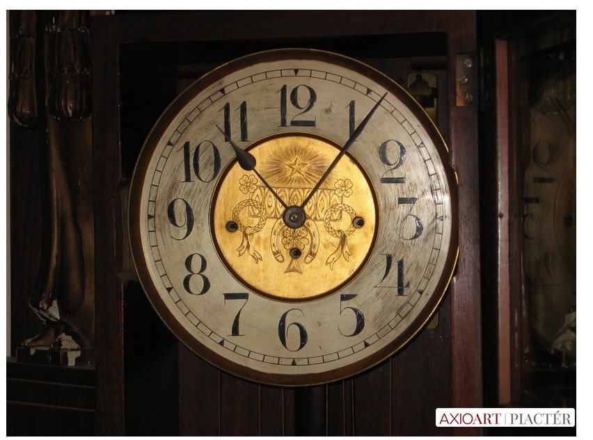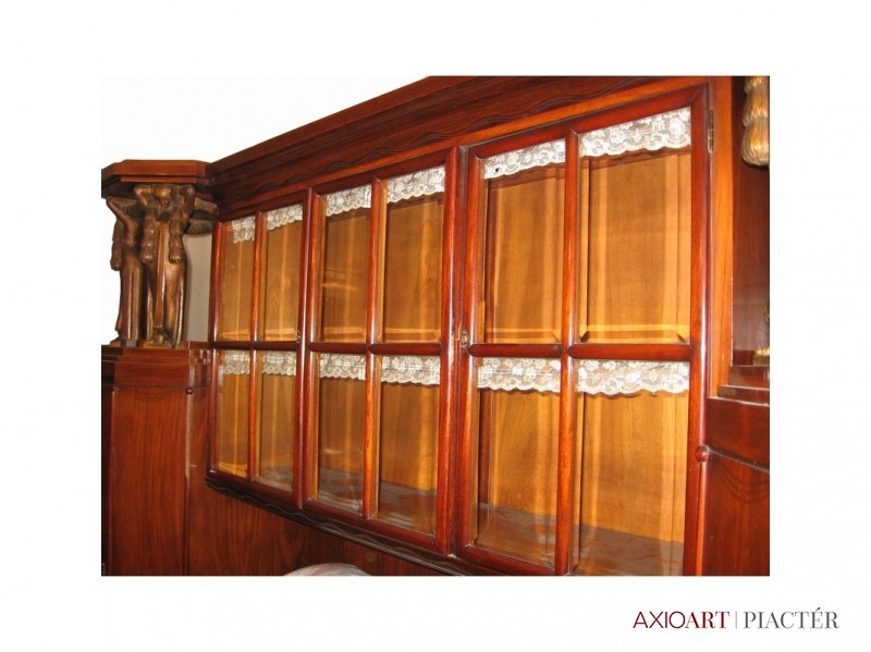 [AD38/BX-1] Nagyon exkluzív darab, ez az Osztrák szecesszió egyik legszebb korszakából való. Nagyon magas szintű asztalos munka, a nemzetközi műtárgy kategóriába tartózó bútor. 100 éves nagyságrend után még mindig gyönyörű, magas fénye van. Felújjítva soha nem volt. Tálaló szekrény : Fazettázott, metszett üveges felső rész. Nagyméretű márvány lap a nagytálaló alsó részében, középen lent 5 fiókkal, rajtuk nagyméretű míves kézi veretes fogantyúk. Két oldalán ajtós rész, felette aranyozott fa faragvány ember alakos díszekkel. Fotó szerinti kissé kopottas állapotban. Álló óra : Három súlyos, ingás, rajta szintén fa faragvány ember alakos díszekkel, ajtajában fazettázott, metszett üveggel. Ingán és a súlyon alábbi motívumok találhatóak: lóhere - ötágú csillag - szerencse patkó - koszorú Eredeti kulcsa megvan hozzá! Asztal - székek: Kinyitható asztal négy pót lábbal ( kinyitva 12 személyes ), alja réz lemezzel bevonva, így megóvva a sérülésektől, kopásoktól. Ez kissé elhasználódott, de alapvetően jó állapotban van. Az asztallap politúrja nagyon szép állapotban van, sérülésmentes. Hozzá tartozó 6 db szék, lábain réz ,,patkókkal";, huzata csokoládé barna, sértetlen állapotban (újrakárpitozva). Az egyik szék alján kisebb sérülésnyom található, nem jelentős és ettől még abszolút stabil. Az asztal alsó-oldalsó részén svartni , furnér hiány található.