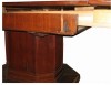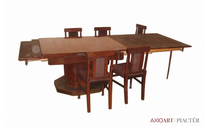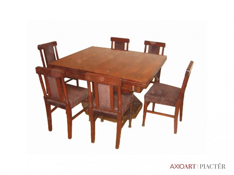 Kinyitható asztal négy pót lábbal ( kinyitva 12 személyes ), alja réz lemezzel bevonva, így megóvva a sérülésektől, kopásoktól. Ez kissé elhasználódott, de alapvetően jó állapotban van. Az asztallap politúrja nagyon szép állapotban van, sérülésmentes. Hozzá tartozó 6 db szék, lábain réz ,,patkókkal";, huzata csokoládé barna, sértetlen állapotban (újrakárpitozva). Az egyik szék alján kisebb sérülésnyom található, nem jelentős és ettől még abszolút stabil. Az asztal alsó-oldalsó részén svartni , furnér hiány található.