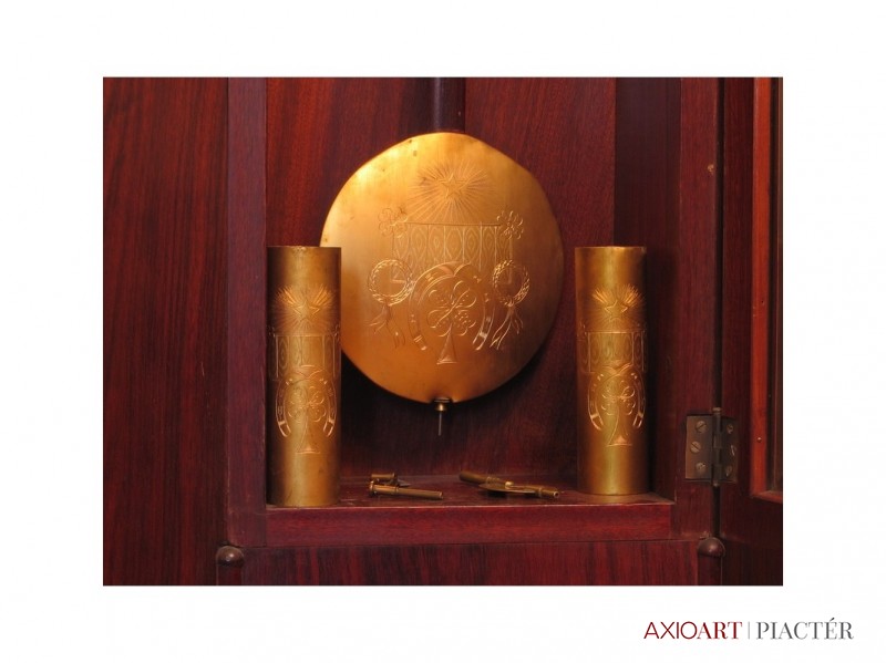 Három súlyos, ingás, rajta szintén fa faragvány ember alakos díszekkel, ajtajában fazettázott, metszett üveggel. Ingán és a súlyon alábbi motívumok találhatóak: lóhere - ötágú csillag - szerencse patkó - koszorú