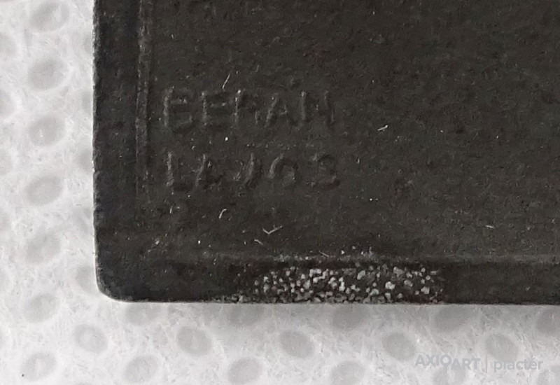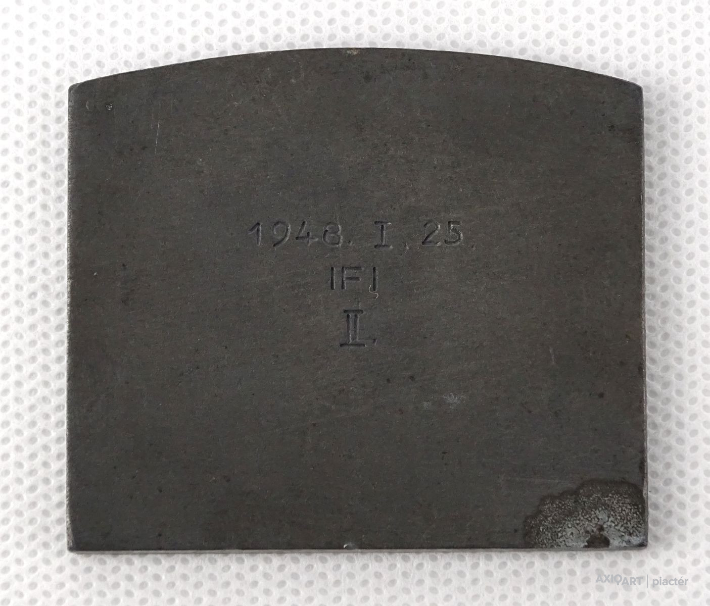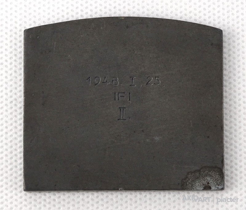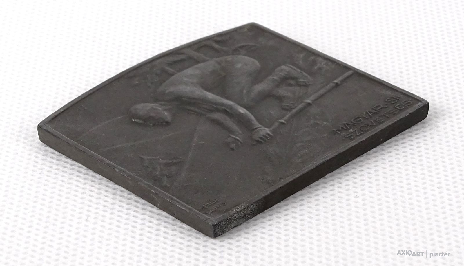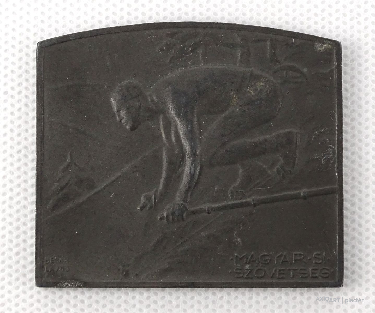 [1L995/X000] Régi jelzett sportérem, jelzett sport plakett. Egyik oldalán plasztikus, egy alakos kép, síelő férfi alakja látható. Felirat és jelzés: MAGYAR SÍ SZÖVETSÉG BERÁN LAJOS Másik oldalán vésett felirat: 1948.I.25. IFI II. Magasság: 4.8 cm Szélesség: 5.5 cm Súly: 0.06 kg Berán Lajos Berán Lajos Berán Lajos és Istvánffy Elemér Született 1882. június 9.[1] Budapest Elhunyt 1943. január 5. (60 évesen)[1] Budapest Állampolgársága magyar Foglalkozása művész szobrász éremművész   Rösler Endre sírja (Budapest, Kerepesi temető) Berán Lajos egyik műve: Szt. István 5 pengő 1938 Springer Ferenc domborműve (Budapest, Groupama Aréna főbejárat) Berán Lajos (Budapest, 1882. június 9. – Budapest, 1943. január 5.) magyar szobrász, éremművész. Testvére, Berán József labdarúgó, az FTC első csapatkapitánya.  Életpályája Telcs Edénél, majd Bécsben tanult képzőművészetet. 1903-tól csak éremművészettel foglalkozott, 1932-től az Állami Pénzverde művészeti vezetője lett, ebben a beosztásában számos pénzérménk tervezőjévé vált. Nagy számban vésett arckép- és sportérmeket is, köztük Semmelweis Ignác, Fadrusz János, Kőrösi Csoma Sándor, Erkel Ferenc, Petőfi Sándor, ebben a műfajban talán a mai napig ő volt hazánkban a legtermékenyebb mester. Emléktáblákat, bélyegeket is tervezett. 2006-ban az Országos Pedagógiai Könyvtár és Múzeum Vésnökök és mesterek c. kiállításán Berán Lajos 28 db. éremművészeti alkotása volt kiállítva.  Műveiből Háborús emlékérem (1915) (Öntött bronz, átmérő 96 mm ; MNG) Kálvin János érem Alpár Ignác érem (1925) (Öntött bronz, 81 mm ; MNG) Liber Endre érem[2](1932) (Vert bronz, 72 mm ; MNG) Pázmány Péter érem (1935) Több pengőérmét is tervezett és egyes forintérmékhez is felhasználták terveit. Emléktáblák (pl. a Hatvani kapué az Astoriánál) Bélyegtervek: Vöröskereszt (sorozat 6 f-es és 20 f-es névérték, 1942) Rösler Endre operaénekes síremléke a Kerepesi temetőben.  Kiállításaiból Nemzeti Szalon (1902) Kiállítás Milánóban (1906) Nemzeti Szalon (1923) Nemzeti Szalon (1925) Nemzeti Szalon (1927) OPKM Vésnökök és mesterek c. kiállítás (2006)  Társasági tagság Benczúr Társaság Forrás: wikipedia