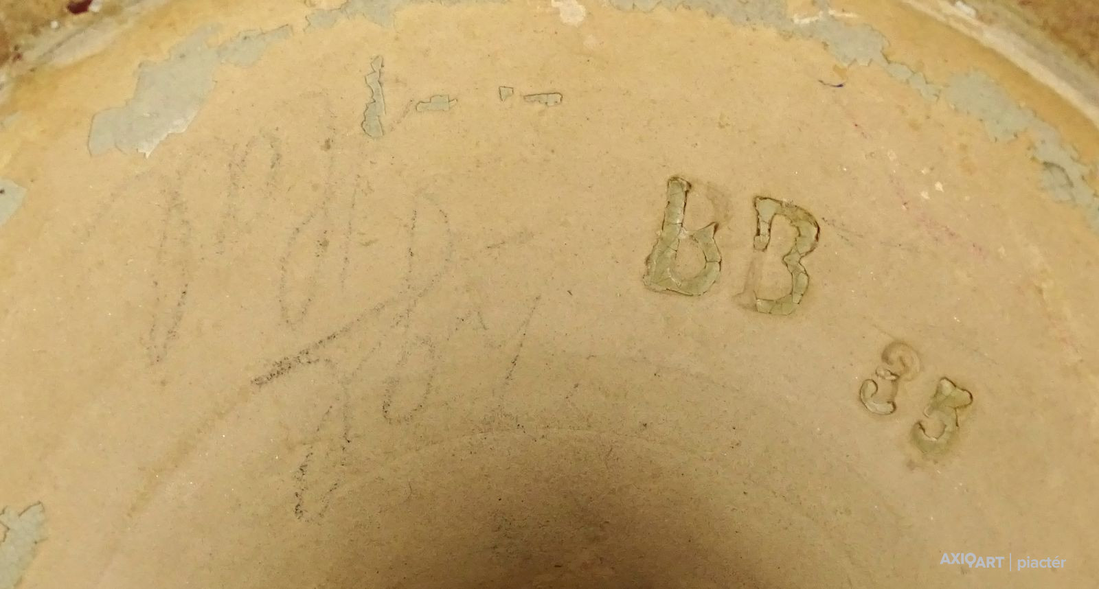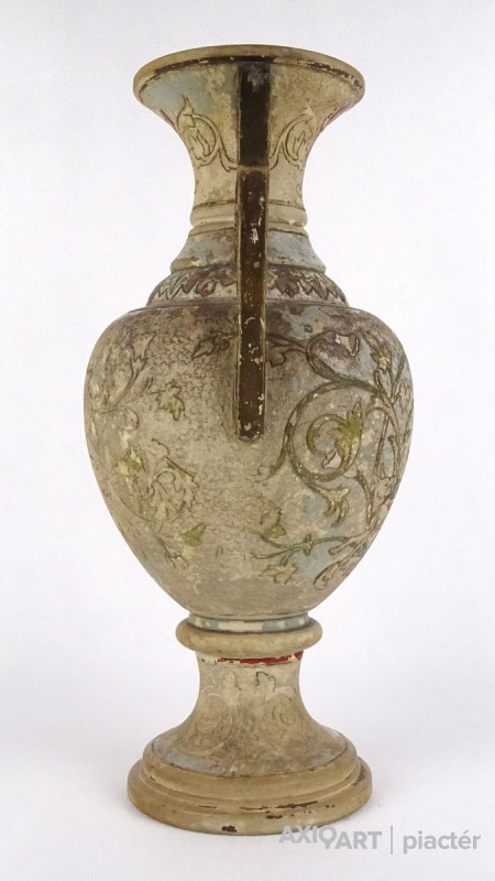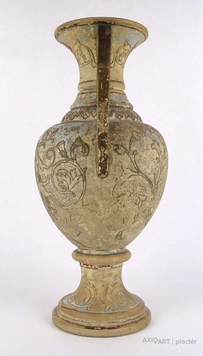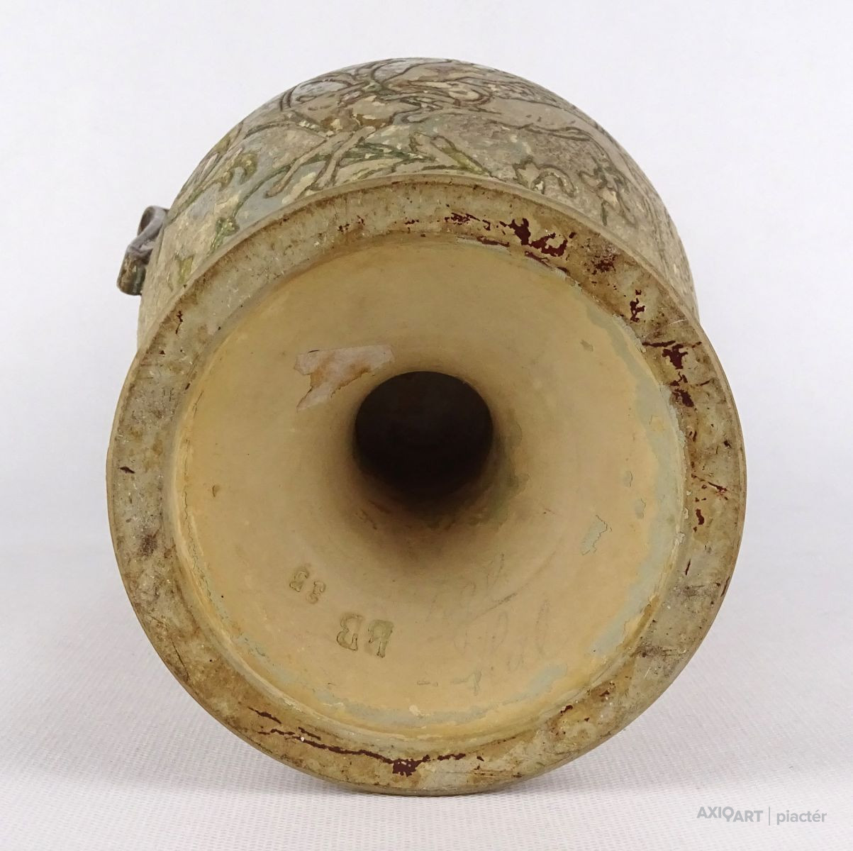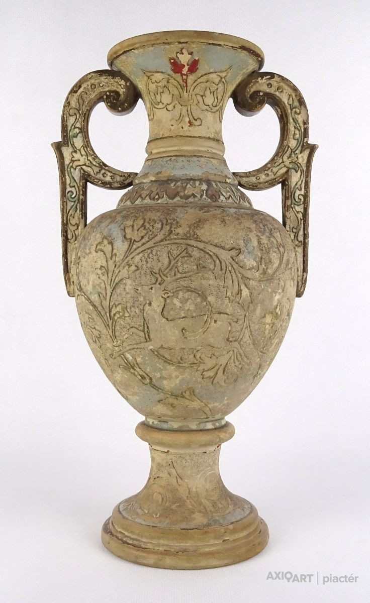 [1R382/Z023] Antik patinás, kopottas gyönyörű vadászjelenetes jelzett terrakotta váza. Kézi festése foltokban láthatók. Alján mélynyomott jelzés: BB (Bernard Bloch) Formaszám: 35 Magasság: 31 cm Szélesség: 17 cm Súly: 1.435 kg Forrás: www.geni.com Bernard Bloch Születési dátum: 1836. december 20. Születési hely: Meclov, Domazlice körzet, Plzen megye, Csehország Halál: 1909. szeptember 29. (72) Dubi, Dubi, Usti nad Labem megye, Cseh Köztársaság