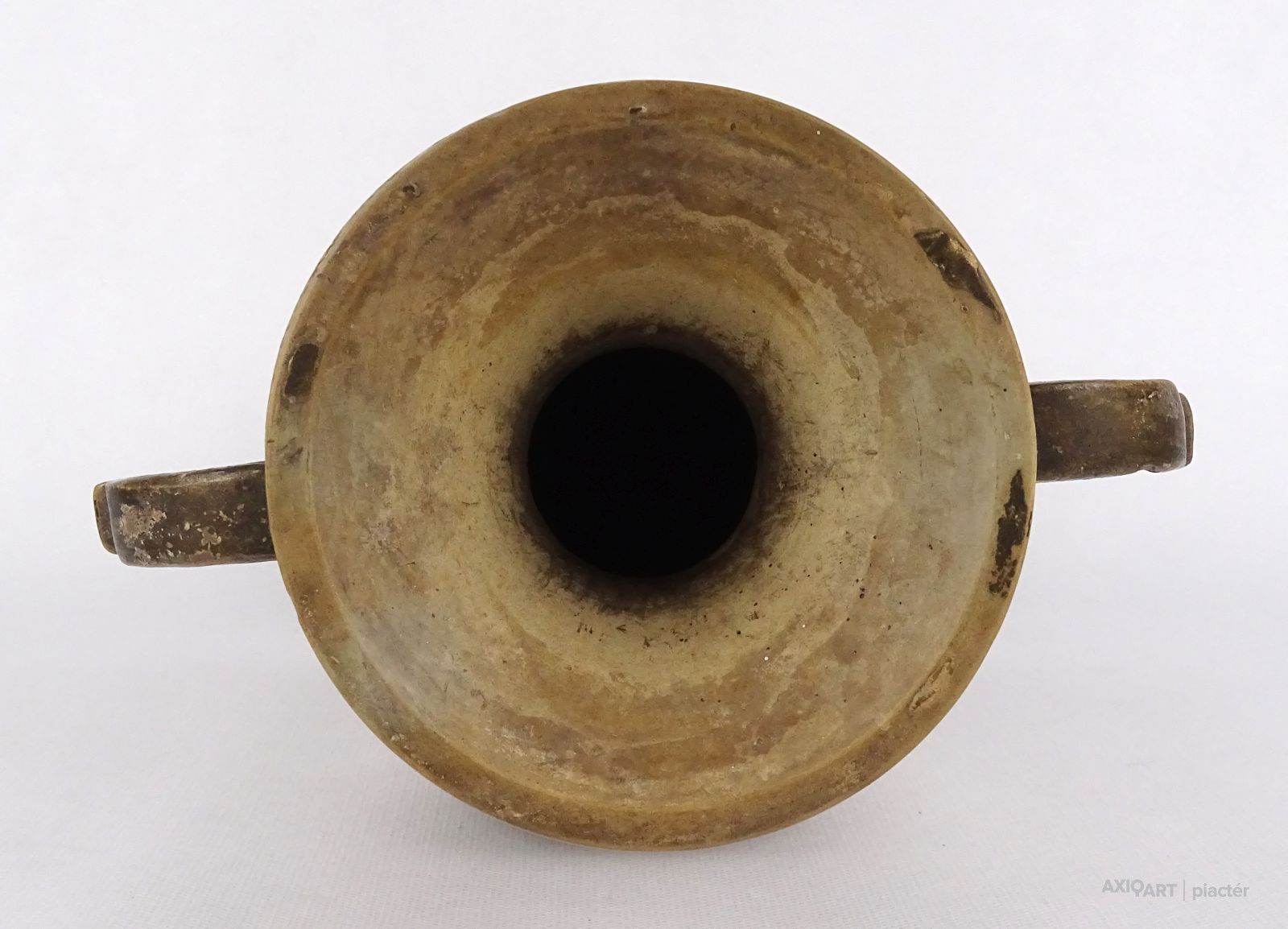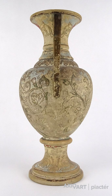 Antik patinás, kopottas gyönyörű vadászjelenetes jelzett terrakotta váza. Kézi festése foltokban láthatók.