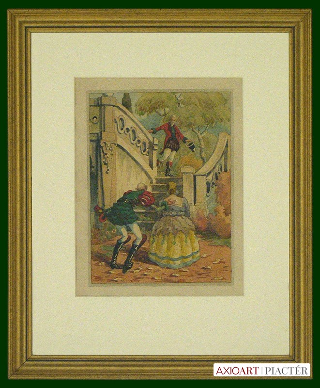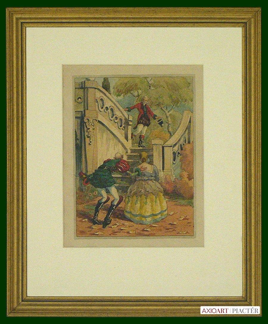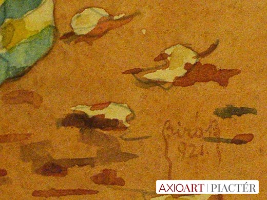 [FK1364/Bp302/45] A kép mérete: 23,5 x 18 cm keret nélkül. Készült: Akvarell, Papír A kép Bíró Béla (Makó, 1899) alkotása. Jelezve Jobbra lent "Bíró B 921." A festmény jó állapotban van. Keret: Új Magyar festők és grafikusok életrajzi lexikona I-II. Festő. A Magyar Képzőművészeti Főiskolán Csók István tanítványa volt, majd egy ideig ugyanitt mint tanársegéd tevékenykedett. Ezután rajztanárként dolgozott. 1943-ban a kolozsvári Egyetem magántanári címmel tüntette ki. 1955-ig a Szépművészeti Múzeum tudományos osztályvezetője volt. 1956-ban Los Angelesbe emigrált, ahol a Long Beach State College-ban a művészettörténelem tanárává nevezték ki. Tizenkét könyvet adott ki. Kiemelkedő műve a Bibliography of Art History. Főleg arcképeket festett. (KMHM) Magyar festők és grafikusok adattára A budapesti Képzőművészeti Főiskolán Csók István növendéke, majd tanársegédje. Középiskolai rajztanárként működött, majd művészettörténelemből doktorált. 1943-ban a kolozsvári egyetem magántanári címmel tüntette ki. 1955-ig a budapesti Szépművészeti Múzeum tudományos osztályvezetője volt. 1956-ban Los Angelesbe vándorolt, ahol a Long Beach State Collegeban a művészettörténelem tanárává nevezték ki. 12 könyvet publikált képzőművészeti- és pedagógiai tevékenysége mellett. Kiemelkedő művek a Bibliography of Art History c. könyve. Angolban ő sorozta be elsőnek az egyetemes művészettörténetbe a magyar művészeket. Arcképeket festett. - Irod.: GYKKL Magyar festők és grafikusok életrajzi lexikona I-II. Műgyűjtők és kereskedők kézikönyve Festő. A bp.-i Képzőművészeti Főiskolán Csók István növendéke volt, majd ugyanitt tanársegédként működött. Ezután rajztanárként dolgozott. 1943-ban a Kolozsvári Egyetem magántanári címmel tüntette ki. 1955-ig a Szépművészeti Múzeum tudományos osztályvezetője volt. 1956-ban Los Angelesbe vándorolt, hol a Long Beach State College-ban a művészettörténelem tanárává nevezték ki. Tizenkét könyvet adott ki. Kiemelkedő műve a Bibliography of Art History. Többnyire arcképeket festett. (KMHM)