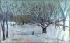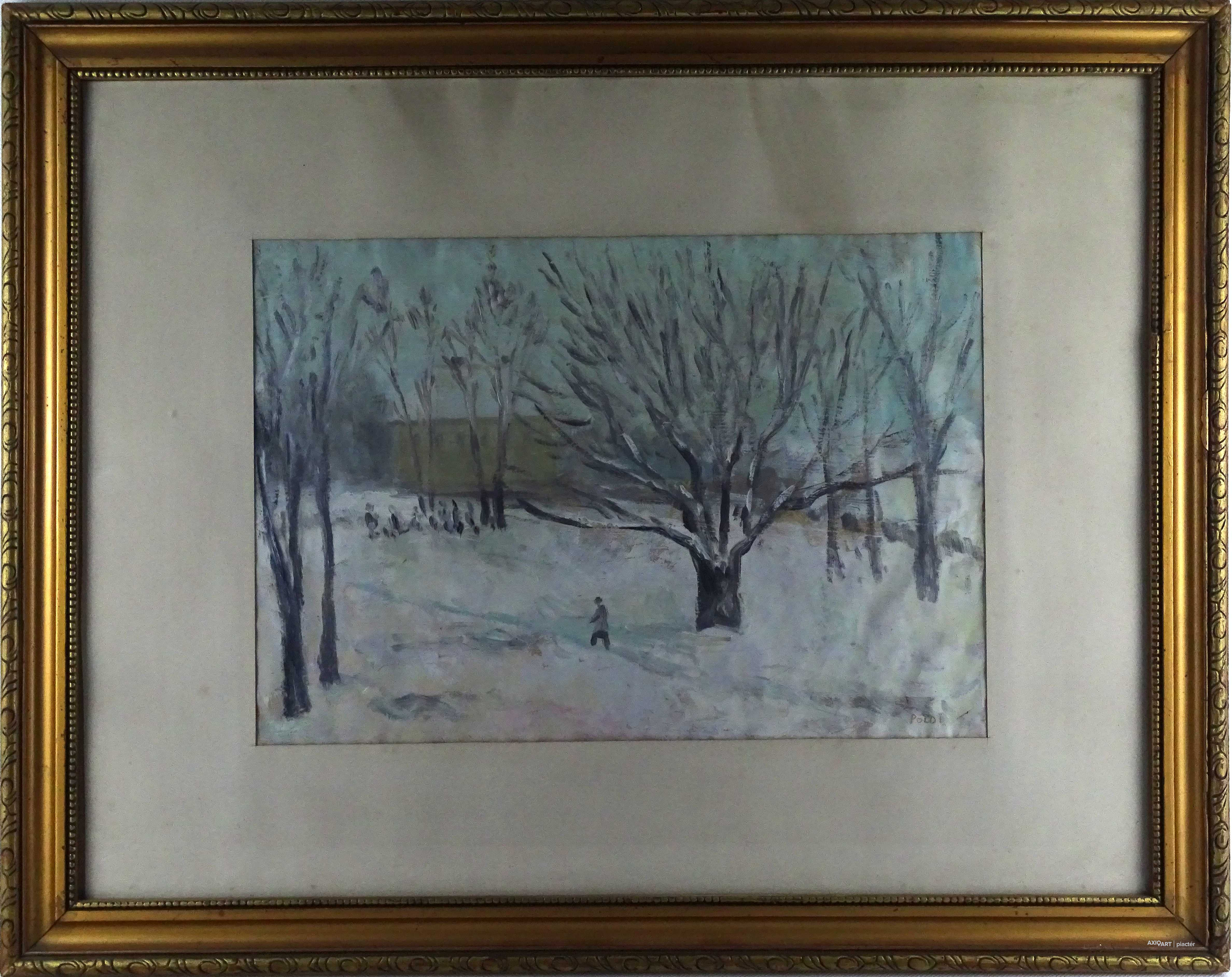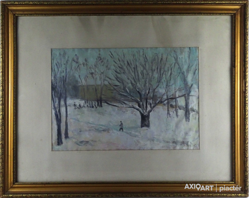 [1Z242/133] Olaj karton festmény, hibátlan állapotú aranyozott blondel keretben. Datált jelzés jobbra lent: SÁRDY BRUTUS '927 A kép hátoldalán kiállítási címke maradvány: 1930 ŐSZI KIÁLLÍTÁS Magasság: 48 cm Szélesség: 56.5 cm Súly: 2.825 kg Sárdy Brutus [bevezető szerkesztése] A Wikipédiából, a szabad enciklopédiából Sárdy Brutus Született 1892. január 20. Perlasz Meghalt 1970. szeptember 28.(78 évesen) Budapest Nemzetisége magyar Stílusa naturalista Iskolái Képzőművészeti Főiskola Mestere(i) Balló Ede Zemplényi Tivadar A Wikimédia Commons tartalmaz Sárdy Brutus témájú médiaállományokat. Sárdy Brutus (Perlasz, 1892. január 20. – Budapest, 1970. szeptember 28.) magyar festőművész és restaurátor. Sárdy Brutus emléktáblája egykori lakhelyén (Budapest III. ker., Dósa utca 17.).   Tartalomjegyzék   [elrejtés]  1Munkássága 2Főbb művei 3Irodalom 4Jegyzetek 5Források 6További információk   Munkássága[szerkesztés] 1910-ben iratkozott be a budapesti Képzőművészeti Főiskolára, mesterei Balló Ede, Bosznay István és Zemplényi Tivadar voltak.[1][2][3] 1914 és 1918 között katonaként szolgált az első világháború harcterein. 1918-tól kezdte bemutatni finom hangulatú, naturalista jellegű tájképeit a Nemzeti Szalon és a Műcsarnok kiállításain. Első gyűjteményes bemutatkozása 1930-ban volt. 1931 októberében Tél a hegyekben című festményéért a Nemzeti Szalon kitüntetését kapta. Az 1930-as években tanulmányutat tett Olaszországban.[3] 1933-tól 1953-ig a Fővárosi Képtár restaurátora. Közben számos kiállításon szerepelt képeivel, díjakkal, munkásságát több elismeréssel tüntették ki. 1951-től számos magyar kiállítás rendezésében vett részt külföldi múzeumokban (Berlin, Lipcse, Varsó, Prága, Moszkva). 1957-ben kinevezték a Magyar Nemzeti Galéria Restaurátori Osztályának vezetőjévé, mely beosztást haláláig töltötte be. 1959 tavaszán őt bízták meg a Kínai Népköztársaság megalakulásának 10. évfordulója alkalmából a Magyar forradalmi művészet címmel Pekingben, majd Sanghajban bemutatott, közel 240 festményt és grafikát felvonultató két hónapos kiállítás megrendezésével. A kínai fél felkérésére több városban az ottani képzőművészeti akadémiákon művészeti és festészettechnikai oktatást tartott.[4] Mint restaurátor és tudományos kutató, életpályájának jelentős részét múzeumi tevékenysége tette ki. Számos híres festmény helyreállításában vett részt, ő restaurálta többek között Barabás Miklós: Bittó Istvánné című arcképét, Székely Bertalan: V. László és Czillei című történelmi kompozícióját, Munkácsy Mihály: Honfoglalás című nagyméretű alkotását, Szinyei Merse Pál: Lilaruhás nőjét, valamint Lendvayné Hivatal Anikó ismeretlen festő által készített fiatalkori arcképét. Fiával, Dr. Sárdy Lóránttal együtt végezte Munkácsy Mihály rendkívül elhanyagolt állapotban lévő Ecce homojának első restaurálását 1968-ban. Folytatta önálló alkotó tevékenységét is: a 20. századi magyar „plein air” festészet élvonalbeli mesterinek egyikeként élete végéig festette világos, tiszta szerkezetű tájképeit s örökítette meg a Rómaifürdő, a Budai-hegység és a Dunakanyar természeti szépségét. Műveiből néhány a Nemzeti Galériában található.[3] 1959 decemberében önálló kiállítása volt a Műcsarnok kamaratermében (Fényes Adolf Terem). Emlékkiállítását 1975 áprilisában rendezték meg a Magyar Nemzeti Galériában. Sírja az óbudai temetőben. Budapest III. kerületében lakott.[5] Az Óbudai temetőben nyugszik, sírhelyét a Nemzeti Emlékhely és Kegyeleti Bizottság 2002-ben „A” kategóriában a magyar történelem és kultúra jelentős alakjainak sírjait magába foglaló nemzeti sírkert részévé nyilvánította.[6] Főbb művei[szerkesztés] A Magyar Nemzeti Galéria állományában fellelhető alkotásai:[7] Havas táj 1930. (MNG Ltsz.:6597) Tájkép 1931. (MNG Ltsz.:F.K.5417) A Duna télen 1933. (MNG Ltsz.:F.K.2524) Tél 1937 (MNG Ltsz.:F.K.3946) Őszi táj 1939. (MNG Ltsz.:F.K.4919) Eső előtt 1942. (MNG Ltsz.:F.K.6410) Kilátás a Péter-hegyre 1962. (MNG Ltsz.:621) www.wikipedia.hu