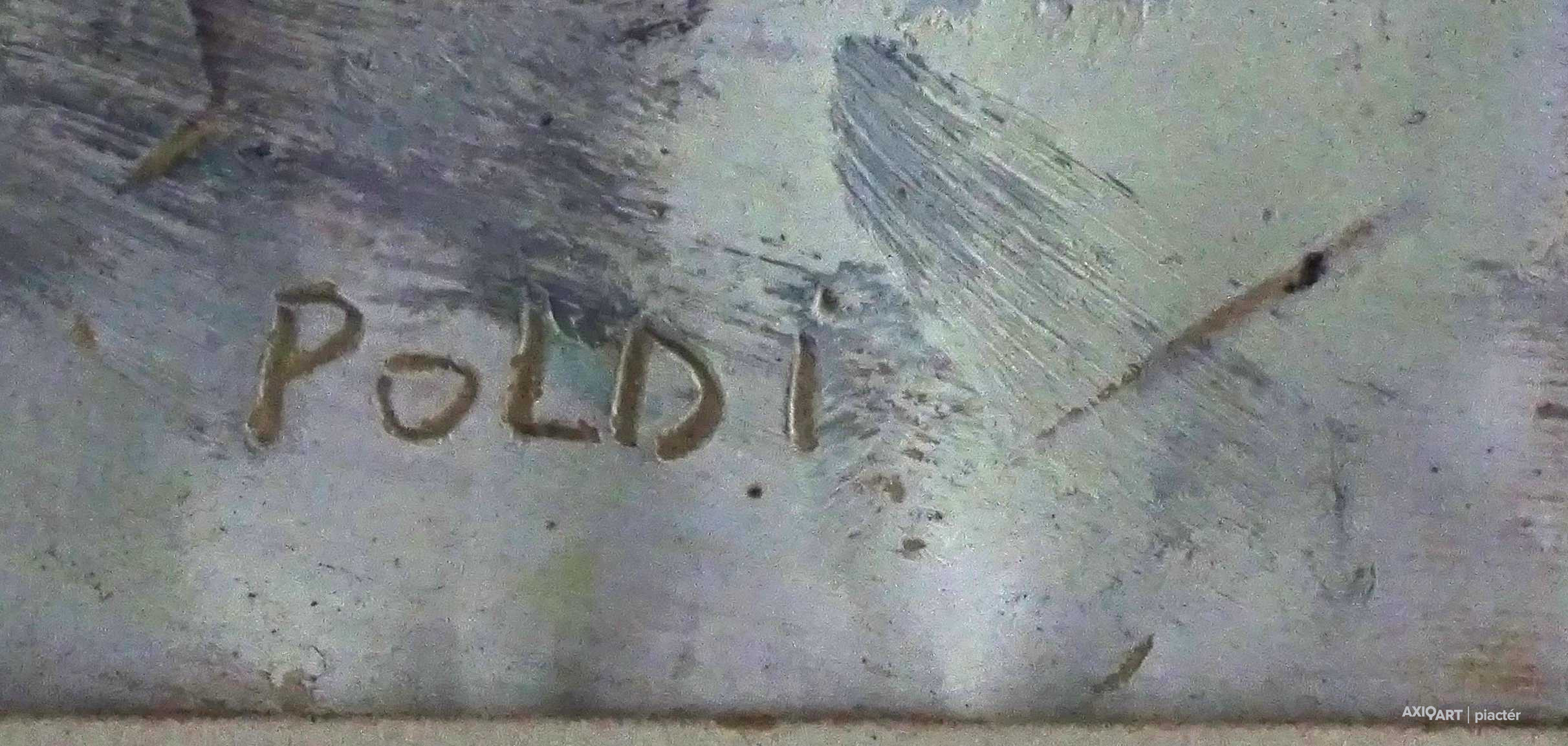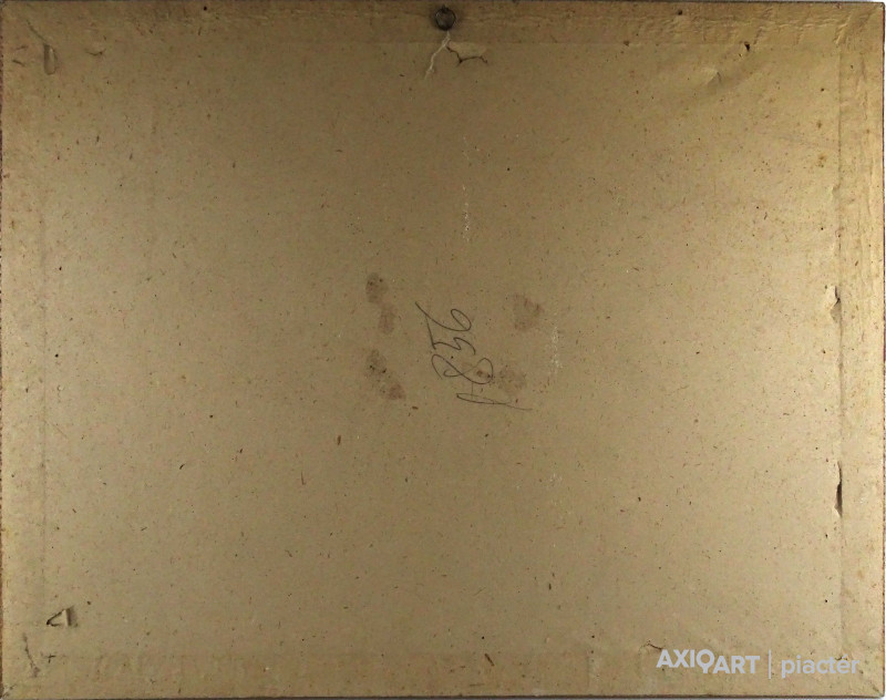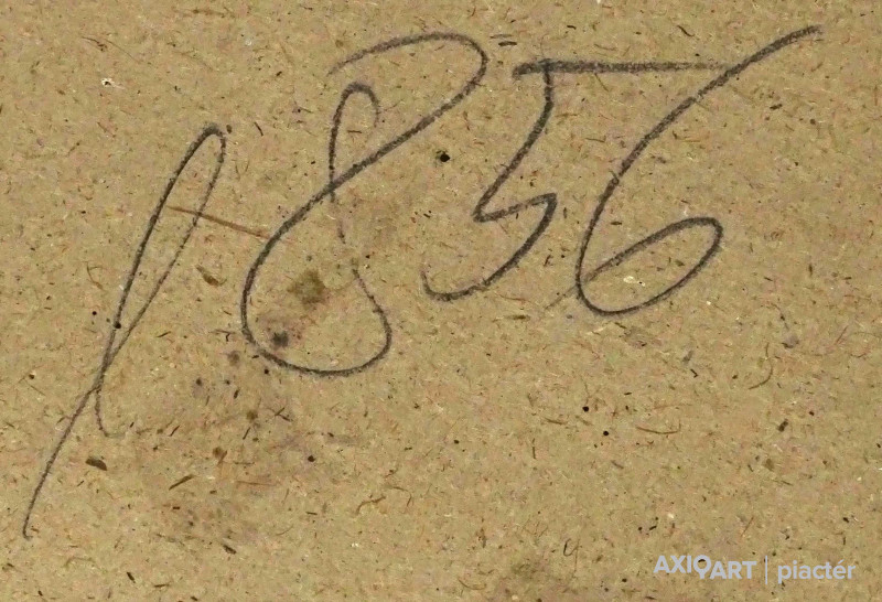 [1Z260/132] Olaj papír festmény, paszpartuzva, üveglap mögött, aranyozott keretben. A kereten néhány apró kopás látható. Jelezve jobbra lent: POLDI Magasság: 53.5 cm Szélesség: 67.5 cm Súly: 2.26 kg Böhm Lipót festő Budapest, 1916-02-28 Névváltozat: Poldi, Dávid Ferenc Szerző: Ladányi József 1941-1946: Magyar Képzőművészeti Főiskola, Szőnyi István tanítványa, majd tanársegédje volt. 1946-1948 között a római Magyar Akadémia ösztöndíjában részesült. Ebben az időben Bécsben és Olaszországban tartózkodott, Dávid Ferenc néven állított ki. Az 1960-as években Olaszországban és Franciaországban járt tanulmányúton. Főiskolás kora óta szerepeltek kiállításon alkotásai. Művészetét mindvégig a kompozíciók konstruktív, szerkesztett megformálása jellemezte. Gazdag koloritú figurális művek, portrék után a 80-as években geometrikus-absztrakt képeket festett. A táblaképek mellett monumentális kompozícók foglalkoztatták, mozaik- és freskóterveket készített. Kisplasztikákat is alkotott. Irodalom FRANK J.: ~nál, Élet és Irodalom, 1970. május 16. B. N. E.: Poldi, Élet és Irodalom, 1981. szeptember 27. Egyéni kiállítások Egyéni kiállítások 1970 • Aba Novák Terem, Szolnok 1973 • Fészek Klub, Budapest 1978 • Kisfaludi Strobl Terem, Zalaegerszeg 1991 • Csontváry Terem, Pécs Válogatott csoportos kiállítások Válogatott csoportos kiállítások 1946 • Fiatal magyar képzőművészek, Fővárosi Képtár, Budapest 1948 • Circo Ariosto, Róma • Kortárs Magyar Festészeti és Szobrászati kiállítás, Catania 1957 • Tavaszi Tárlat, Műcsarnok, Budapest 1971 • Új Művek, Műcsarnok, Budapest 1975 • Jubileumi Képzőművészeti kiállítás, Műcsarnok, Budapest 1977 • Festészet ’77, Műcsarnok, Budapest 1984 • Országos Képzőművészeti Kiállítás ’84, Műcsarnok, Budapest 1988 • Tavaszi Tárlat, Magyar Képzőművészek és Iparművészek Szövetsége, Műcsarnok, Budapest. Művek közgyűjteményekben Művek közgyűjteményekben Magyar Nemzeti Galéria, Budapest Forrás: artportal