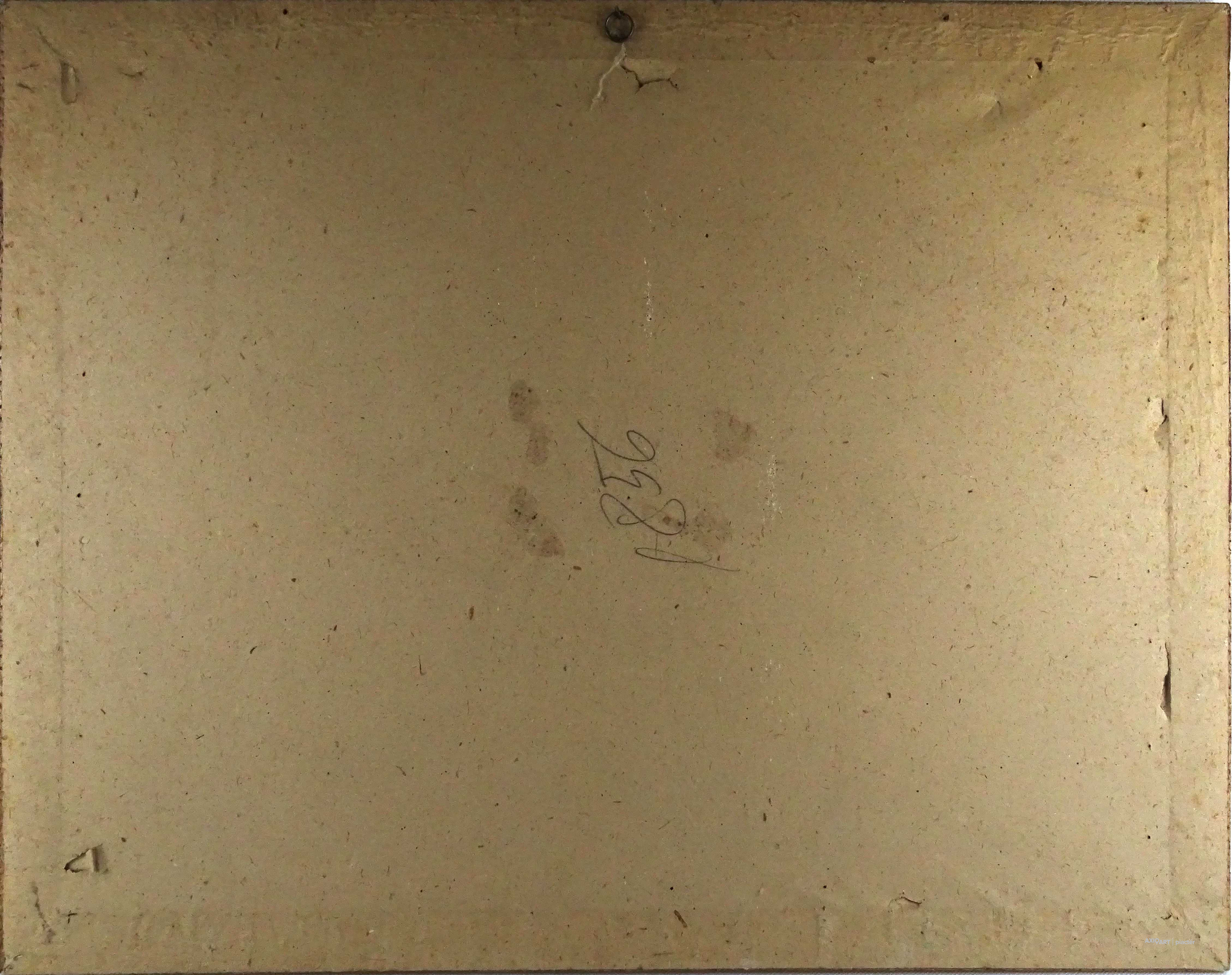 Olaj papír festmény, paszpartuzva, üveglap mögött, aranyozott keretben. A kereten néhány apró kopás látható.