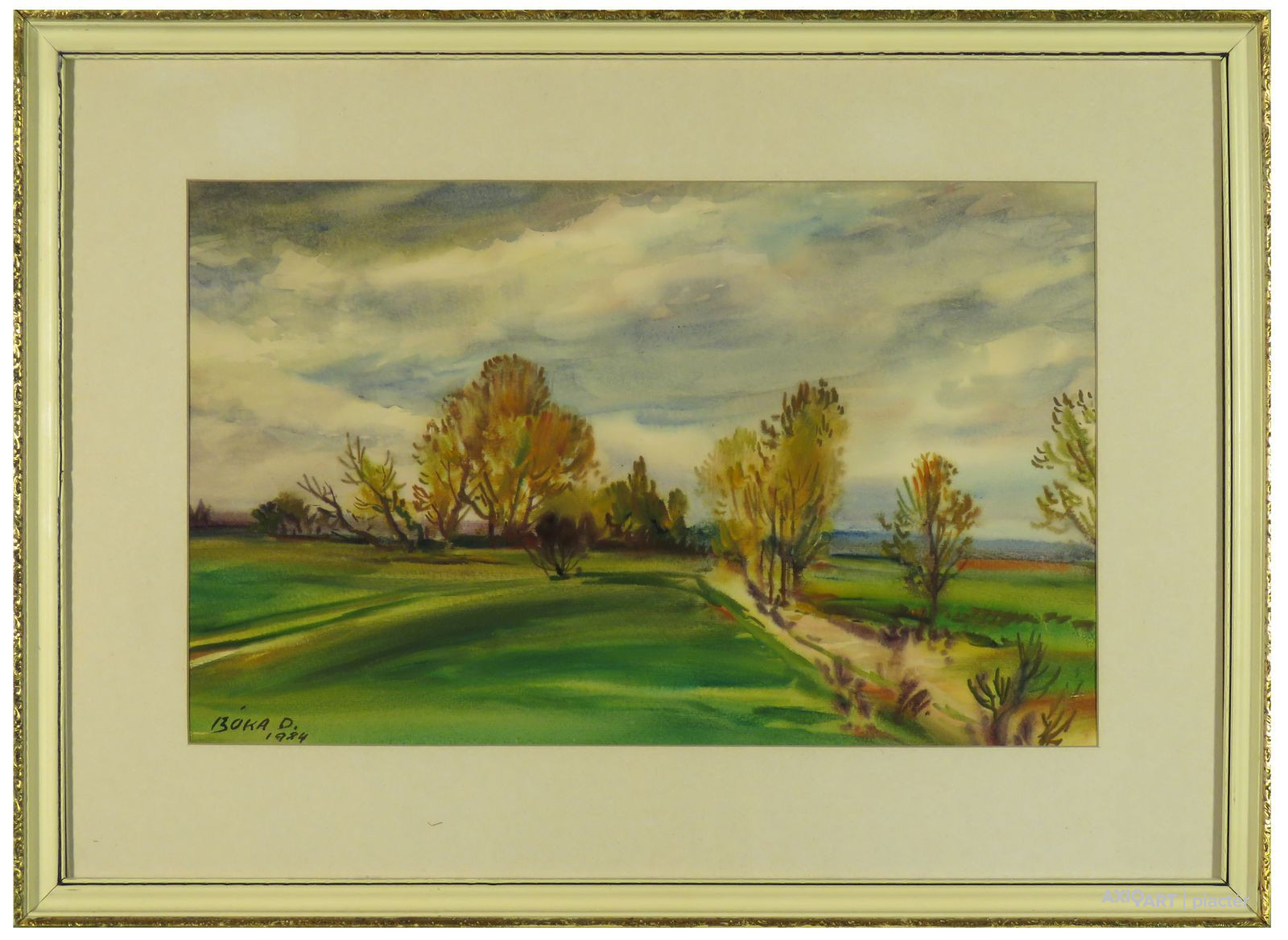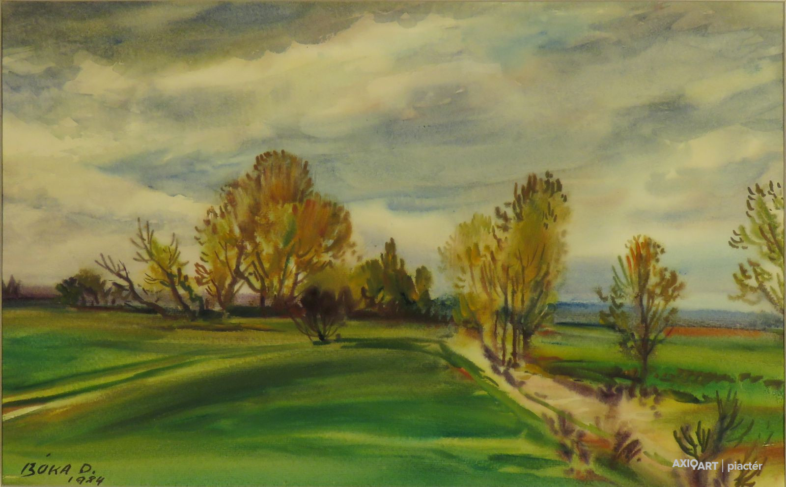 [FKB763/Bp2/52] A kép mérete: 35 x 55 cm keret nélkül. Készült: Akvarell, Papír A kép Bóka Dezső (Balatonendréd, 1935) alkotása. Jelezve balra lent "Bóka D. 1984" A festmény jó állapotban van. Keret: Ép A festmény hátoldalán a Képcsarnok Vállalat raglapja található. Magyar festők és grafikusok életrajzi lexikona I-II. Festő és grafikus. A budapesti Képzőművészeti Főiskolán Molnár József, Pór Bertalan, Ék Sándor és Barcsay Jenő voltak a tanárai. A tájkép és az akvarell vonzza leginkább. Témája a különböző évszakok köntösébe öltöztetett táj, a néptelen somogyi falvak részletei. Technikai könnyedség és egységes szemlélet jellemzi a poszt-nagybányai és alföldi festészet széles tárházából kiszűrt képi világát. Kapolyon él és alkot. Rézkarccal is foglalkozik. Hazai tárlatokon 1968 óta szerepel. Első kiállítása a budapesti Művelődési Házban volt. (KF, MFGA) Magyar festők és grafikusok adattára A Képzőművészeti Főiskolán 1959-ben fejezet be tanulmányait, ahol Molnár József, Pór Bertalan, Ék Sándor és Barcsay Jenő voltak a mesterei. Rajzoló, mégis a festészet vonzása miatt visszatért a festői pályára. Tájkép vonzza leginkább és az akvarelltechnika. Rézkarccal is foglalkozik. Első kiállítása 1968-ban a Budapesti Művelődési Házban volt. - ÖLK Magyar festők és grafikusok életrajzi lexikona I-II. Műgyűjtők és kereskedők kézikönyve Festő és grafikus. A bp.-i Képzőművészeti Főiskolán Molnár József, Pór Bertalan, Ék Sándor és Barcsay Jenő voltak a tanárai. A tájkép és az akvarell vonzza leginkább. Rézkarccal is foglalkozik. Hazai kiállításokon 1968 óta szerepel. Első kiállítása a bp.-i Művelődési Házban volt. (MFGA) Művész életrajzok kortárs magyar képzőművészek 1959-ben fejezte be főiskolai tanulmányait, mestere Pór Bertalan és Ék Sándor volt. Csoportos kiállítások mellett 1979-ben Kaposvárott, 1983-ban a Paál László Teremben jelentkezett önálló kollekciókkal. - Friss hangú, érzékeny akvarellista, a tolnai és a somogyi táj szépségeinek ábrázolója.