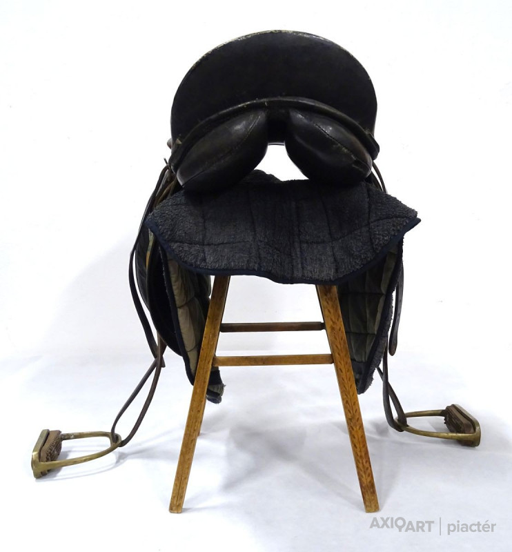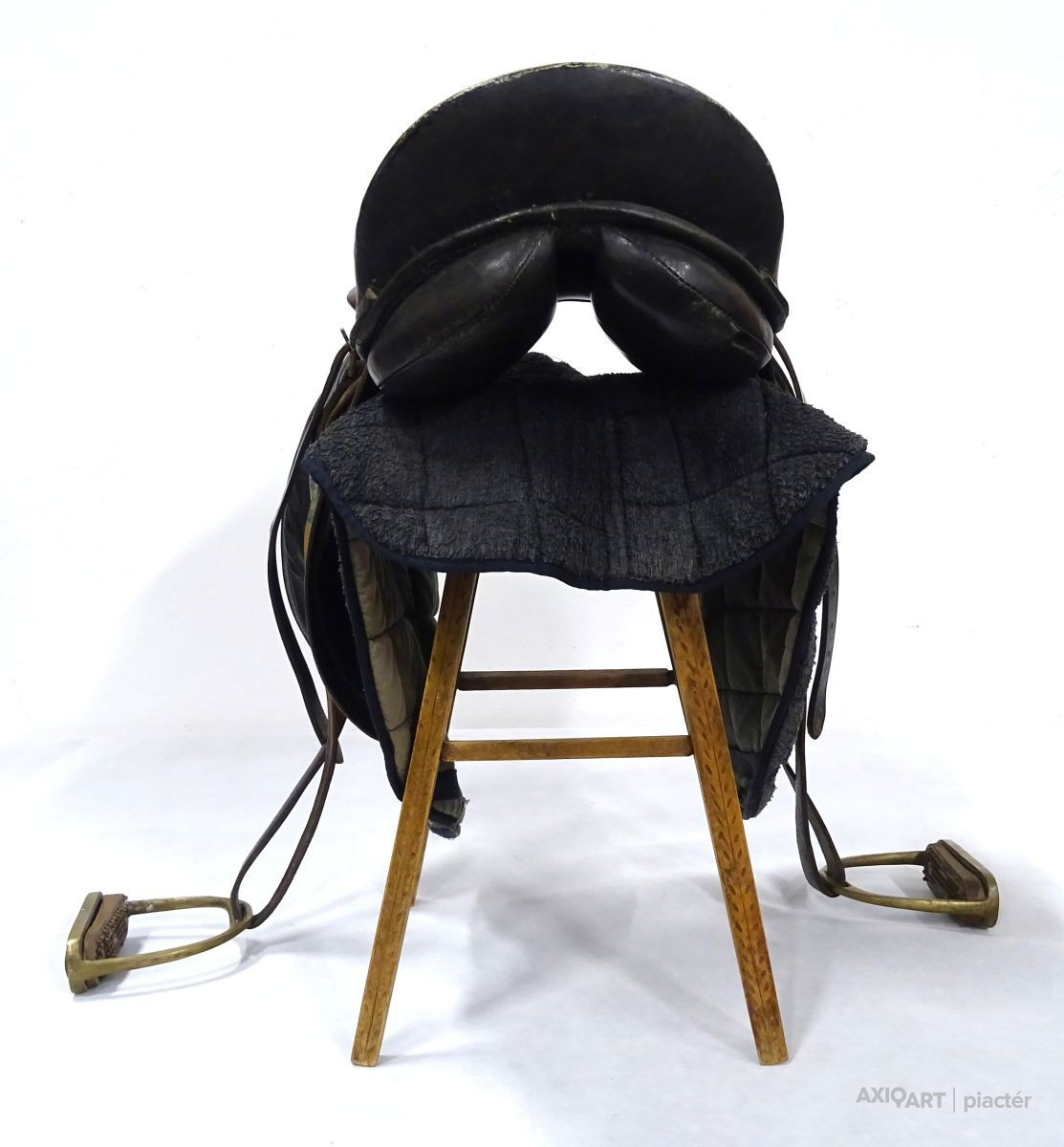 [1F528/KCS] Szép állapotú bőr nyereg alátéttel, réz kengyellel. A réz kengyelben jelzett gumi csúszásgátló betét található. A nyerget tartó szék nem képezi az eladás tárgyát.