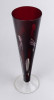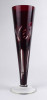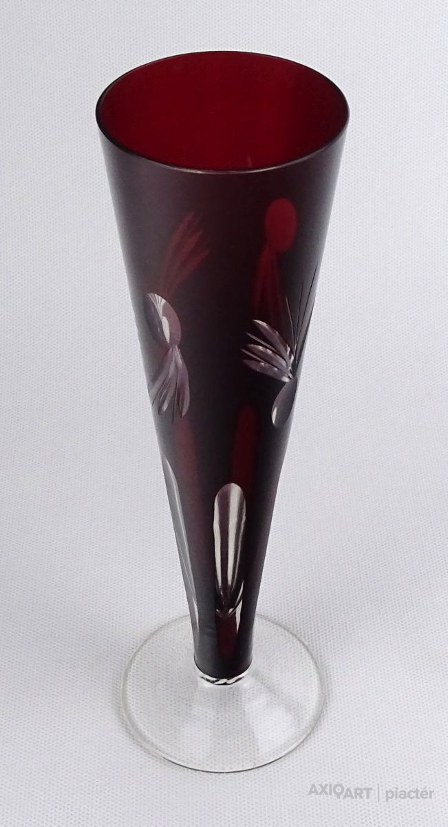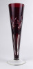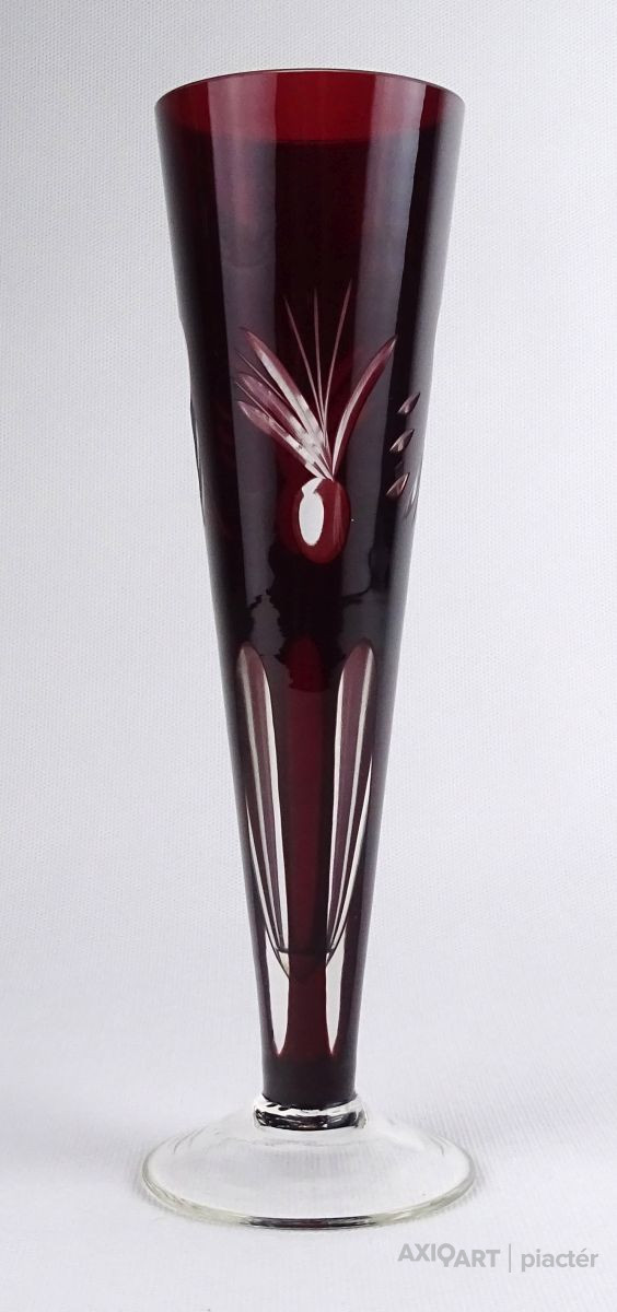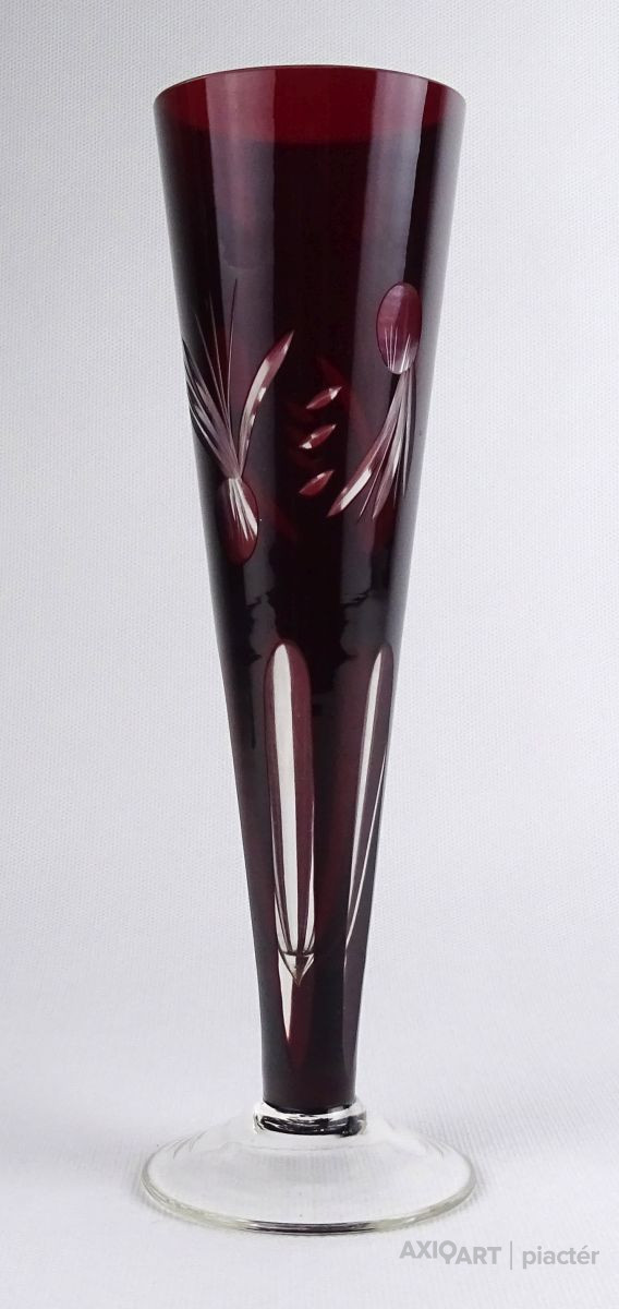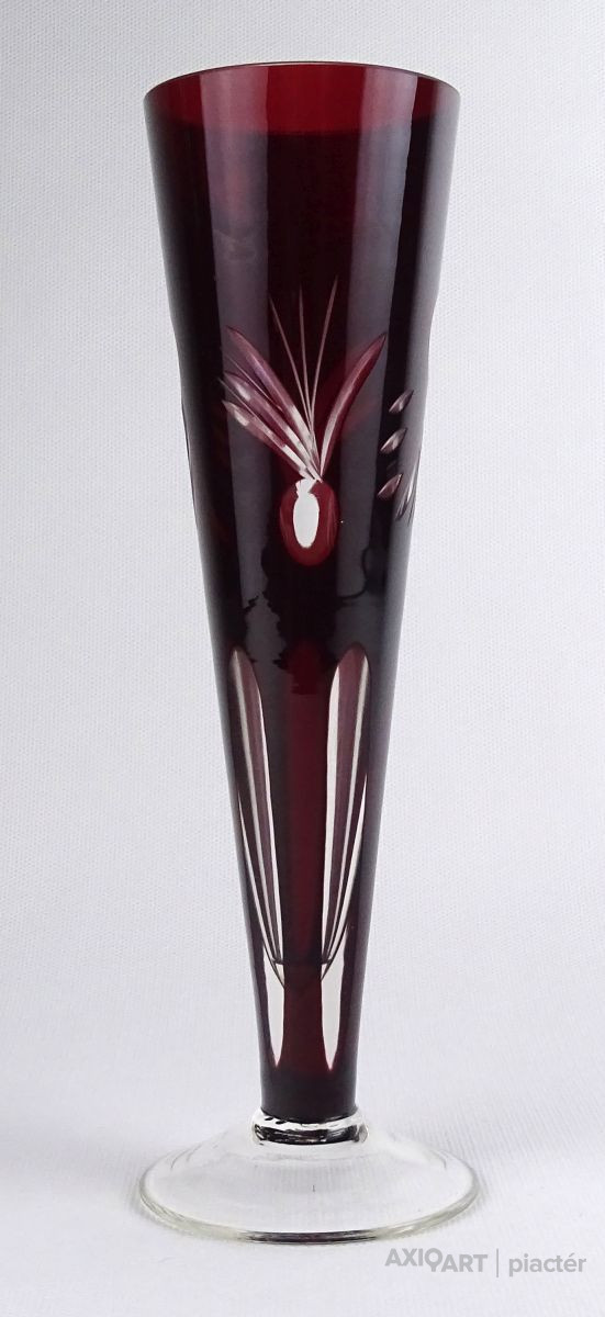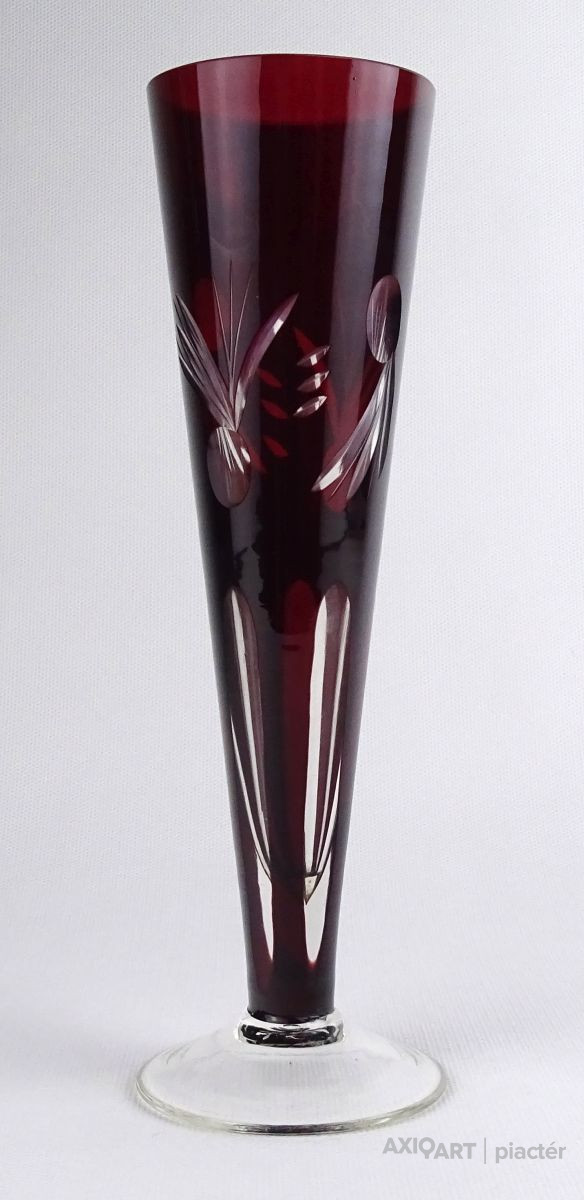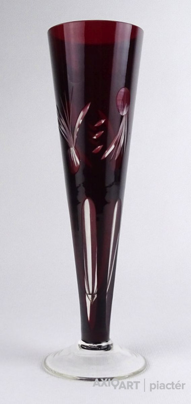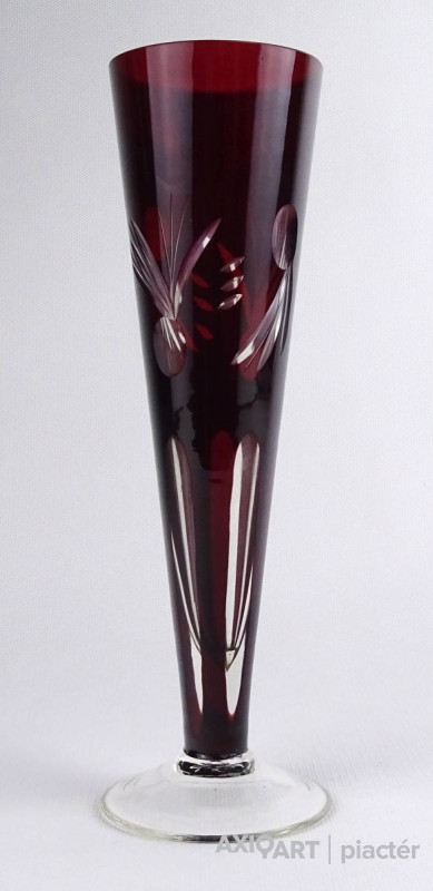 [1R190/X228] Régi, hibátlan állapotú, csiszolatokkal gazdagon díszített, anyagában bordóra színezett, talpas kristály váza, díszváza. Magasság: 23 cm Szélesség: 7.2 cm Súly: 0.205 kg