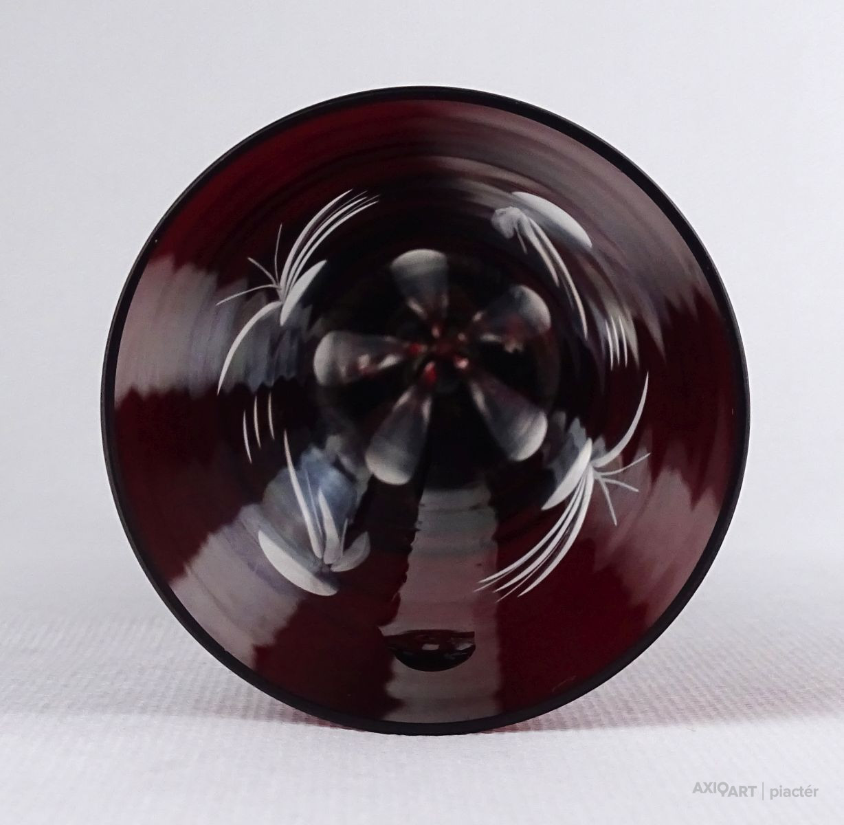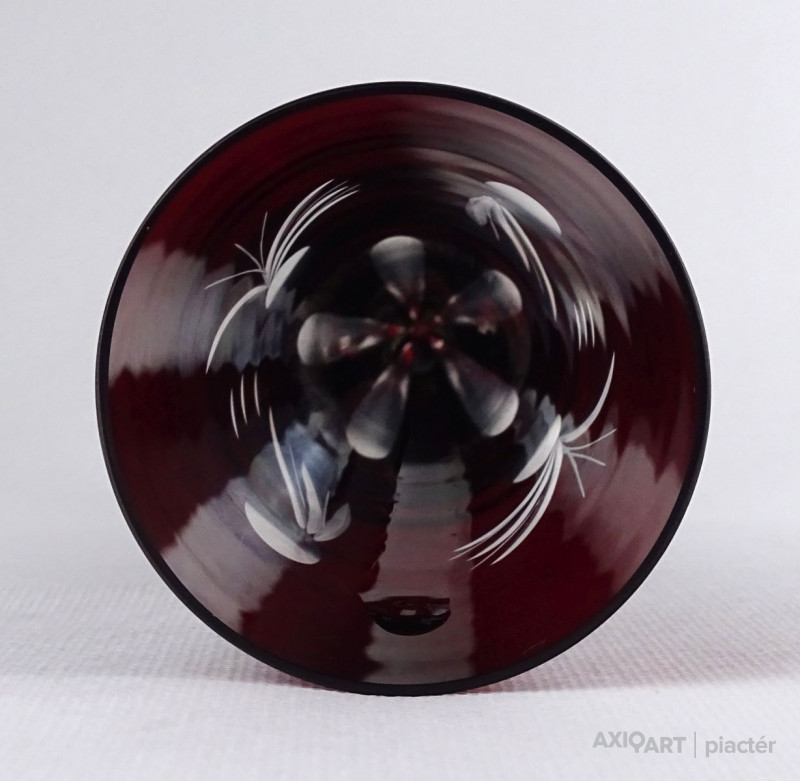 Régi, hibátlan állapotú, csiszolatokkal gazdagon díszített, anyagában bordóra színezett, talpas kristály váza, díszváza.