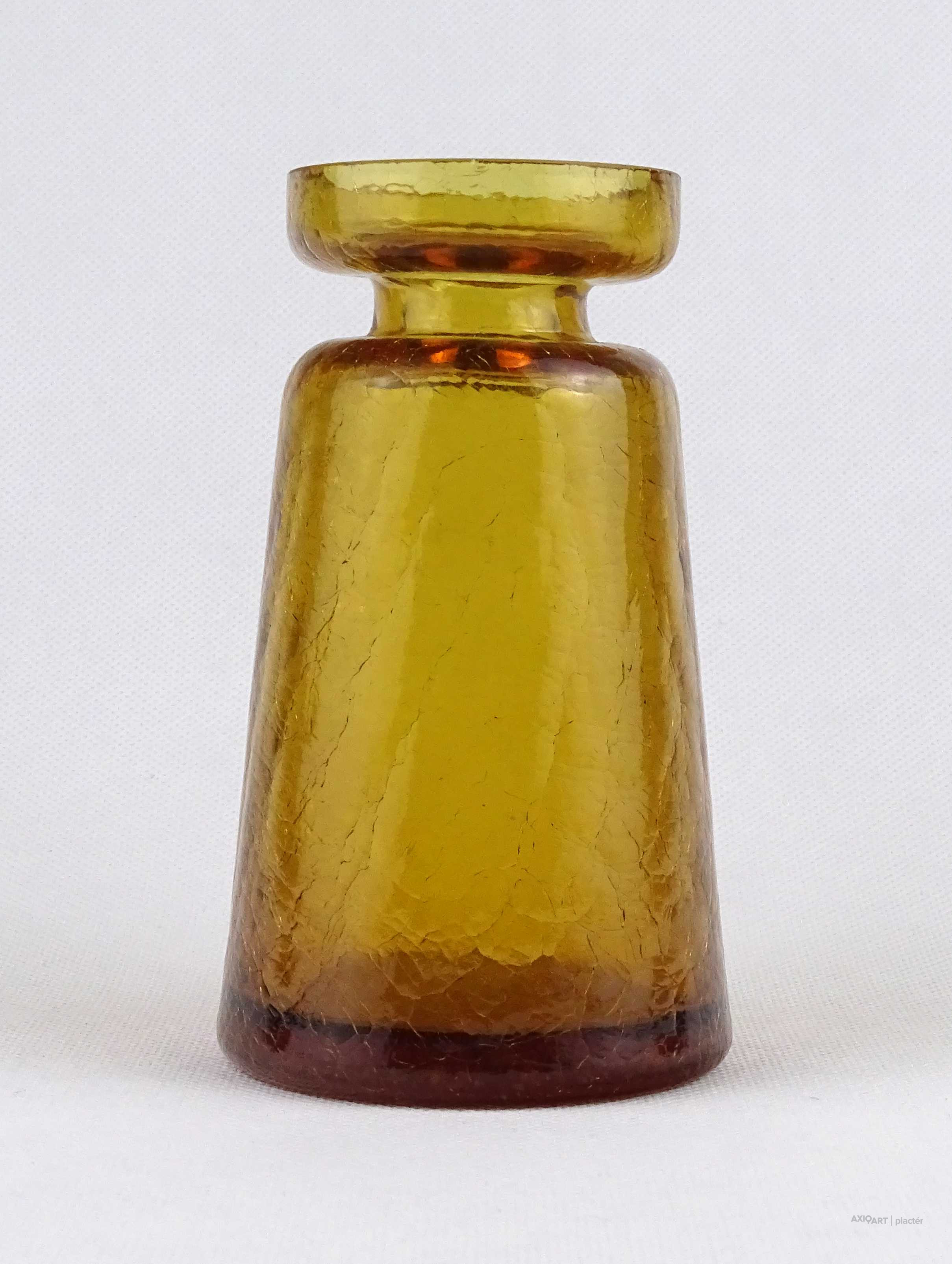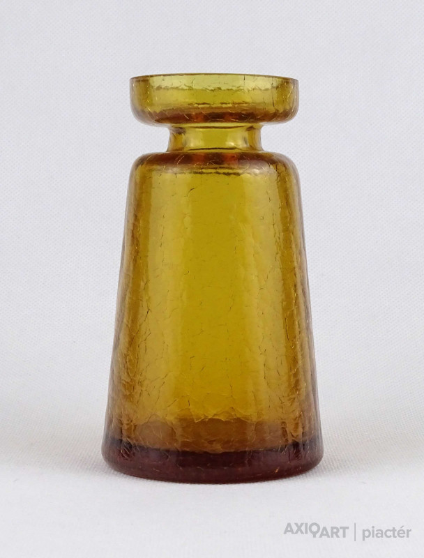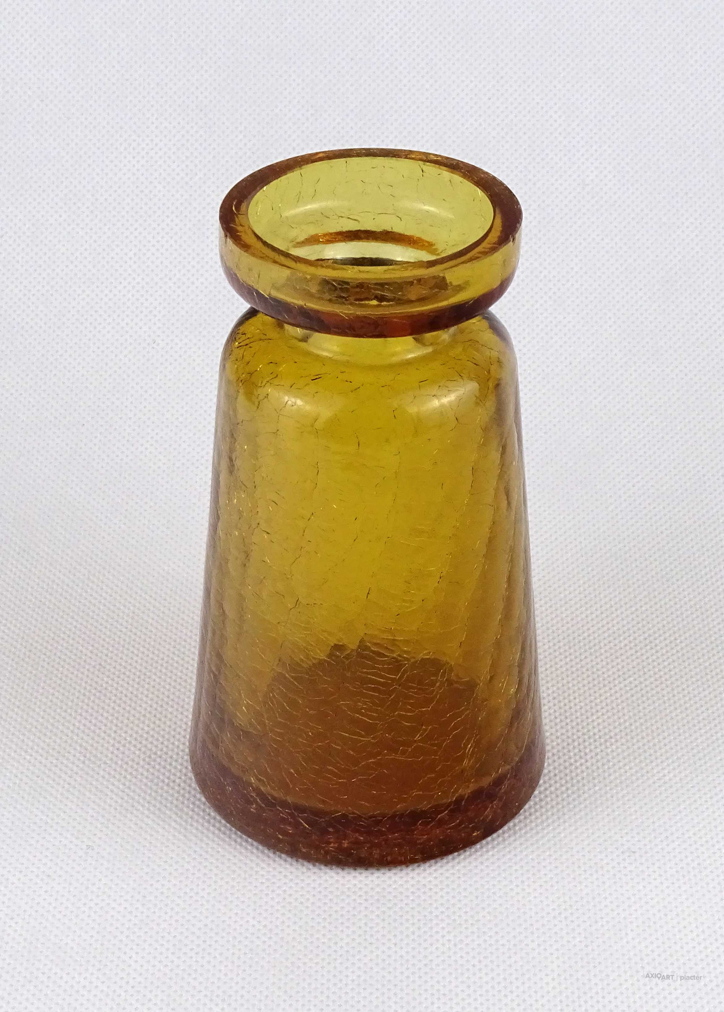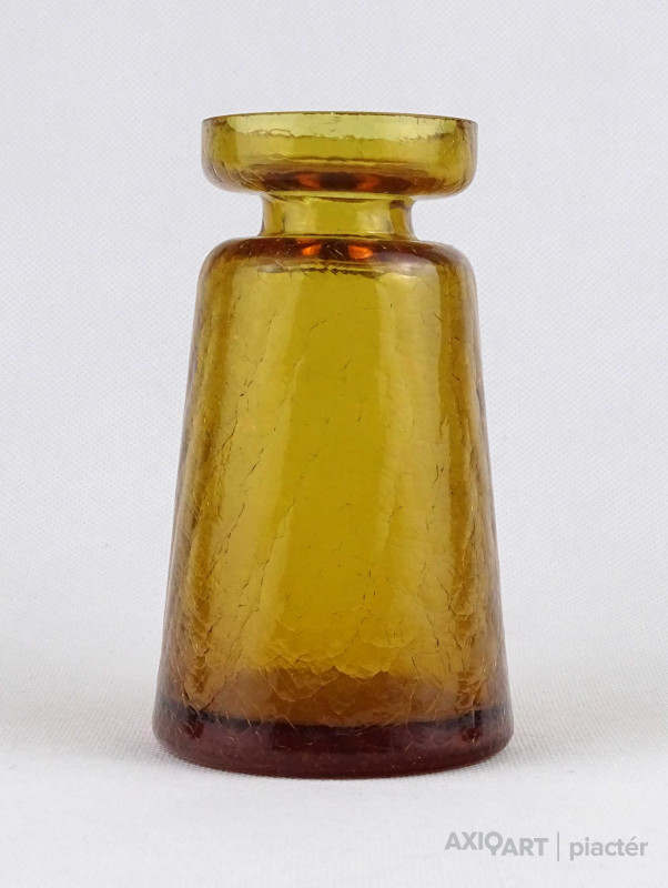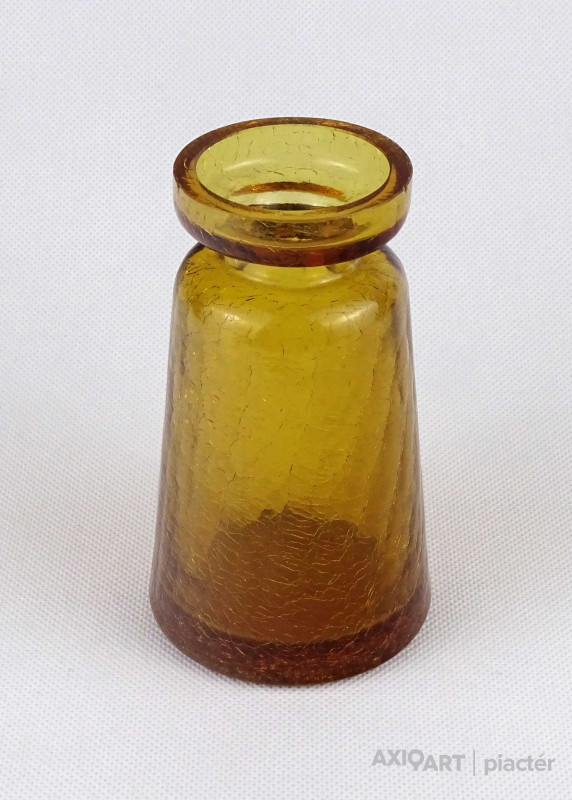 Régi, kis méretű, borostyán sárga színű, vastag falú fújt üveg design váza. Felülete repesztett, erezett mintázatú.