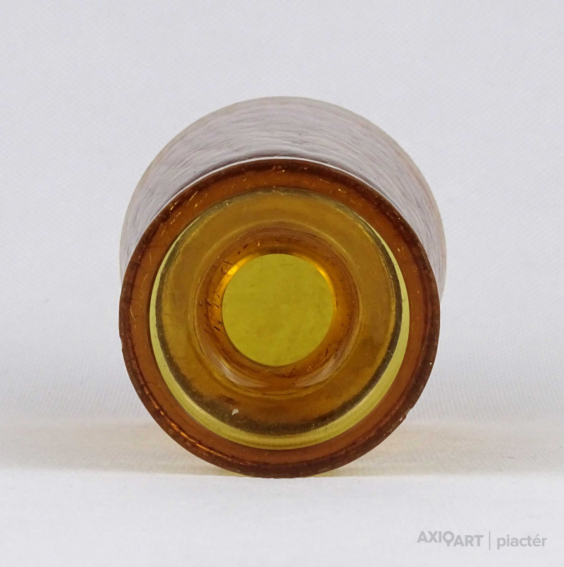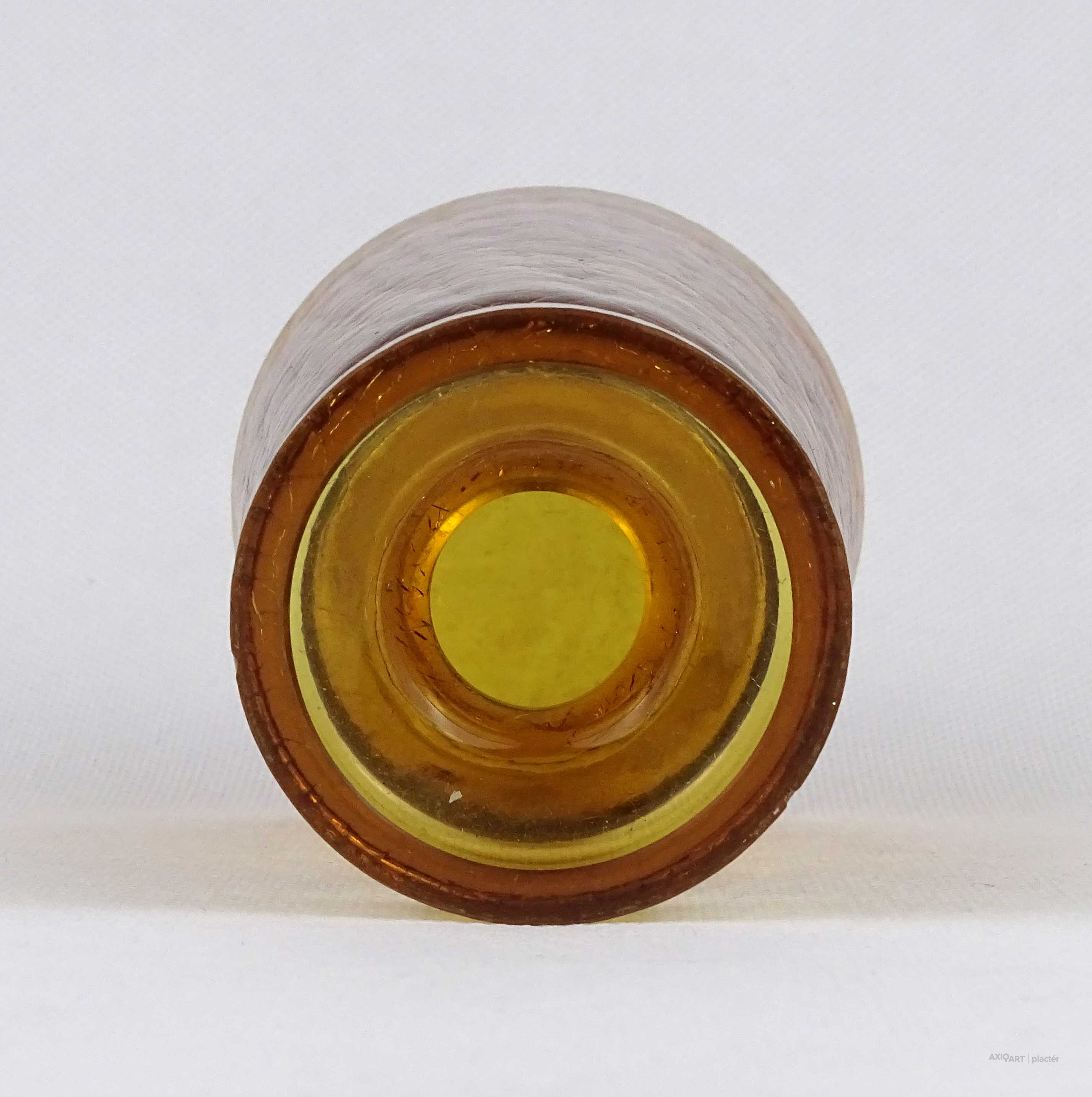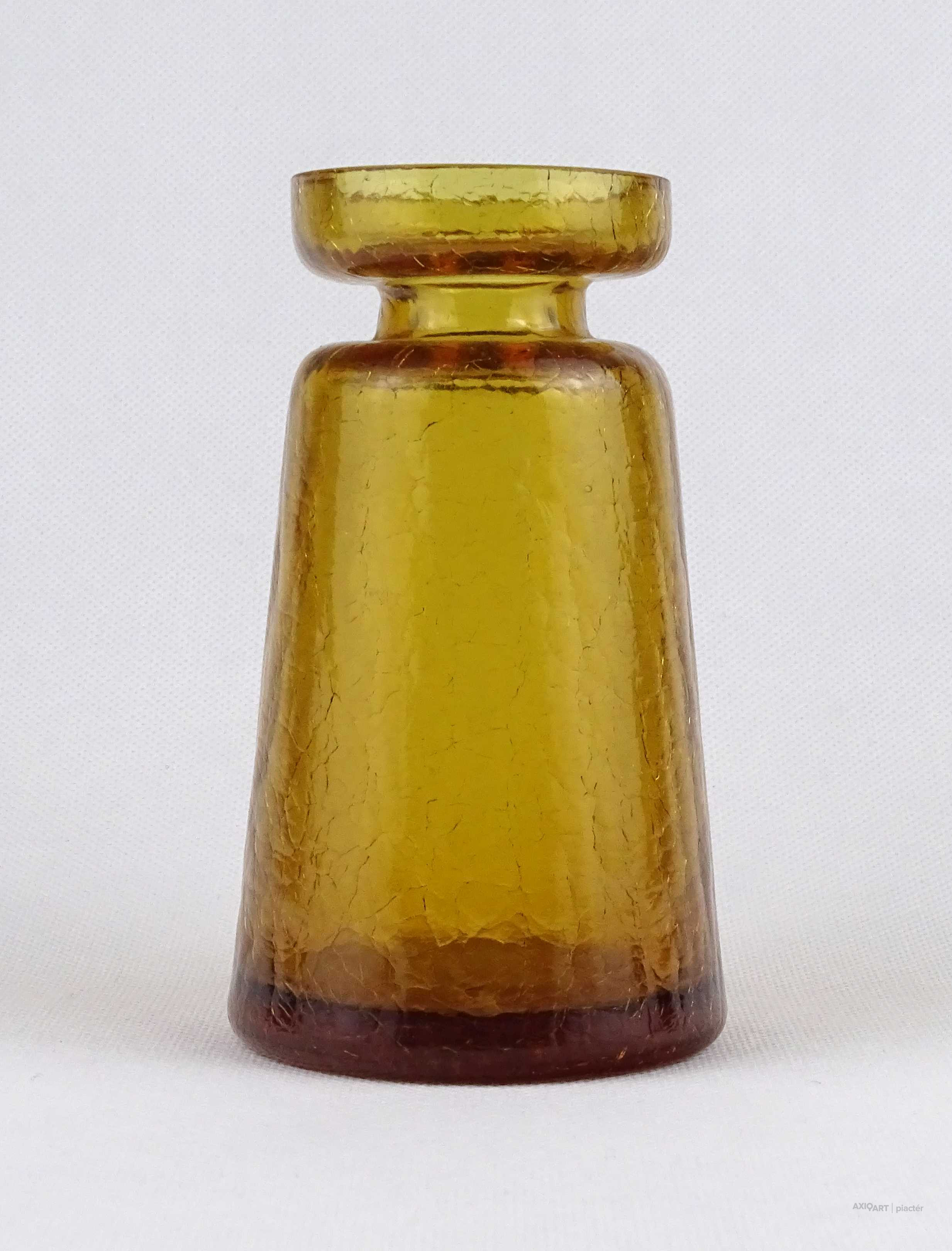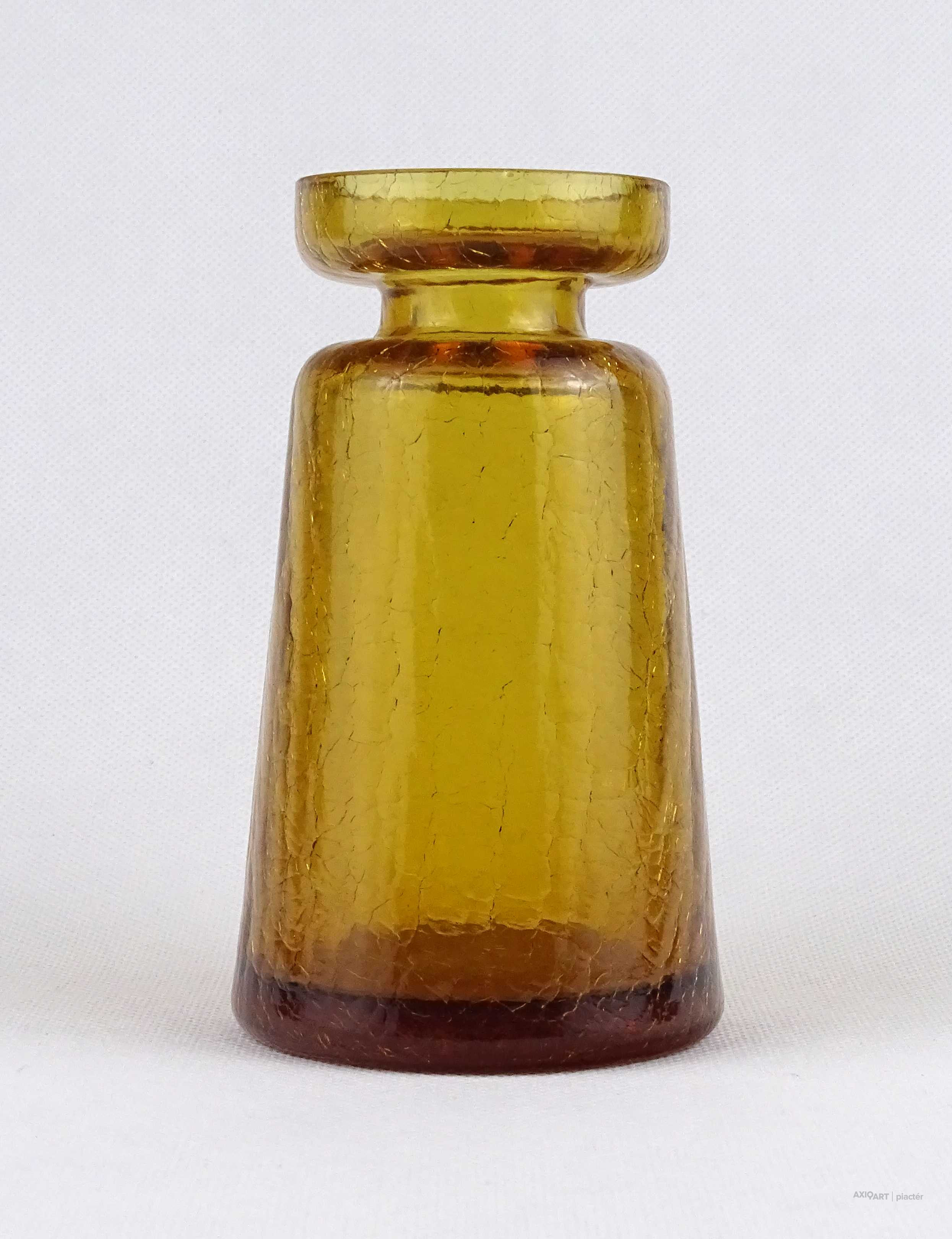 Régi, kis méretű, borostyán sárga színű, vastag falú fújt üveg design váza. Felülete repesztett, erezett mintázatú.
