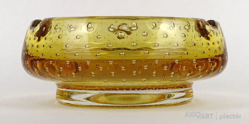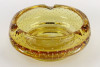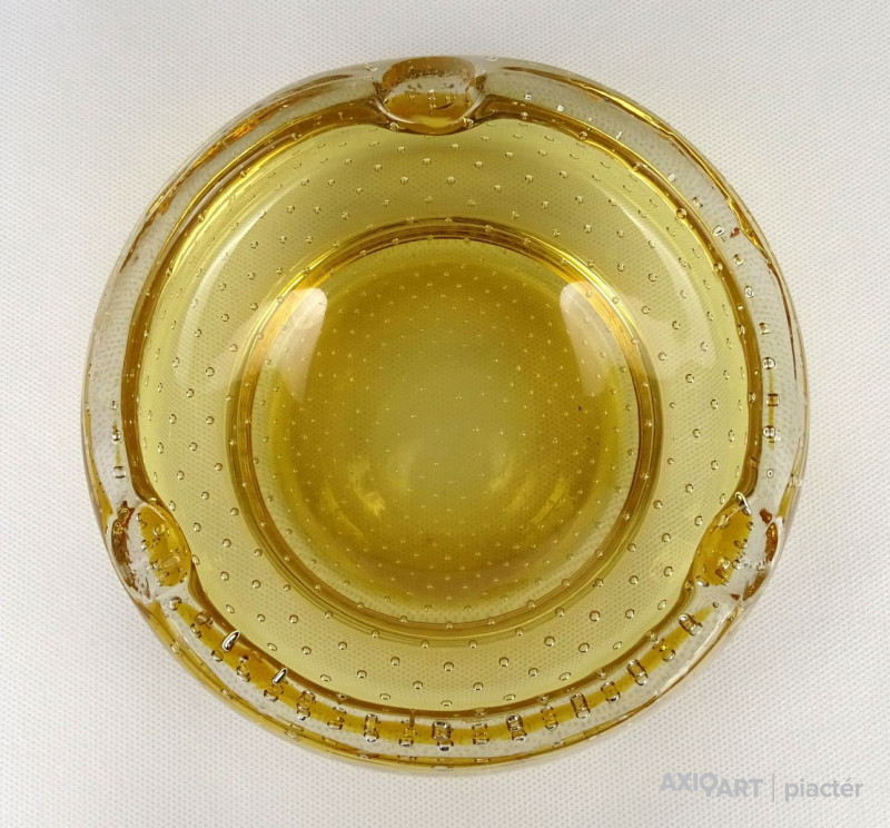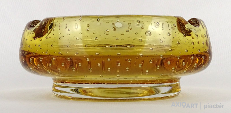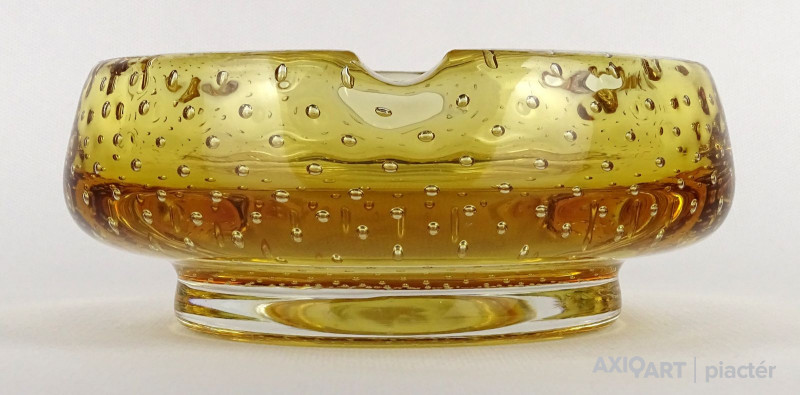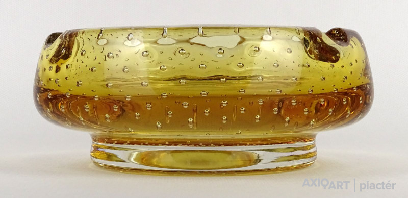 Hibátlan állapotú, borostyánsárgára színezett, levegőbuborékos művészi üveg, cseh fújt üveg hamutál a XX. század második feléből. Alján a fúvás, szakítás kicsiszolt nyoma szépen látható.