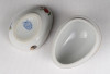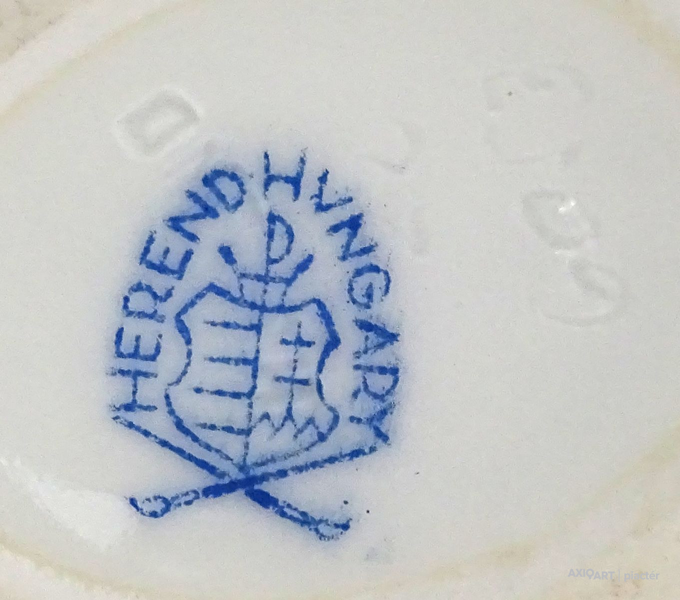 [1S042/Z035] Szép állapotú, gyümölcs mintás, tojás alakú, Herendi porcelán bonbonier. Alján kék Herendi jelzés: HEREND HUNGARY Mélynyomással: HEREND Formaszám: 6053 Díszítő motívum: BFR (Bouquet de Fruits) Magasság: 5 cm Szélesség: 5.5 cm Hosszúság: 7.2 cm Súly: 0.09 kg