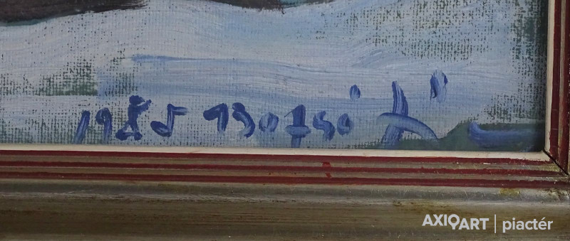 [FK2668/Bp301/4] A kép mérete: 50,5 x 80,5 cm keret nélkül. Készült: Olaj, Vászon A kép Moldován István (Kolozsvár, 1911) alkotása. Jelezve Jobbra lent "Moldován István" A festmény jó állapotban van. Keret: Ép A festmény hátoldalán a Képcsarnokvállalat raglapja láltható. Magyar festők és grafikusok életrajzi lexikona I-II. Festő. Tanulmányait Kolozsvárott, a Szépművészeti Főiskolán kezdte 1930-ban. A következő esztendőben a nagybányai Szépművészeti Iskolában Thorma János és Krizsán János korrektúráján képezte magát. 1931-ben a budapesti Képzőművészeti Főiskola hallgatója lett. Réti István, később Szőnyi István volt a mestere. Már mint főiskolás sok díjat és kitüntetést nyert. 1948-ban megkapta a római ösztöndíjat, de lemondva róla, Erdélybe ment. 1948-1950 között Erdélyben élt, és népművészetben gazdag vidékein festett. 1943-ban Kolozsvárott, 1946-ban Gyöngyösön, 1955-ben, 1959-ben és 1962-ben a Kulturális Kapcsolatok Intézetében, illetve a Csók Galériában rendezett egyéni bemutatókat. Ezen kívül több Európai országban, az USA-ban, Kanadában és Indiában is bemutatta munkáit. Eleinte sajátos atmoszférájú, lírai tájképeket, eleven színvilágú képmásokat festett, később mondernebb, erőteljesebben szerkesztett művekkel jelentkezett. A Pécsi Tanárképző Főiskola számára mozaikot készített. Erdély szerelmese volt. A székely népművészet gazdag formavilágának hatása döntő jelentőségűvé vált sokoldalú művészetében. Műv. díjak: a Szinyei Társaság elismerő oklevele, a Főváros festészeti-díja, "Kolozsvár a képzőművészetben" II. díj, állami ösztöndíj, római ösztöndíj, a Képzőművészek Szövetsége Észak-Magyarországi festészeti díja, SZOT festészeti díj. Több murális művet (mozaik) alkotott. A Magyar Nemzeti Galéria több alkotását őrzi. (M. L.: Műv. 1967/6, RI-NM) Magyar festők és grafikusok életrajzi lexikona I-II. Műgyűjtők és kereskedők kézikönyve Festő. Tanulmányait a kolozsvári Szépművészeti Főiskolán kezdte 1930-ban. A nagybányai szabadiskolában is megfordult. Itt Thorma János és Krizsán János korrektúráján képezte magát. 1931-ben Budapesten a Képzőművészeti Főiskola hallgatója lett. Réti István, később Szőnyi István volt a mestere. Már mint főiskolás sok díjat nyert. 1948-ban megkapta a római ösztöndíjat, de lemondva róla, Erdélybe ment. 1948-1950 k. Erdélyben élt, és népművészetben gazdag vidékein festett. 1943-ban Kolozsváron, 1946-ban Gyöngyösön, 1955-ben, 1959-ben és 1962-ben a Kulturális Kapcsolatok Intézetében, illetve a Csók Galériában rendezett önálló kiállítást. Ezen kívül több Európai országban, az USA-ban, Kanadában és Indiában is bemutatta műveit. Eleinte sajátos atmoszférájú, lírai tájképeket, eleven színvilágú képmásokat festett, később mondernebb, erőteljesebben szerkesztett művekkel jelentkezett. A Pécsi Tanárképző Főiskola számára mozaikot készített. Erdély szerelmese volt. A székely népművészet gazdag formavilágának hatása döntő jelentőségűvé vált sokoldalú művészetében. 1942-ben megkapta a Szinyei Társaság elismerését, és a Főváros festészeti-díjat,1943-ban elnyerte a "Kolozsvár a képzőművészetben" c. díjat. 1947-ben állami ösztöndíjat,1948-ban a római ösztöndíjat, 1972-ben a Képzőművészek Szövetsége Észak-Magyarországi festészeti díját kapta meg. A MNG több művét őrzi. (M. L.: Műv.-1976/6) Magyar festők és grafikusok adattára Tanulmányait Kolozsvárott a Képzőművészeti Főiskolán, majd Nagybányán Thorma János és Krizsán János irányítása mellett kezdte, 1931-től Budapesten megszakításokkal a Képzőművészeti Főiskolán Réti István és Szőnyi István növendékeként fejezte be. 1949-ben és 1950-ben ösztöndíjjal dolgozott Erdélyben, majd hosszú tanulmányutakra indult Nyugat-Európába, az Egyesült Államokba, s a Szovjetunióba. Először Kolozsvárott lépett a nyilvánosság elé 1943-ban, majd 1946-ban Egerben és Gyöngyösön, 1947-ben Miskolcon, 1948-ban Hatvanban, 1955, 1961 és 1981-ben a Csók Galériában, 1959-ben a KKI-ben, 1960-ban Nagykanizsán, 1963-ban Kiskunfélegyházán, 1966-ban Debrecenben, 1969 és 1975-ben Békéscsabán, 1971-ben a Mednyánszky Teremben, 1973-ban Gyöngyösön és Debrecenben, 1977-ben Egerben, 1979-ben Veszprémben, 1983-ban Miskolcon, 1984-ben Csepelen, 1986-ban a Vigadó Galériában rendezett önálló kiállítást. Külföldi kiállításai: Moszkva, Varsó, India, Szófia, Párizs, Bukarest, Belgrád, New York, Montreál és Toronto. Eddig közel kétezer színes táblaképet festett, de szívesen foglalkozik mozaikkészítéssel is. 1964-ben a Pécsi Pedagógiai Főiskola, 1968-ban a Salgótarjáni Kórház, 1969-ben a názáreti templom és 1970-ben a Videoton Vállalat díszterme részére mozaikot készített. - Erdély szerelmese. A székely népművészet gazdag formavilágának hatása döntő jelentőségűvé vált festészetében. Olyan formanyelvet alakított ki magának, amely színvilágában és summázó formaalakításában sajátos erdélyi zamat érződik, ugyanakkor korszerűen modern is konstruktivista stílusa. Munkásságát 1942-ben a Szinyei Társaság elismerésével és a Fővárosi festészeti-díjjal, 1943-ben Római-ösztöndíjjal, 1947-ben Állam ösztöndíjjal (Románai), 1963-ben a SZOT festészeti-díjával, 1972-ben a Képzőművészek Szövetsége Észak-Magyarországi festészeti-díjával tüntették ki. - Irod.: Bíró Béla: Kolozsváry Moldován István. Erdélyi Helikon, 1943.; Felvinczi Takács Zoltán: Kolozsváry Moldován István. Kolozsvár, 1943.; Dutka Mária: Magyar Nemzet, 1961.; Maksay László: Moldován István. Művészet, 1965.; D. Fehér Zsuzsa. Moldován István, Bp. 1971.; Theisler G
