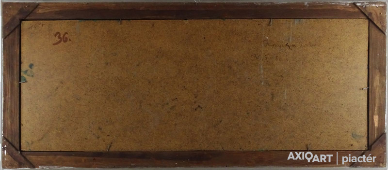 [FK3264/FL-4] A kép mérete: 31,5 x 70,5 cm keret nélkül. Készült: Olaj, tempera, Farostlemez A kép Kurucz D. István (Hódmezővásárhely, 1914, Budapest, 1996) alkotása. Jelezve Jobbra lent "Kurucz 977" A festmény jó állapotban van. Keret: Ép A festmény hátoldalán a Képcsarnokvállalat raglapja látható. Magyar festők és grafikusok életrajzi lexikona I-II. Festő, grafikus. Vásárhelyről, ahol Darvasy István festőművész figyelt fel tehetségére, került Szőnyi István magániskolájába. A fővárosi Képzőművészeti Főiskolának, ahol Rudnay Gyula, Réti István, Benkhard Ágost, Szőnyi István voltak a tanítómesterei 1940-ig volt a tanítványa. A monumentális festészetet Nagy Sándor tanította. Tanulmányúton járt több kelet- és nyugat-európai államban, Mongóliában, Japánban, Algériában. 1940-ben Hódmezővásárhelyen telepedett le, 1943-1947 között bekapcsolódott szülővárosa művészeti és közéletébe. A Vásárhely Népe c. lap munkatársa volt. 1949-59 között Szőnyi tanársegédjeként freskótechnikát tanított a főiskolán. 1951-52-ben megszervezte a Honvédségi Képzőművészeti Stúdiót, majd kinevezték a Honvéd Képzőművészeti Iskola igazgatójának. A vásárhelyi iskola reprezentáns egyéniségeként jelentős szerepe volt a Vásárhelyi Őszi Tárlatok elindításában. Megszervezete és vezette a Mednyánszky Társaságot, s haláláig művészeti vezetője volt a Hajdúböszörményi Nemzetközi Művésztelepnek. Évekig elnöke volt a Hortobágyi Alkotótábornak. Az alföldi parasztok életét megörökítő képei a falképek összefoglaló stílusában a népi realizmus és a dekoratív sommázás szellemében készültek. Számos falképet festett (Kossuth Akadémia, hódmezővásárhelyi iskola, stb.). 1941-től számos kisebb-nagyobb egyéni kiállítása volt, bemutatkozott több hazai és külhoni városban. 1941-től minden jelentősebb országos rendezvény és a magyar művészek külföldi bemutatóinak résztvevője. Rendszeresen szerepelt a Vásárhelyi Őszi Tárlatokon, a Hatvani Tájkép és Portrébiennálékon, a Szegedi Nyári Tárlatokon. Képei bemutatásra kerültek a vásárhelyi iskola jubileumi rendezvényein. 1962-ben több alkotásával szerepelt a Velencei Biennálén. Díjak: SZOT-díj, Munkácsy-díj, Érdemes és Kiváló Művész kitüntetés, Tornyai-plakett, római ösztöndíj, a Munka Érdemrend arany fokozata, Káplár Miklós-díj és emlékplakett, Kossuth-díj. Művei megtalálhatók minden jelentősebb hazai, több olasz és japán közgyűjteményben. (ML, D.J.: Műv. 1985/5, Tasnádi Attila adatközlése nyomán, L.L.: Műv. 1983/3) Magyar festők és grafikusok életrajzi lexikona I-II. Műgyűjtők és kereskedők kézikönyve Festő, grafikus. Vásárhelyről, ahol Darvasy István festőművész figyelt fel tehetségére, került Szőnyi István magániskolájába. A fővárosi Képzőművészeti Főiskolának, ahol Rudnay Gyula, Réti István, Benkhard Ágost, Szőnyi István voltak a tanítómesterei 1941-ig volt a növendéke. A monumentális festészetet Nagy Sándor tanította. Egy ideig tanársegédként működött Szőnyi mellett. Több ízben járt Itáliában tanulmányúton. Évekig művészeti vezetője volt a Hajdúböszörményi Nemzetközi Művésztelepnek. Az alföldi parasztok életét megörökítő képei a falképek összefoglaló stílusában a népi realizmus és a dekoratív sommázás szellemében készülnek. A II. világháború alatt szerepet vállalt a Szocialista Képzőművészek Csoportjának akcióiban. 1949-1960 k. a Képzőművészeti Főiskola falképtanszékének tanára volt. Több falképet festett (Kossuth Akadémia, hódmezővásárhelyi iskola, stb.). 1962-ben több alkotásával szerepelt a Velencei Biennálén, SZOT-díjas, Munkácsy-díjas, érdemes és kiváló művész kitüntető elismerésében részesült. (ML, D.J.: Műv.-1985/5, L.L: Műv.-1983/3) Magyar festők és grafikusok adattára Tanulmányait a Képzőművészeti Főiskolán végezte, ahol Rudnay Gyula és Réti István voltak a mesterei. 1941-1943-ban ösztöndíjas Rómában. 1943-1947 között Hódmezővásárhelyen dolgozik, egyidejűleg a Vásárhelyi Hétfő c. hetilap szerkesztője. 1949-1960 közötti években a budapesti Képzőművészeti Főiskola freskó tanszékének tanára. Az 1940-es évek eleje óta kiállító művész. 1962-ben a Velencei Biennálén állították ki műveit. 1970-ben Csók István Galériában volt kiállítása. A Vásárhelyi Őszi Tárlatok és a Szegedi Nyári Tárlatok rendszeres kiállító művésze. Az alföldi festészet egyéni hangú továbbfejlesztője. Táblaképeket, freskókat és kerámia falképeket alkot. Munkácsy-díjas, érdemes és kiváló művész kitüntető elismerésében részesült. A SZOT a legelső képzőművészek közt, 1962-ben tüntette ki díjával. A 70. születésnapját ünneplő művész 1984 decemberében életmű kiállítást rendezett műveiből a hódmezővásárhelyi Tornyai János Múzeumban. 1986-ban a budapesti Hollósy Galériában nyílt kiállítása. - Irod.: Szij Rezső: Kurucz Dezső István festőművész. Bp. 1967.; Kulcsár Ödön: SZOT-díjasok. Bp., 1981.; Lóska Lajos: Mindig freskót szerettem volna festeni. Beszélgetés Kurucz Dezső Istvánnal. Művészet, 1984. 3. Művészeti lexikon I-IV. Festő, Munkácsy-díjas. A Képzőművészeti Főiskolán Rudnay Gyula, Réti István, Benkhard Ágost, Szőnyi István növendéke volt 1934-40 között. Több ízben járt külföldi tanulmányúton. Az alföldi parasztok életét megörökítő képei a falképek összefoglaló stílusában a népi realizmus és a dekoratív sommázás szellemében készülnek. 1949-60 között a Képzőművészeti Főiskola falképtanszékének tanára volt. Több falképet festett (Kossuth Akadémia; Hódmezővásárhely, iskola, pápai pártház, 1965). Legutóbb 195