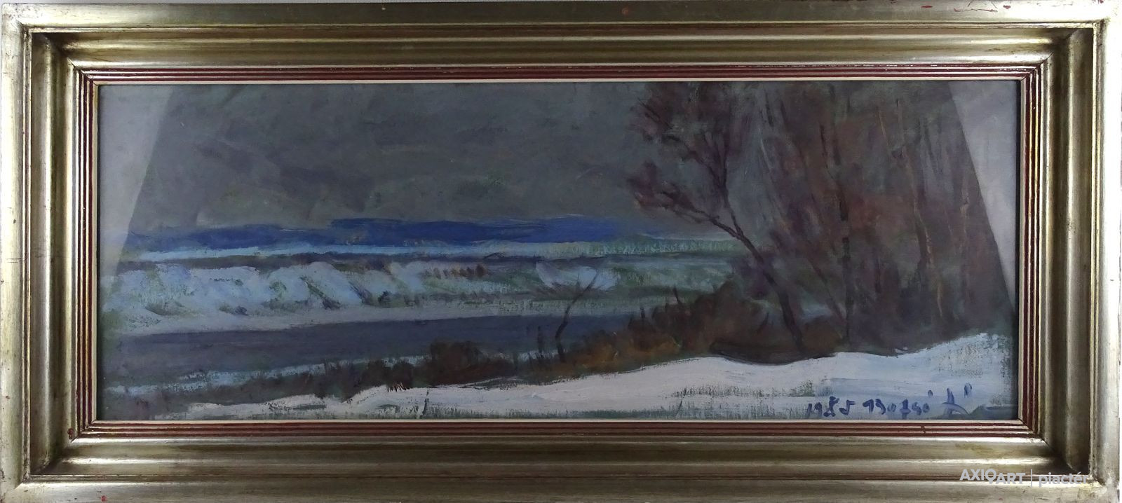 [1T021/059] Olaj furnér festmény, üveglap mögött, régi ezüst keretben. Téli táj a Tiszával. Akasztási lehetőséggel rendelkezik. Jelzés balra lent: 1985 BOZSÓ J. Hátoldalán felirat: JANI... A TISZÁN Magasság: 40.5 cm Szélesség: 90.5 cm Súly: 4.86 kg
