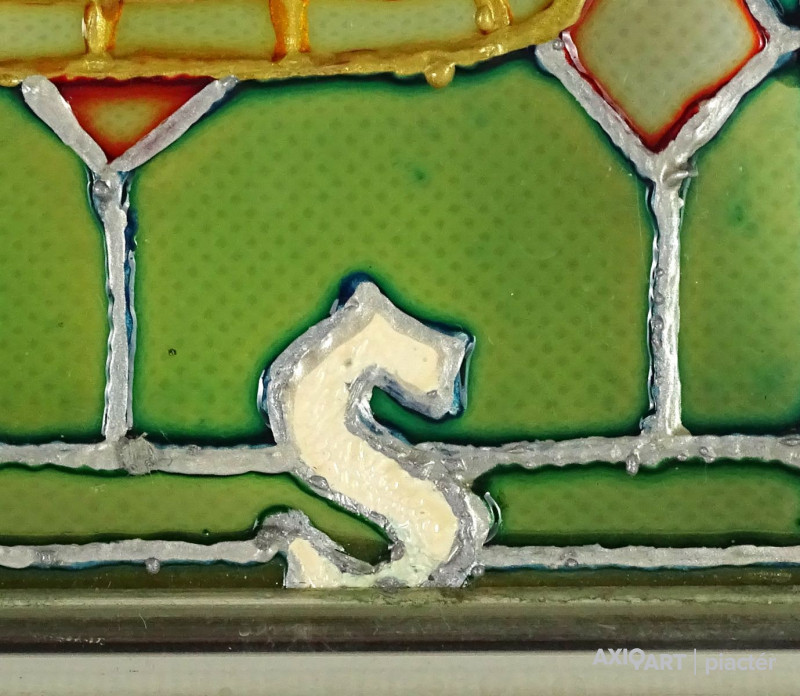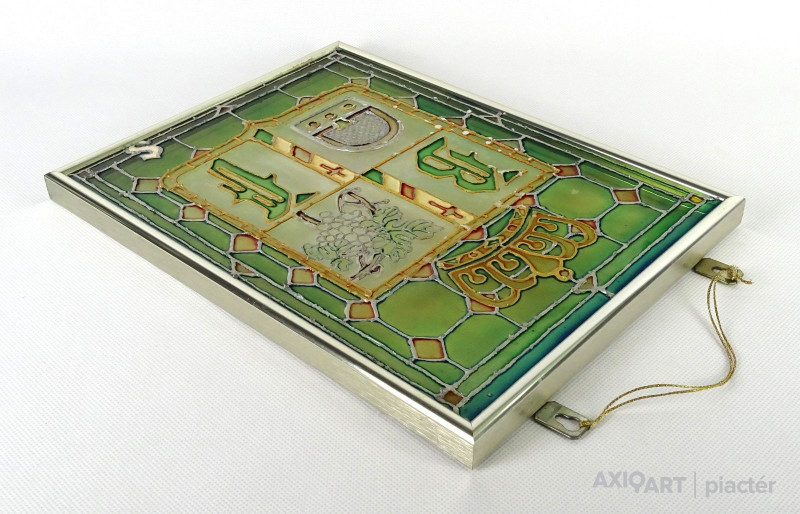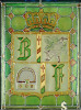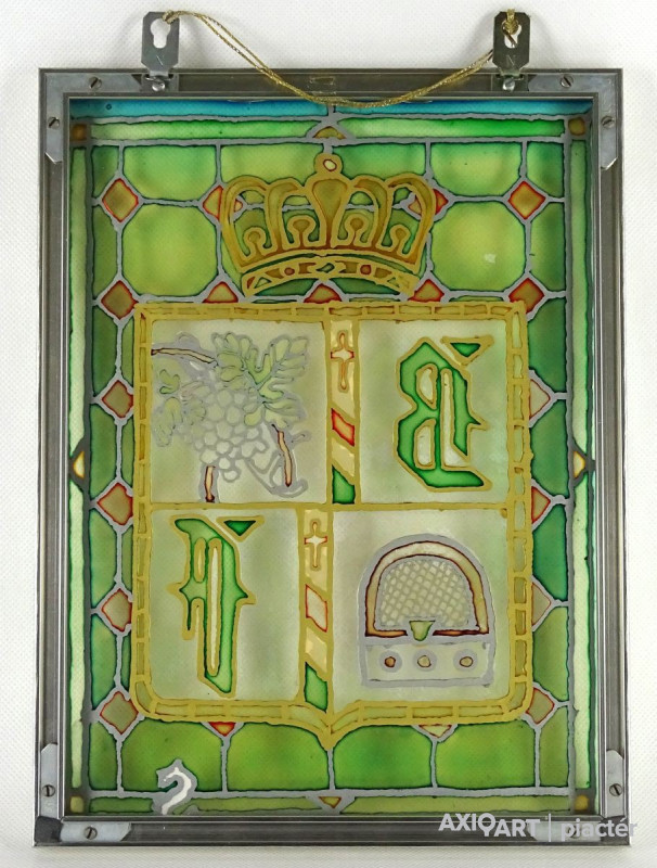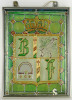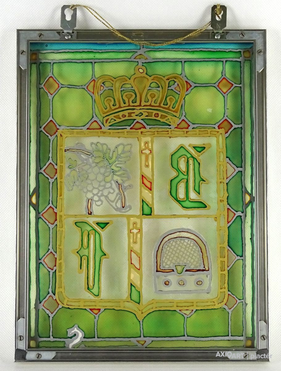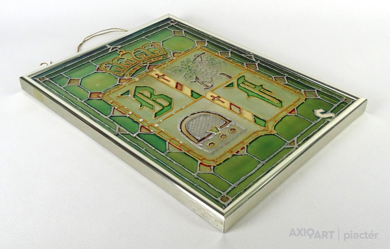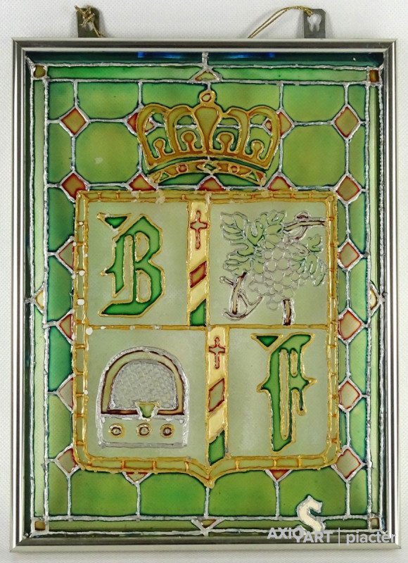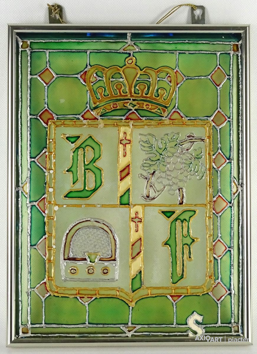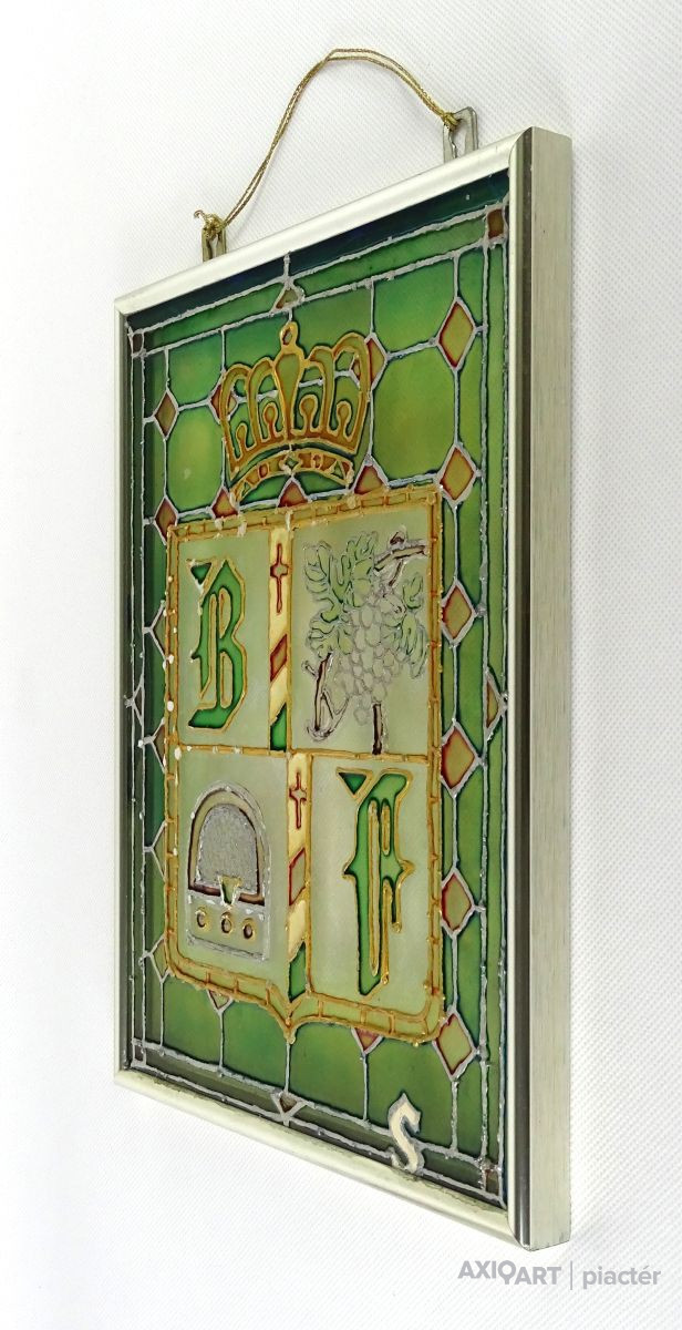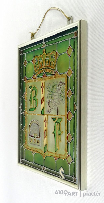 Bőzsöny Ferenc rádiós személyiség emléktárgya. Modern keretben található festett üveg. Korona alatt címerpajzsban szőlőlevél és rádiókészülék mellett Bőzsöny Ferenc nevének kezdőbetűi láthatók.