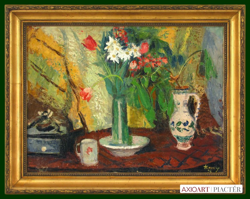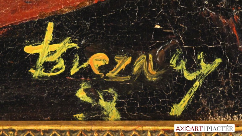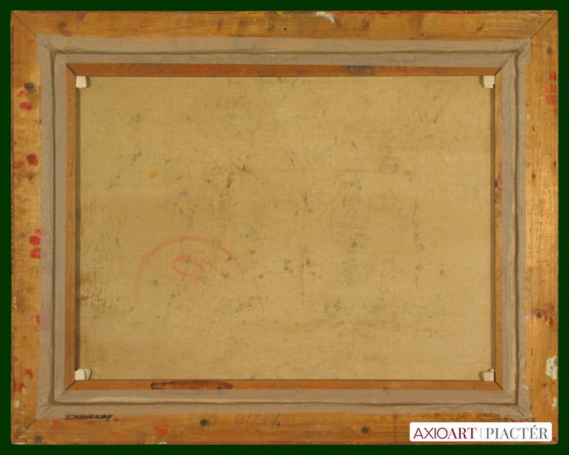 [FK2403/FL-1] A kép mérete: 60 x 80 cm keret nélkül. Készült: Olaj, Vászon A kép Breznay József (Budapest, 1916) alkotása. Jelezve Jobbra lent "Breznay 58" A festmény jó állapotban van. Keret: Ép Magyar festők és grafikusok életrajzi lexikona I-II. Festő. A budapesti Képzőművészeti Főiskolán eleinte Benkhard Ágost növendéke volt, de Szőnyi István személyében kapott igazán hozzá közelálló művészmestert. 1939-ben a főiskola aranyérmével tüntették ki. 1937-47 között háromszor volt római ösztöndíjas. Ausztriában, Svájcban és Itáliában járt tanulmányúton. Zsennyén, Tokajban, valamint a miskolci művésztelepen dolgozott. 1957-től a párizsi Independants Salon tagja. Főiskolás korától szerepelt különböző tárlatokon. Kiállított szerte a világban. Több tárlata volt Német- és Franciaországban, Olaszországban és Angliában, mint itthon. A Műcsarnokban, a Nemzeti Szalonban, a Fényes Adolf Teremben szerepeltek munkái, többnyire kollektív bemutatókon. A l'Humanité c. lap párizsi kiállítását "La peinture lumineuse et franch" címmel méltatta. 1941-42-ben Szinyei-díjat, 1953-ban Munkácsy-díjat, 1958-ban Csók István-emlékérmet kapott. Deauville-ben Grand Prix-vel, Brüsszelben pedig bronzéremmel tüntették ki. Ezen kívül számos kitüntetéssel jutalmazták művészi tevékenységét. Munkásságában Szőnyi hatása egyértelmű. Az ember és a táj egységének keresése jellemző Breznay J. festészetére. Eleinte főleg az impresszionizmus eredményeit hasznosítja. Az 1940-es évek végéig színgazdag, oldott festőiség jellemzi tájképeit, idilli jeleneteit. Az 1950-es évek elején realista műveket alkot. 1957-es párizsi útja után művészetében fordulat következik be. Változatos technikájú (olaj, akril, stb.), expresszív, szimbolikus tartalmú, a szürrealizmushoz közeli, de mindvégig realista műveket alkot. Mint mesterét, őt is "melankolikus, megértő" költőiség jellemzi. Monumentális feladatokat is végzett. Munkáit számos magyarországi múzeum őrzi. (F. Z.: Műv. 1966/1, MÉ, ML, KF., Ladányi József adatközlése nyomán) Magyar festők és grafikusok adattára A Képzőművészeti Főiskolán Benkhard Ágost és Szőnyi István növendékeként diplomázott 1939-ben, amikor is a főiskola aranyérmével tüntették ki. 1939-1947 között háromszor volt Római-ösztöndíjas. Itthon a Fókusz Galériában (1946), a Fényes Adolf Teremben (1953), a Csók Galériában (1961), és a Műcsarnokban (1973) rendezett önálló bemutatókat. Külföldön Franciaországban, Az NSZK-ban, Svédországban, Belgiumban, Spanyol- és Olaszországban állított ki. 1941-ben és 1942-ben Szinyei-díjat, 1953-ban Munkácsy-díjat kapott, 1958-ban elnyerte a Csók István-emlékérmet. Deauville-ben Grand Prix-szel (1961), Brüsszelben bronzéremmel (1964) tüntették ki. - Képei sajátos önvallomások a család, az anyaság, a szerelem, a magányos szemlélődés témaköréből, de életművében gyakori a hazai táj, városi látképek romantikus ihletettségű bemutatás, a mondák, legendák mai figurákkal és környezettel való ábrázolása. - Irod.: P. Sz. T.: Művész életrajzok. Bp. 1985. Magyar festők és grafikusok életrajzi lexikona I-II. Műgyűjtők és kereskedők kézikönyve Festő. A budapesti Képzőművészeti Főiskolán eleinte Benkhard Ágost növendéke volt, de Szőnyi István személyében kapott igazán hozzá közelálló művészmestert. 1939-ben a főiskola aranyérmével tüntették ki. 1937-47 között háromszor volt római ösztöndíjas. Kiállított szerte a világban. Több tárlata volt Német- és Franciaországban, Olaszországban és Angliában, mint itthon. A l'Humanité c. lap párizsi kiállítását "La peinture lumineuse et franch" ...címmel méltatta. 1941-42-ben Szinyei-díjat, 1953-ban Munkácsy-díjat, 1958-ban Csók István-emlékérmet kapott. Deauville-ben Grand Prix-vel, Brüsszelben pedig bronzéremmel tüntették ki. Munkásságában Szőnyi hatása egyértelmű. Az ember és a táj egységének keresése jellemző Breznay J. festészetére. Főleg az impresszionizmus eredményeit hasznosítja. Portréi ideges ritmusú városi forgatagban, zárt belső tereken, vagy plein-air fényzuhatagában nyerik lényükhöz tartozó hátterüket. Mint mesterét, őt is "melankolikus, megértő" költőiség jellemzi. Monumentális feladatokat is végzett. (Műv.-1966/1, MÉ, ML) Művészeti lexikon I-IV. Festő. Munkácsy-díjas. 1934-39 között a Képzőművészeti Főiskolán Karlovszky Bertalan, Benhard Ágost és Szőnyi István növendéke volt. 1939-től portréival, figurális kompozícióval rendszeresen szerepel bel- és külföldi kiállításokon. Első gyűjt. kiállítása 1943-ban volt a Nemzeti Szalonban. Dekoratív, síkszerű, könnyed ábrázolókészség jellemzi művészetét. 1948-ban a Fiumei úti SZTK-székház, 1953-ban a központi házasságkötő terem, 1955-ben a komlói tanácsháza részére készített falképeket. 1956 után több ízben járt tanulmányúton Franciaországban, ahol ki is állította képeit. 1961-ben a Csók Galériában rendezték meg gyűjt. kiállítását. Művész életrajzok kortárs magyar képzőművészek 1939-ben aranyéremmel diplomázott a főiskolán Szőnyi István és Benkhard Ágost növendékeként. 1939-1947 között háromszor volt római ösztöndíjas. 1946-tól máig mintegy 25 egyéni kiállítása volt, a legfontosabbak a Fényes Adolf Teremben (1953), a Műcsarnokban (1972, 1982), Párizsban (1962), Düseldorfban (1964), Hannoverben (1966), Uppsalában, (1968), Brüsszelben (1971), Münchenben (1972), Milánóban (1974) és Pármában (1979). 1942-ben Szinyei-díjat, 1953-ban Munkácsy-díjat, 1958-ban Csók István-érmet kapott; 1961-ben Franciaországban, 1964-ben Belgiumban, 1978-ban Olaszországban nemzetközi díjat nyert. - Képei sajátos önvall