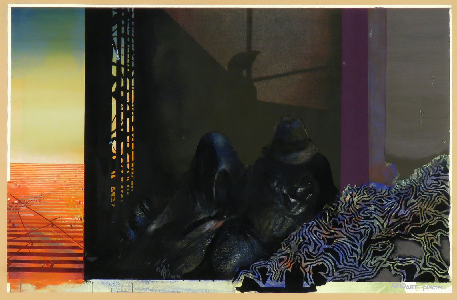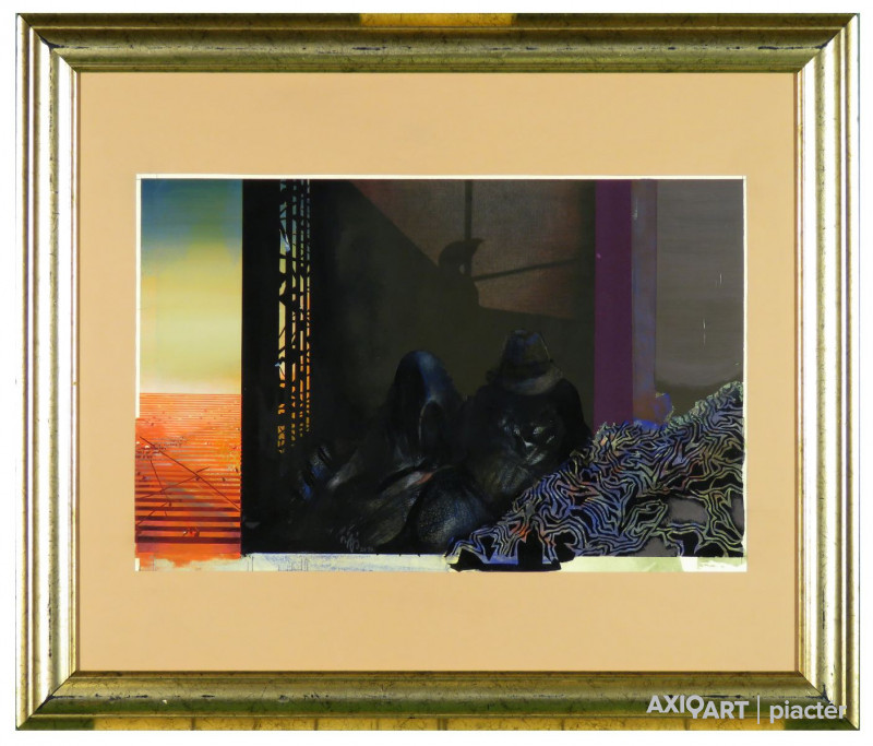 [FKB660/Bp1/69] A kép mérete: 34,5 x 50,5 cm keret nélkül. Készült: Tempera, kollázs, Papír A kép Buhály József (Nyírtass, 1945) alkotása. Jelezve balra lent "Buhály 2010" A festmény jó állapotban van. Keret: Ép Ho.: autográf írással "Emlékeim között" vegyes technika papír 34,5x50,5 2010 Buhály József régi művésztelep Szentendre Bp. u. 6. III. 4/B Magyar festők és grafikusok életrajzi lexikona I-II. Festő, grafikus. A Dési Huber Körben és a tokaji művésztelepen kezdett alkotni. A budapesti Képzőművészeti Főiskolán Szentiványi Lajos és Kokas Ignác tanítványa volt. 1977-78-ban ösztöndíjasként Moszkvában a Szurikov Művészeti Akadémián tanult. 1980-ban három évig Derkovits-ösztöndíjban részesült. 1979-től Szentendrén él a régi művésztelepen. 1980-tól tagja a Szentendrei Grafikai Műhelynek. Számos külhoni (Bécs, USA, Ankara, Athén, Dachau, Meiningen, Klagenfurt, stb.) csoportos kiállítás mellett 1981-ben Szentendrén, 1983-ban pedig a Stúdió Galériában rendezett egyéni kiállítást. Olaj- és temperatáblaképek mellett jelentős részt képviselnek munkái között a pasztellkrétával és ceruzával készített alkotások. Sokszorosított grafikái is vannak. Művészetének alaphangja szürreális, melyet konstruktív elemekkel gazdagít. Több monumentális munka alkotója. Művei helyet kaptak a Magyar Nemzeti Galériában és több vidéki múzeumban. Műv. díjak: szegedi Nyári Tárlat díja (1986), Reichelsheim város ösztöndíja (1987). (KF, Matits Ferenc adatközlése nyomán, MÉ) Művész életrajzok kortárs magyar képzőművészek A Képzőművészeti Főiskolán 1971-től 1977-ig előbb Szentiványi Lajos, majd annak halála után Kokas Ignác növendéke. 1977-1978-ban mint ösztöndíjas Moszkvában tanult. 1980-ban három évre Derkovits-ösztöndíjban részesült. 1979-től Szentendrén él a régi művésztelepen. Bizonyos fokú rejtelmesség árad el képein, amelyeken a nehézéletű emberekről ad hírt, tág képzettársítási lehetőségeket nyújtva a szemlélőnek. Műveivel több külföldi csoportos kiállításon szerepelt. Egyéni kiállításai: Szentendre, 1981, Budapest, Stúdió Galéria, 1983. Magyar festők és grafikusok életrajzi lexikona I-II. Műgyűjtők és kereskedők kézikönyve Festő. A fővárosi Képzőművészeti Főiskolán Szentiványi Lajos és Kokas Ignác tanítványa volt. 1977-78-ban ösztöndíjasként Moszkvában tanult. 1980-ban három évig Derkovits-ösztöndíjban részesült. 1979-től Szentendrén él a régi művésztelepen. Több külhoni csoportos kiállítás mellett 1981-ben Szentendrén, 1983-ban a Stúdió Galériában rendezett egyéni kiállítást. (MÉ) Magyar festők és grafikusok adattára A budapesti Képzőművészeti Főiskolán 1971-től 1977-ig Szentiványi Lajos, majd annak halála után Kokas Ignác növendéke. 1977-től 1978-ig mint ösztöndíjas Moszkvában tanult. 1980-ban három év Derkovits-ösztöndíjban részesült. 1979-től Szentendrén él a régi művésztelepen. Több külföldi csoportos kiállítás mellett 1981-ben Szentendrén, 1983-ban a Stúdió Galériában rendezett egyéni kiállítást műveiből. - Irod.: P. Sz. T.: Művész életrajzok. Bp. 1985. Kortárs magyar művészeti lexikon I-III. A Dési Huber Körben és a Tokaji Művésztelepen kezdett alkotni, majd felvették a főiskolára. 0971-77: MKF, mestere: Barcsay Jenő, Kokas Ignác és Szentiványi Lajos. 1980-83 között Derkovits-ösztöndíj; 1986: Szegedi Nyári Tárlat Díja; 1987: Reichelsheim város ösztöndíja. 1977-78-ban az MM ösztöndíjával Moszkvában dolgozott a Szurikov Műv. Akadémián. 1979-től tagja a szentendrei régi művésztelepnek; 1980-tól a Szentendrei Grafikai Műhelynek. Olaj- és temperatáblaképek mellett jelentős részt képviselnek művei között a pasztellkrétával és ceruzával készített művek. Sokszorosított grafikái is vannak. Művészetének alaphangja szürreális, melyet konstruktív elemekkel gazdagít. A vissza-visszatérő alakzatok szimbolikus rendszerekké állnak össze. A sajátos hangvételű, s különös, illuzórikus világban harmóniát teremt. Mindezt a fény- és színreflexekre épülő tereinek rendezettsége, valamint a szerkesztett metafizikus közegben felbukkanó valós elemek szerepeltetése teszik lehetővé. A párhuzamos vonalak alkotta rácsszerkezetek és a vibráló fénysugarak ismétlődő motívumai közé tartoznak. Ek: 1977: József A. M. és Képtár, Makó; 1978: Ferencvárosi Pincet. (kat.); Műv. H., Abádszalók; 1979: MÁV Fiók Kvtár., Hatvan (kat.); 1980: a GAMF Kt., Kecskemét (kat.); Műv. H., Abádszalók (kat.); 1981: Művésztelepi G., Szentendre (kat.); 1982: MMK, Veszprém (kat.); Blaskovits M., Tápiószele; 1984: Pál Gyula T., Nyíregyháza (kat.); 1988: Városi G., Reichelsheim; 1989: Átrium Hyatt Hotel; 1992: Református Gyülekezeti H., Kiskunhalas; 1993: Pátria H., Miskolc; 1994: Műv. Közp., Bonyhád; G. Arcis, Sárvár; Iskola G., Abádszalók; Dürer T., Gyula; 1996: Palotaszálló, Lillafüred; Art-East G., Bfüred (kat.); 1997: Művészetek H., Kisvárda. Vcsk: 1977-83: FKS éves kiállításai;; 1978-tól Csongrádi Művésztelep kiállításai; 1979-től Szentendrei tárlatok, Pest m.-i tárlatok, Szentendrei Képtár, Szentendre; 1980-92: Debreceni Műhely Alkotóközösség Kiállításai, Debrecen; 1980: Szentendrei festők, Városi M., Meiningen; 1981: Coll. Hung., Bécs; Vigadó G.; 1982: Knoxville (USA); 1983: Szentendrei festészet, Isztambul, Ankara, Athén, Meiningen; 1984: Mai Magyar Grafika, MNG; 1985: Szentendrei művészet, Dachau, Meiningen; 1986: XXV. Nyári Tárlat, Móra F. M., Szeged; Szentendrei festészet, Delmenhorst; 1987: V. Szolnoki Képzőművészeti Triennálé, Damjanich J. M., Szolnok; 1988: Tavaszi Trálat, MKISZ, Műcsarnok; 1989: Téli Tárlat, Műcsarnok; 1991: Szentendrei Műhely G