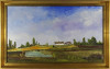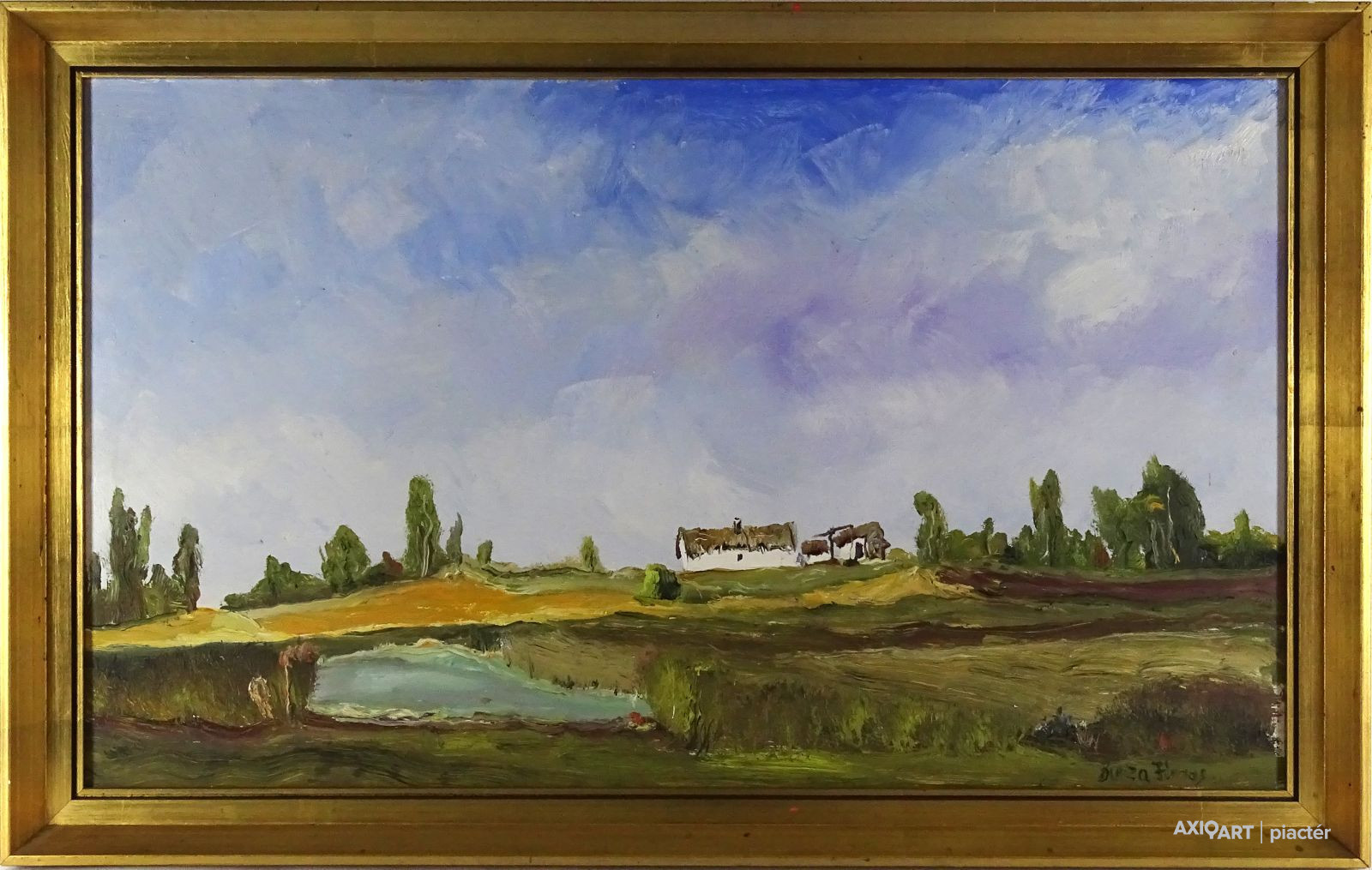 [1R557/137] 25% ÁRENGEDMÉNY MINDEN TERMÉKÜNKRE Dec. 14-ig Olaj farost festmény aranyozott keretben. Akasztási lehetőséggel rendelkezik. Datált jelzés jobbra lent: BURZA JÁNOS 1980 Hátoldalán aláírt címke, rajta felirat: BURZA JÁNOS TÁJKÉPFESTŐ 1986 Magasság: 45 cm Szélesség: 71 cm Súly: 2.21 kg