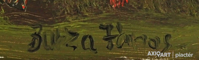 [FK3264/FL-4] A kép mérete: 31,5 x 70,5 cm keret nélkül. Készült: Olaj, tempera, Farostlemez A kép Kurucz D. István (Hódmezővásárhely, 1914, Budapest, 1996) alkotása. Jelezve Jobbra lent "Kurucz 977" A festmény jó állapotban van. Keret: Ép A festmény hátoldalán a Képcsarnokvállalat raglapja látható. Magyar festők és grafikusok életrajzi lexikona I-II. Festő, grafikus. Vásárhelyről, ahol Darvasy István festőművész figyelt fel tehetségére, került Szőnyi István magániskolájába. A fővárosi Képzőművészeti Főiskolának, ahol Rudnay Gyula, Réti István, Benkhard Ágost, Szőnyi István voltak a tanítómesterei 1940-ig volt a tanítványa. A monumentális festészetet Nagy Sándor tanította. Tanulmányúton járt több kelet- és nyugat-európai államban, Mongóliában, Japánban, Algériában. 1940-ben Hódmezővásárhelyen telepedett le, 1943-1947 között bekapcsolódott szülővárosa művészeti és közéletébe. A Vásárhely Népe c. lap munkatársa volt. 1949-59 között Szőnyi tanársegédjeként freskótechnikát tanított a főiskolán. 1951-52-ben megszervezte a Honvédségi Képzőművészeti Stúdiót, majd kinevezték a Honvéd Képzőművészeti Iskola igazgatójának. A vásárhelyi iskola reprezentáns egyéniségeként jelentős szerepe volt a Vásárhelyi Őszi Tárlatok elindításában. Megszervezete és vezette a Mednyánszky Társaságot, s haláláig művészeti vezetője volt a Hajdúböszörményi Nemzetközi Művésztelepnek. Évekig elnöke volt a Hortobágyi Alkotótábornak. Az alföldi parasztok életét megörökítő képei a falképek összefoglaló stílusában a népi realizmus és a dekoratív sommázás szellemében készültek. Számos falképet festett (Kossuth Akadémia, hódmezővásárhelyi iskola, stb.). 1941-től számos kisebb-nagyobb egyéni kiállítása volt, bemutatkozott több hazai és külhoni városban. 1941-től minden jelentősebb országos rendezvény és a magyar művészek külföldi bemutatóinak résztvevője. Rendszeresen szerepelt a Vásárhelyi Őszi Tárlatokon, a Hatvani Tájkép és Portrébiennálékon, a Szegedi Nyári Tárlatokon. Képei bemutatásra kerültek a vásárhelyi iskola jubileumi rendezvényein. 1962-ben több alkotásával szerepelt a Velencei Biennálén. Díjak: SZOT-díj, Munkácsy-díj, Érdemes és Kiváló Művész kitüntetés, Tornyai-plakett, római ösztöndíj, a Munka Érdemrend arany fokozata, Káplár Miklós-díj és emlékplakett, Kossuth-díj. Művei megtalálhatók minden jelentősebb hazai, több olasz és japán közgyűjteményben. (ML, D.J.: Műv. 1985/5, Tasnádi Attila adatközlése nyomán, L.L.: Műv. 1983/3) Magyar festők és grafikusok életrajzi lexikona I-II. Műgyűjtők és kereskedők kézikönyve Festő, grafikus. Vásárhelyről, ahol Darvasy István festőművész figyelt fel tehetségére, került Szőnyi István magániskolájába. A fővárosi Képzőművészeti Főiskolának, ahol Rudnay Gyula, Réti István, Benkhard Ágost, Szőnyi István voltak a tanítómesterei 1941-ig volt a növendéke. A monumentális festészetet Nagy Sándor tanította. Egy ideig tanársegédként működött Szőnyi mellett. Több ízben járt Itáliában tanulmányúton. Évekig művészeti vezetője volt a Hajdúböszörményi Nemzetközi Művésztelepnek. Az alföldi parasztok életét megörökítő képei a falképek összefoglaló stílusában a népi realizmus és a dekoratív sommázás szellemében készülnek. A II. világháború alatt szerepet vállalt a Szocialista Képzőművészek Csoportjának akcióiban. 1949-1960 k. a Képzőművészeti Főiskola falképtanszékének tanára volt. Több falképet festett (Kossuth Akadémia, hódmezővásárhelyi iskola, stb.). 1962-ben több alkotásával szerepelt a Velencei Biennálén, SZOT-díjas, Munkácsy-díjas, érdemes és kiváló művész kitüntető elismerésében részesült. (ML, D.J.: Műv.-1985/5, L.L: Műv.-1983/3) Magyar festők és grafikusok adattára Tanulmányait a Képzőművészeti Főiskolán végezte, ahol Rudnay Gyula és Réti István voltak a mesterei. 1941-1943-ban ösztöndíjas Rómában. 1943-1947 között Hódmezővásárhelyen dolgozik, egyidejűleg a Vásárhelyi Hétfő c. hetilap szerkesztője. 1949-1960 közötti években a budapesti Képzőművészeti Főiskola freskó tanszékének tanára. Az 1940-es évek eleje óta kiállító művész. 1962-ben a Velencei Biennálén állították ki műveit. 1970-ben Csók István Galériában volt kiállítása. A Vásárhelyi Őszi Tárlatok és a Szegedi Nyári Tárlatok rendszeres kiállító művésze. Az alföldi festészet egyéni hangú továbbfejlesztője. Táblaképeket, freskókat és kerámia falképeket alkot. Munkácsy-díjas, érdemes és kiváló művész kitüntető elismerésében részesült. A SZOT a legelső képzőművészek közt, 1962-ben tüntette ki díjával. A 70. születésnapját ünneplő művész 1984 decemberében életmű kiállítást rendezett műveiből a hódmezővásárhelyi Tornyai János Múzeumban. 1986-ban a budapesti Hollósy Galériában nyílt kiállítása. - Irod.: Szij Rezső: Kurucz Dezső István festőművész. Bp. 1967.; Kulcsár Ödön: SZOT-díjasok. Bp., 1981.; Lóska Lajos: Mindig freskót szerettem volna festeni. Beszélgetés Kurucz Dezső Istvánnal. Művészet, 1984. 3. Művészeti lexikon I-IV. Festő, Munkácsy-díjas. A Képzőművészeti Főiskolán Rudnay Gyula, Réti István, Benkhard Ágost, Szőnyi István növendéke volt 1934-40 között. Több ízben járt külföldi tanulmányúton. Az alföldi parasztok életét megörökítő képei a falképek összefoglaló stílusában a népi realizmus és a dekoratív sommázás szellemében készülnek. 1949-60 között a Képzőművészeti Főiskola falképtanszékének tanára volt. Több falképet festett (Kossuth Akadémia; Hódmezővásárhely, iskola, pápai pártház, 1965). Legutóbb 195