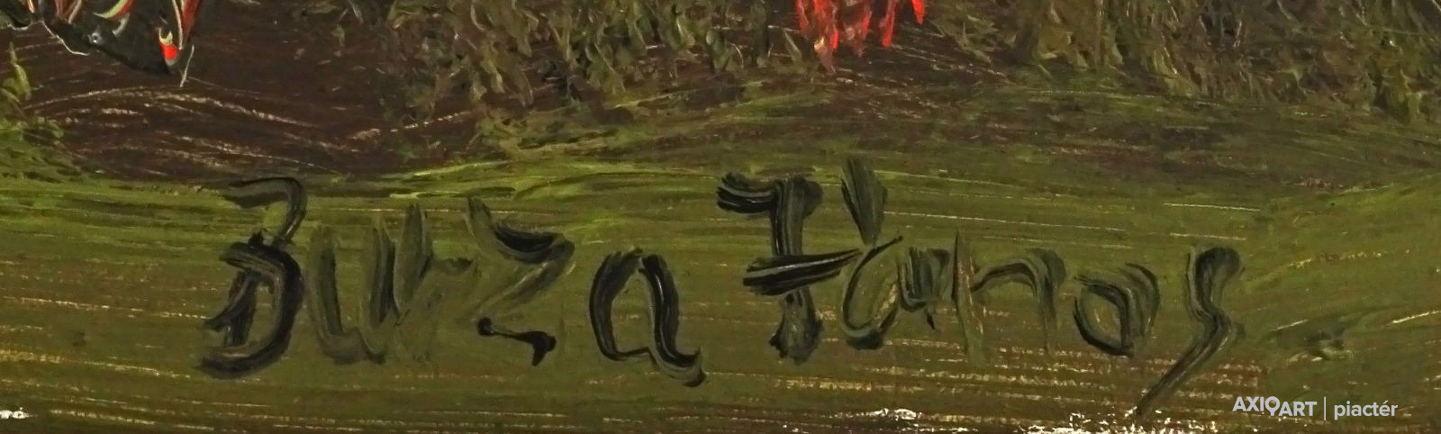 [FK0037/Z018] A kép mérete: 50 x 70 cm keret nélkül. Készült: Olaj, Vászon A kép Paizs László (Szentpéterúr, 1935) alkotása. Jelezve Jobbra lent "P. L." A festmény jó állapotban van. Keret: Ép A festmény hátoldalán a Képcsarnokvállalat címkéje található. Magyar festők és grafikusok életrajzi lexikona I-II. Festő. Tanulmányait a budapesti Iparművészeti Főiskolán végezte 1959-ben. Z. Gács György, Rákosy Zoltán és Szentiványi Lajos növendéke volt. A '60-as évek első felében hagyományosabb felfogású olajképeket festett, mozaikokat, freskókat, utóbb a pop-art körébe tartozó, a francia Arman munkáival rokon műveket alkotott. 1961 óta kiállító művész. Egyéni (Fényes Adolf Terem, Csók Galéria, Műcsarnok, Magyar Nemzeti Galéria, Halászbástya, Bástya Galéria, Vigadó Galéria, Budapest Galéria, Győr, Szombathely, Szeged, Zalaegerszeg, Duisburg, Aix-en-Provence, stb). és vegyes (Ernst Múzeum, Műcsarnok, Óbuda Galéria, Magyar Nemzeti Galéria, Csók Galéria, Vigadó Galéria, Székesfehérvár, Kaposvár, Pécs, Hódmezővásárhely, Firenze, Milano, Padova, Nápoly, Velence, Düsseldorf, Aachen, Genf, stb) tárlatokon vett részt. 1980-ban Munkácsy-díjjal jutalmazták, 1988-ban Érdemes Művész kitüntető elismerésben részesült. Munkáit őrzi a Magyar Nemzeti Galéria, a Fővárosi Képtár, a szombathelyi képtár, a pécsi Janus P. Múzeum, a székesfehérvári István Király Múzeum és a dunaszerdahelyi Kortárs Magyar Galéria. (H.B.: Műv, 1972/4, K.Gy.: Műv. 1977/2, K.G.: Műv. 1978/10, M.L.: Műv, 1983/5, R.G.: Műv, 1987/9, Sz.Gy.: Új Műv. 1995/4, MK) Magyar festők és grafikusok életrajzi lexikona I-II. Műgyűjtők és kereskedők kézikönyve Festő. Tanulmányait a bp.-i Iparművészeti Főiskolán végezte. Mozaikokat ferskókat, utóbb a pop-art körébe tartozó, a francia Arman műveivel rokon műveket alkotott. Mozaikok: a Szegedi Megyei Tanács, a Pécsi Óvoda, a Gödöllői Agrártudományi Egyetem. Freskók: Budapest - Csatárka úti Gyermekotthon. 1971-ben a Fényes Adolf Teremben volt kiállítása, 1983-ban pedig a szegedi Móra Ferenc Múzeumban nagyszabású tárlatokon mutatta be munkáit. 1988-ban érdemes művész kitüntető elismerésben részesült. (MK) Magyar festők és grafikusok adattára Az Iparművészeti Főiskolán végzett 1959-ben. Mozaikokat (Szeged, Megyei Tanács; Pécs, Óvoda; Gödöllő, Agrártudományi Egyetem), freskókat (Budapest, Csatárka úti Gyermekotthon), újabban a pop art körébe tartozó, a francia Arman műveivel rokon műveket alkotott. 1971-ben a Fényes Adolf Teremben nyílt kiállítása. 1983 februárjában a szegedi Móra Ferenc Múzeumban megrendezett nagyszabású tárlaton mutatta be alkotásait. 1988-ban érdemes művész kitüntető elismerésben részesült. - MK Művészeti lexikon I-IV. (Szentpéterur, 1935. dec. 26.- ): festő. Az Iparművészeti Főiskolán 1959-ben végzett Rákosy Zoltán, Z. Gách György és Szentiványi Lajos növendékeként. Épületdiszítő mozaikokat, (Szeged, Megyei Tanács, 1961; Pécs, Óvoda, 1964), műanyagfreskókat (Bp., Csatárka úti Gyermekotthon, 1964) és gobelinterveket készít. Kortárs magyar művészeti lexikon I-III. Festő, szobrász, grafikus. 1959: MIF, mesterei: Z. Gács György, Rákosy Zoltán, Szentiványi Lajos. 1980: Munkácsy-díj; 1988: érdemes művész. Főiskolás éveinek második felében, majd azt követően számos murális munka kivitelezésében vett részt, Fónyi Géza, Konecsni György, Z. Gács György, Rákosi Zoltán és Domanovszky Endre mellett dolgozva. A 60-as évek első felének hagyományosabb fölfogású olajképeket festett. 1964-ben a Velencei B.-n megismerkedett az amerikai pavilonban a pop art Európában akkor még újnak számító törekvésével, és részben ez inspirálta, hogy 1967-ben textil, fém, bőr anyagú "varrottas" képeket küldjön az FKS éves tárlatára; a megnyitó előtt többek között az ő munkáit is eltávolították a falról. A 70-es években pop art-os objekteket (A trónörököspár politikai gyilkosság áldozata lett, 1970, plexiüveg, újság, szarvasbogarak), majd konstruktív, átlátszó plexiüveg plasztikákat készített belső fénytörő határfelületekkel. A 80-as években készültek az anyagában színezett, konstruktív, nagyméretű poliészter szobrai, majd színes poliészter táblaképeket alkotott, mesterségesen roncsolt felületekkel, mintha régészeti leletek vagy atomtámadás utáni festmény-szurrogátumok lennének. Ekkor kezdett organikus plaszikájú bronzszobrokat is mintázni. A 90-es években, a táblaképek és szobrok mellett nagyméretű, egyedi grafikákat készített, formavilágában némileg a roncsolt táblaképekből kiindulva, de szinte kizárólag az emberi alakból elvonatkoztatott torzókat megjelenítve. Ek: 1966: Művészklub, Győr; 1971: Fényes A. T.; 1972: Bercsényi 28-30 G.; 1973: BME B-épület; 1976: Csók G.; 1977: G. Hildebrandt, Duisburg (NSZK); 1979: Bástya G., Halászbástya; Helyőrségi Műv. H., Nagyatád; József A. Műv. Közp., Szeged; Göcsej M., Zalaegerszeg; 1982: Bezzegh G., Küsnacht (CH); 1983: Móra F. M., Szeged; 1987: Műcsarnok (kat.); MNG; 1988: Pandora G., Badacsonytomaj; 1989: Parktheatter, Iserlohn (NSZK); Qualitas G.; Hevesi S. Színház, Zalaegerszeg; 1990: Vasarely Fondation (Ferdinánd Judittal, Fóth Ernővel), Aix-en-Provence (FR); 1994: Vigadó G.; 1997: Pest Center G.; 1998: Budapest G. (kat.); 1999: Pest Center G. (kat); G. Arcis, Sárvár; MMA, Bp.; 2001: SZK, Szhely; Ernst M. (kat.) Vcsk: 1961, 1964, 1966: FKS, Ernst M.; 1962: 9. Magyar Képzőműv. kiállítás, Műcsarnok; 1967: Mai magyar festészet, Új-Delhi; 1969: Vas megyei művészek, Savaria M., Szhely; V. Orsz. Grafikai B., Miskolc; 1971: Új művek, Műcsarnok; 1972: Fiatal művészek Budapestről. Likovni Salon, Újvidék (YU); 1972, 1973: Balatonboglár