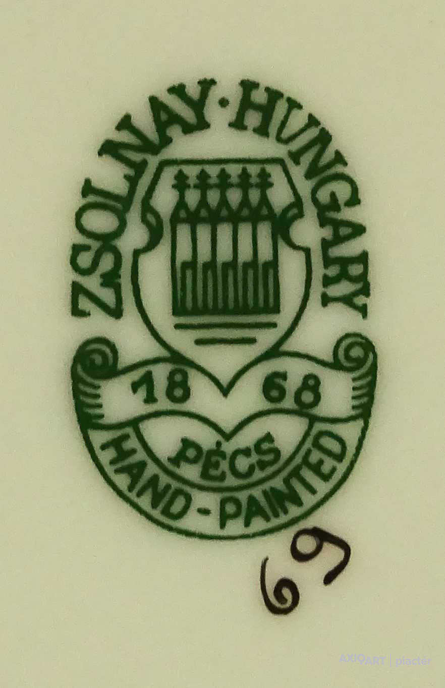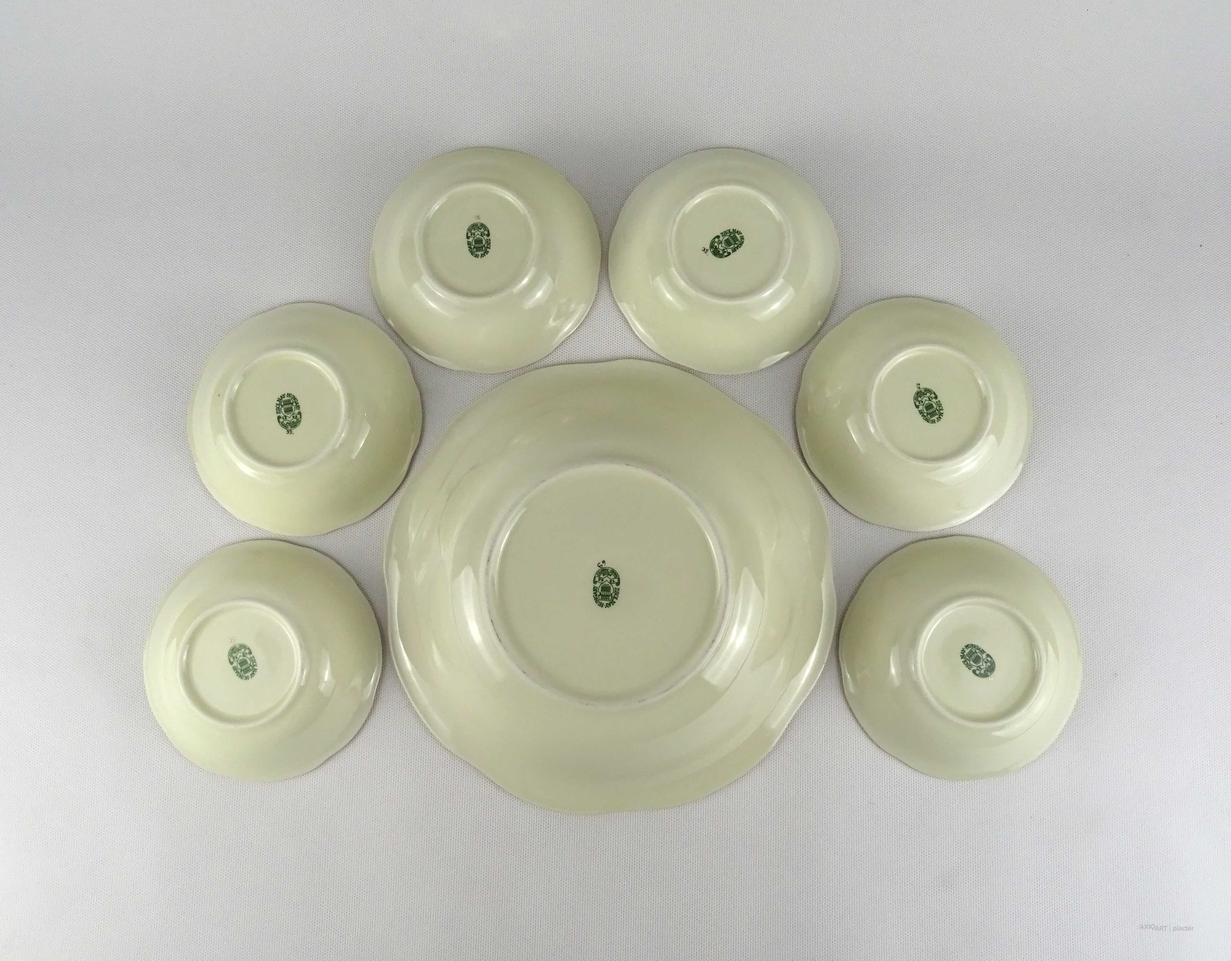 [1U198/X336] Hibátlan állapotú Zsolnay porcelán kompótos készlet búzavirág mintával díszítve, gazdagon aranyozva. Vajszínű Zsolnay porcelán készlet. Ajándékozható állapotban van. A készlet darabjai: - 1 darab kínáló tál (25 x 7 cm) - 6 darab kompótos tálka, kistál (13.2 x 3.5 cm) Alján zöld öttornyú márkajelzés: ZSOLNAY HUNGARY PÉCS 1868 HAND-PAINTED Súly: 1.51 kg   A süteményes kínáló tál átmérője 24 cm. Kistányér átmérője 19 cm. A készlet súlya 1915 g