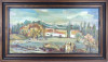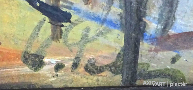 [2A218/006] Nagyméretű olaj vászon festmény, szép állapotú aranyozott keretben. Akasztási lehetőséggel rendelkezik. A kereten egy - két apró sérülés, lepattanás látható. Magasság: 111 cm Szélesség: 116 cm Súly: 4.22 kg MÓCZÁR KÁROLY (Kiskunfélegyháza, 1917.december 22) Móczár Károly festőművész-rajztanár. Elemi és középfokú iskoláit szülővárosában végezte. A Képzőművészeti Főiskolán Rudnay Gyula és Aba Novák Vilmos irányítása mellett tanult. A főiskola nyári kurzusain Pécsett iparművészeti tárgyakat tervezett. 1949-ben kezdett el tanítani szülővárosa Polgári Fiúiskolájában. Több mint harminc évig tanított. 1950-től rajzszakkört vezetett. 1958-tól nyaranta a Tokaji Művésztelepen dolgozott. Kiállításai: Kiskunfélegyháza, 1962, 1969, 1970; Emlékkiállítás Budapesten, 1984. (Megjelent a "Kiskunfélegyháza helyismereti könyve" c. munkában a 368. oldalon) Dr. Móczár István emlékezése Móczár Károlyra: "- Móczár Károly, 1973-ban fogadott bennünket a - bűnbarlangjában -, ahogy írta a hozzám címzett levelében. Akkortájt a gyulai kórházban voltam cselédkönyves orvos. Nagymama halála, illetve temetése az egész rokonságot Félegyházára szólította. A temetés után Karcsi bácsi meghívta minden rokonát a Városi Bíróság padlásán berendezett műtermébe. Ezidáig keveset tudtam róla, csak annyit amit apám mondott róla, hogy különc ember, de csodálatosan tud festeni stb. Ezért aztán az izgatottságom a tetőfokára hágott, amikor beléptünk vagy huszan, rokonok a műtermébe. Rengeteg képe hevert mindenfelé a padlón, a gerendákra felfüggesztve. A képei közül az egyik önarcképe ragadott meg leginkább, mert fantasztikusan volt megfestve. A koncentrikusan megfestett képeit nem értettem, kérdésemre az felelte, hogy a sebességet festette meg. Gyönyörű színeket használt, de voltak közöttük szomorkás hangulatú képek is. Sokat beszélt a Temetés című festményéről. Ritka pillanatnak számított, ahogy a rokonait fogadta műtermében és rejtett titkait tárta fel előttünk. Arról is beszélt, hogy éppen mi motiválta egy-egy téma megfestésére, vagyis mit ábrázolt a kép. "- Az élet igazsága a születés és az elmúlás! Amint látjátok, bárkik is vagytok, a glóriátok lehullik egyszer a gödörbe, hogy egy újabb glória szülessen helyette és ez a körforgás örök, amíg ember él a Földön! A fejek, mint a gyümölcsök lógnak az életfáról - mondta rezignáltan. Nagyon nagy megtiszteltetésnek éreztem, amikor felajánlotta számomra a Temetés című képet megvételre, jelképes áron, melyet az egyetemista "zsoldomból" is ki tudtam gazdálkodni. Hihetetlen hatással voltak rám a festményei, és munkássága. Karcsi bácsi nagyon örült annak, hogy édesapám is ott volt a műteremben, valamint sokan mások. Nagyon nagy válságban lehetett, mert nem tünt boldognak, és a savanykás hangulatú megjegyzéseiben felrémlett a közeljővő, a leskelődő végzet. Kétév múlva sajnos halálos motorbalesetet szenvedett." Sümegi György elemzése Móczár Károlyról, 1985. október 1-én Móczár Károlynak több mint másfél évtizeddel ezelőtt (1969. november 6-tól december 7-ig) volt már önálló tárlata szülővárosa, Kiskunfélegyháza múzeumában. Akkor még volt esély művészetének folytatására, amit évekkel később egy tragikus hirtelenségű baleset (A szerkesztő megjegyzése: motorkerékpárral történt baleset) - életével együtt - végérvényesen megvont tőle. A '70-es évek elején, félegyházi múzeumi munkáim során magam is többször találkoztam vele. Ha azt mondom róla, hogy festő, festőművész volt, akkor csak kevesen tudják művekkel is azonosítani a nevét. Életidejének utolsó részében ugyanis visszahúzódva élt, tépelődve és állandó kísérletezésbe merülve dolgozott műtermében. Ez a több emelet magasságban, padlássarokban kialakított műterem metaforája is lehetne Móczárnak. A dolgokat, jelenségeket, a megye s a város korabeli művészeti életét tudta így kivülről - talán felülről is -, de mindenképpen független pozícióból szemlélni. Ugyanakkor talán lemondóan is, hiszen művészeti visszavonultsága, függetlenségének elfogadtatásába s kiküzdésébe elsősorban az ötvenes évek tematikus elvárásai kényszeríthették. Móczár Károlyt szülővárosában elsősorban tanárként ismerték, szerették, tisztelték. Évtizedeken át tanított, előbb a Tanítóképzőben, majd a Móra Gimnáziumban rajzot, művészettörténetet, 1950-től pedig képzőművészeti szakkört is vezetett. Életrajzából érdemes idézni, hogy Kiskunfélegyházán született (1917. december 22.) s az elemi iskoláit is ott végezte. A képzőművészeti Főiskolán Rudnay Gyula és Aba Novák Vilmos irányítása mellett tanult. Különösen Aba Nováktól beszélt nekem Móczár lelkesülten egyszer a padlás-műtermében, ahol a legfeltűnőbb, mindenhonnét látható helyre, egy nagyméretű festőállványra mesterének egy plakát-önarcképét helyezte. Mérce és emlékeztető egyaránt lehetett ez számára, festő munkájára vonatkozóan is. Mértéket adhatott és egyúttal őszinteségre is késztethetett. De talán bénító is volt kissé, és el is lehetett bújni mögé arra hivatkozva, hogy mestereink műveit utolérni, netán meghaladni szinte lehetetlen, s ezért megkísérelni sem érdemes. Mindenesetre a műterme akkor nem folyamatos - nulla dies sine linea - (egy nap sem vonal nélkül) munkáról árulkodott.A művek kis száma és milyensége kísérletezésekről, megtorpanásokról vallott és mindez művészi elbizonytalanodást sejtetett. De mihez képest lett bizonytalanabb, mikor és hogyan torpanhatott meg Móczár? Főiskolás rajzai, kísérleti darabjai munkássága kezdetét, irányulását, a b