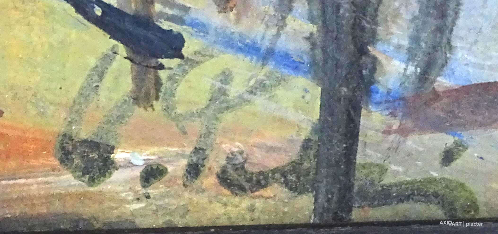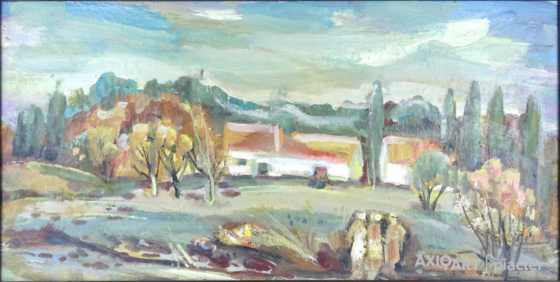 [FK3264/FL-4] A kép mérete: 31,5 x 70,5 cm keret nélkül. Készült: Olaj, tempera, Farostlemez A kép Kurucz D. István (Hódmezővásárhely, 1914, Budapest, 1996) alkotása. Jelezve Jobbra lent "Kurucz 977" A festmény jó állapotban van. Keret: Ép A festmény hátoldalán a Képcsarnokvállalat raglapja látható. Magyar festők és grafikusok életrajzi lexikona I-II. Festő, grafikus. Vásárhelyről, ahol Darvasy István festőművész figyelt fel tehetségére, került Szőnyi István magániskolájába. A fővárosi Képzőművészeti Főiskolának, ahol Rudnay Gyula, Réti István, Benkhard Ágost, Szőnyi István voltak a tanítómesterei 1940-ig volt a tanítványa. A monumentális festészetet Nagy Sándor tanította. Tanulmányúton járt több kelet- és nyugat-európai államban, Mongóliában, Japánban, Algériában. 1940-ben Hódmezővásárhelyen telepedett le, 1943-1947 között bekapcsolódott szülővárosa művészeti és közéletébe. A Vásárhely Népe c. lap munkatársa volt. 1949-59 között Szőnyi tanársegédjeként freskótechnikát tanított a főiskolán. 1951-52-ben megszervezte a Honvédségi Képzőművészeti Stúdiót, majd kinevezték a Honvéd Képzőművészeti Iskola igazgatójának. A vásárhelyi iskola reprezentáns egyéniségeként jelentős szerepe volt a Vásárhelyi Őszi Tárlatok elindításában. Megszervezete és vezette a Mednyánszky Társaságot, s haláláig művészeti vezetője volt a Hajdúböszörményi Nemzetközi Művésztelepnek. Évekig elnöke volt a Hortobágyi Alkotótábornak. Az alföldi parasztok életét megörökítő képei a falképek összefoglaló stílusában a népi realizmus és a dekoratív sommázás szellemében készültek. Számos falképet festett (Kossuth Akadémia, hódmezővásárhelyi iskola, stb.). 1941-től számos kisebb-nagyobb egyéni kiállítása volt, bemutatkozott több hazai és külhoni városban. 1941-től minden jelentősebb országos rendezvény és a magyar művészek külföldi bemutatóinak résztvevője. Rendszeresen szerepelt a Vásárhelyi Őszi Tárlatokon, a Hatvani Tájkép és Portrébiennálékon, a Szegedi Nyári Tárlatokon. Képei bemutatásra kerültek a vásárhelyi iskola jubileumi rendezvényein. 1962-ben több alkotásával szerepelt a Velencei Biennálén. Díjak: SZOT-díj, Munkácsy-díj, Érdemes és Kiváló Művész kitüntetés, Tornyai-plakett, római ösztöndíj, a Munka Érdemrend arany fokozata, Káplár Miklós-díj és emlékplakett, Kossuth-díj. Művei megtalálhatók minden jelentősebb hazai, több olasz és japán közgyűjteményben. (ML, D.J.: Műv. 1985/5, Tasnádi Attila adatközlése nyomán, L.L.: Műv. 1983/3) Magyar festők és grafikusok életrajzi lexikona I-II. Műgyűjtők és kereskedők kézikönyve Festő, grafikus. Vásárhelyről, ahol Darvasy István festőművész figyelt fel tehetségére, került Szőnyi István magániskolájába. A fővárosi Képzőművészeti Főiskolának, ahol Rudnay Gyula, Réti István, Benkhard Ágost, Szőnyi István voltak a tanítómesterei 1941-ig volt a növendéke. A monumentális festészetet Nagy Sándor tanította. Egy ideig tanársegédként működött Szőnyi mellett. Több ízben járt Itáliában tanulmányúton. Évekig művészeti vezetője volt a Hajdúböszörményi Nemzetközi Művésztelepnek. Az alföldi parasztok életét megörökítő képei a falképek összefoglaló stílusában a népi realizmus és a dekoratív sommázás szellemében készülnek. A II. világháború alatt szerepet vállalt a Szocialista Képzőművészek Csoportjának akcióiban. 1949-1960 k. a Képzőművészeti Főiskola falképtanszékének tanára volt. Több falképet festett (Kossuth Akadémia, hódmezővásárhelyi iskola, stb.). 1962-ben több alkotásával szerepelt a Velencei Biennálén, SZOT-díjas, Munkácsy-díjas, érdemes és kiváló művész kitüntető elismerésében részesült. (ML, D.J.: Műv.-1985/5, L.L: Műv.-1983/3) Magyar festők és grafikusok adattára Tanulmányait a Képzőművészeti Főiskolán végezte, ahol Rudnay Gyula és Réti István voltak a mesterei. 1941-1943-ban ösztöndíjas Rómában. 1943-1947 között Hódmezővásárhelyen dolgozik, egyidejűleg a Vásárhelyi Hétfő c. hetilap szerkesztője. 1949-1960 közötti években a budapesti Képzőművészeti Főiskola freskó tanszékének tanára. Az 1940-es évek eleje óta kiállító művész. 1962-ben a Velencei Biennálén állították ki műveit. 1970-ben Csók István Galériában volt kiállítása. A Vásárhelyi Őszi Tárlatok és a Szegedi Nyári Tárlatok rendszeres kiállító művésze. Az alföldi festészet egyéni hangú továbbfejlesztője. Táblaképeket, freskókat és kerámia falképeket alkot. Munkácsy-díjas, érdemes és kiváló művész kitüntető elismerésében részesült. A SZOT a legelső képzőművészek közt, 1962-ben tüntette ki díjával. A 70. születésnapját ünneplő művész 1984 decemberében életmű kiállítást rendezett műveiből a hódmezővásárhelyi Tornyai János Múzeumban. 1986-ban a budapesti Hollósy Galériában nyílt kiállítása. - Irod.: Szij Rezső: Kurucz Dezső István festőművész. Bp. 1967.; Kulcsár Ödön: SZOT-díjasok. Bp., 1981.; Lóska Lajos: Mindig freskót szerettem volna festeni. Beszélgetés Kurucz Dezső Istvánnal. Művészet, 1984. 3. Művészeti lexikon I-IV. Festő, Munkácsy-díjas. A Képzőművészeti Főiskolán Rudnay Gyula, Réti István, Benkhard Ágost, Szőnyi István növendéke volt 1934-40 között. Több ízben járt külföldi tanulmányúton. Az alföldi parasztok életét megörökítő képei a falképek összefoglaló stílusában a népi realizmus és a dekoratív sommázás szellemében készülnek. 1949-60 között a Képzőművészeti Főiskola falképtanszékének tanára volt. Több falképet festett (Kossuth Akadémia; Hódmezővásárhely, iskola, pápai pártház, 1965). Legutóbb 195