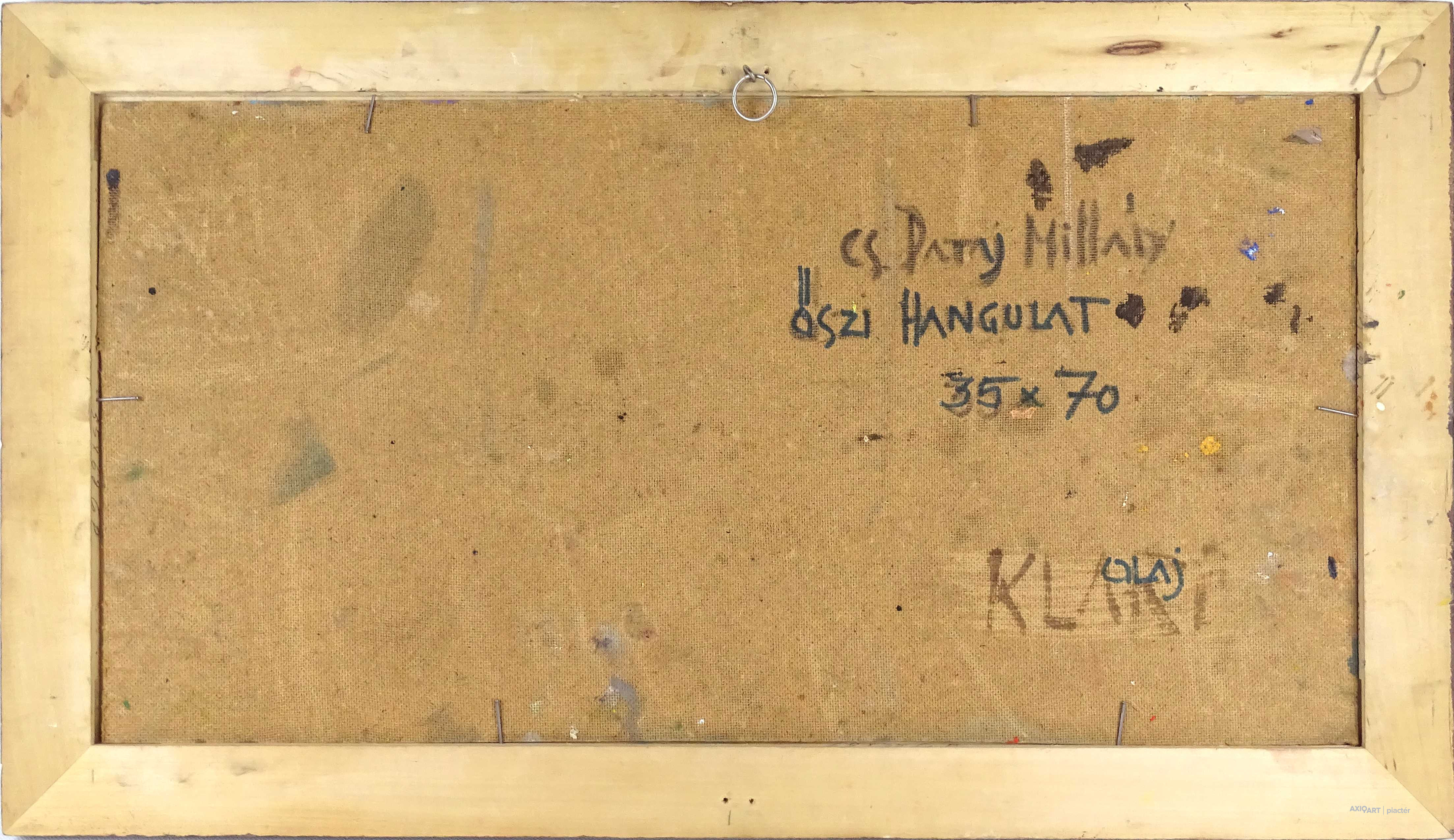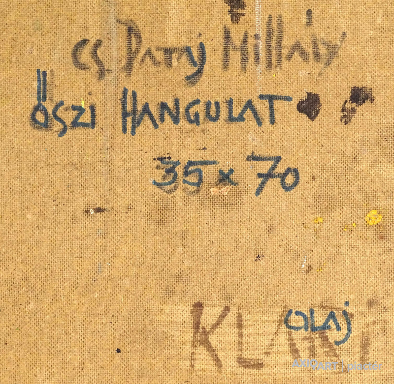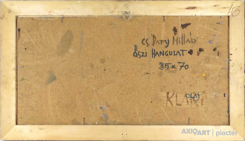 [2A215/036] Olaj farost festmény, széles barna fakeretben. Akasztási lehetőséggel rendelkezik. Ajándékozható állapotban van. Hátoldalán filctollas felirat: CS. PATAJ MIHÁLY ŐSZI HANGULAT 35 X 70 OLAJ Magasság: 45 cm Szélesség: 78 cm Súly: 2.33 kg Cs. Pataj Mihály Békéscsaba 1921, Szeged 2008 Pataj Mihály Festő, grafikus. Tanulmányait a budapesti Képzőművészeti Főiskolán végezte 1947-ben. Mestere Rudnay Gyula volt. A főiskola befejezése után Szarvason dolgozott. 1951 óta kiállító művész. A szegedi tanárképző főiskola Rajz és Művészettörténet Tanszékének tanára, majd tanszékvezetője volt. Szegeden él. Egyéni tárlaton mutatkozott be a szegedi Móra Ferenc Múzeumban 1960-ban, a hódmezővásárhelyi Tornyai János Múzeumban 1969-ben, a szarvasi Tessedik Sámuel Múzeumban 1974-ben, Bolognában 1976-ban, Luxemburgban 1981-ben, Miskolcon 1984-ben. Csoportos kiállításon vett részt a Magyar Nemzeti Galériában 1967-ben, a Tornyai János Múzeumban 1973-97-ben. 1970-ben megkapta a Munka Érdemrend Ezüst Fokozatát. Művei megtalálhatók a szegedi Móra Ferenc Múzeumban, a békéscsabai Munkácsy Mihály Múzeumban.   Forrás: kieselbach.hu