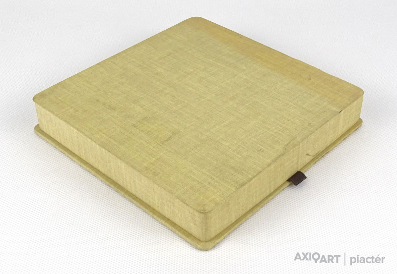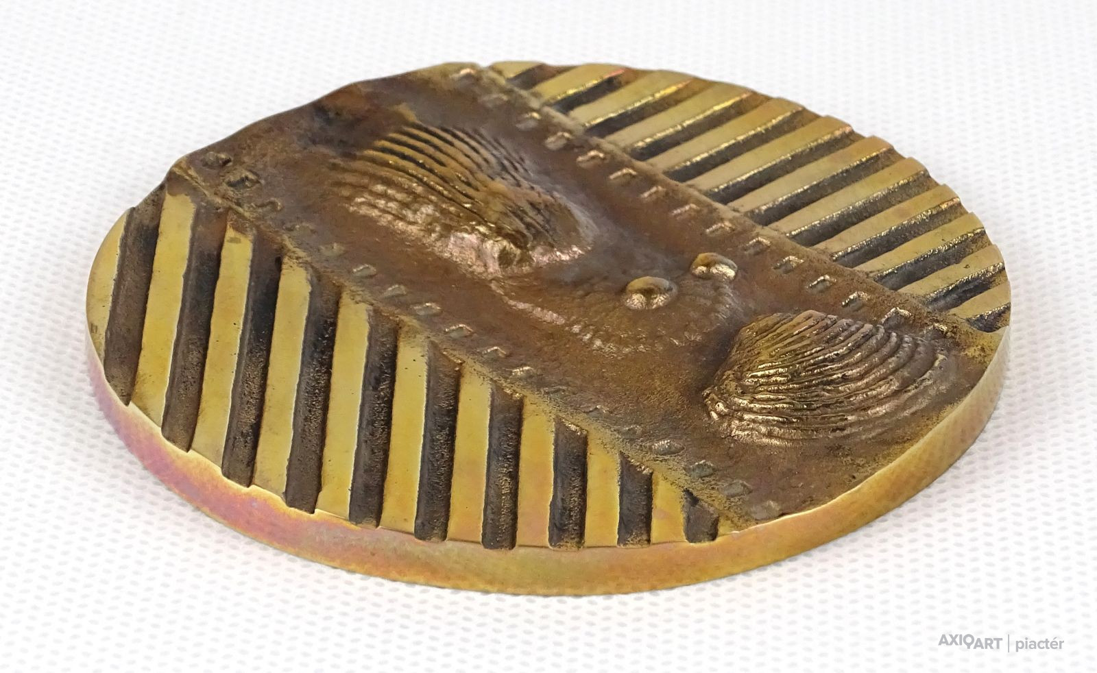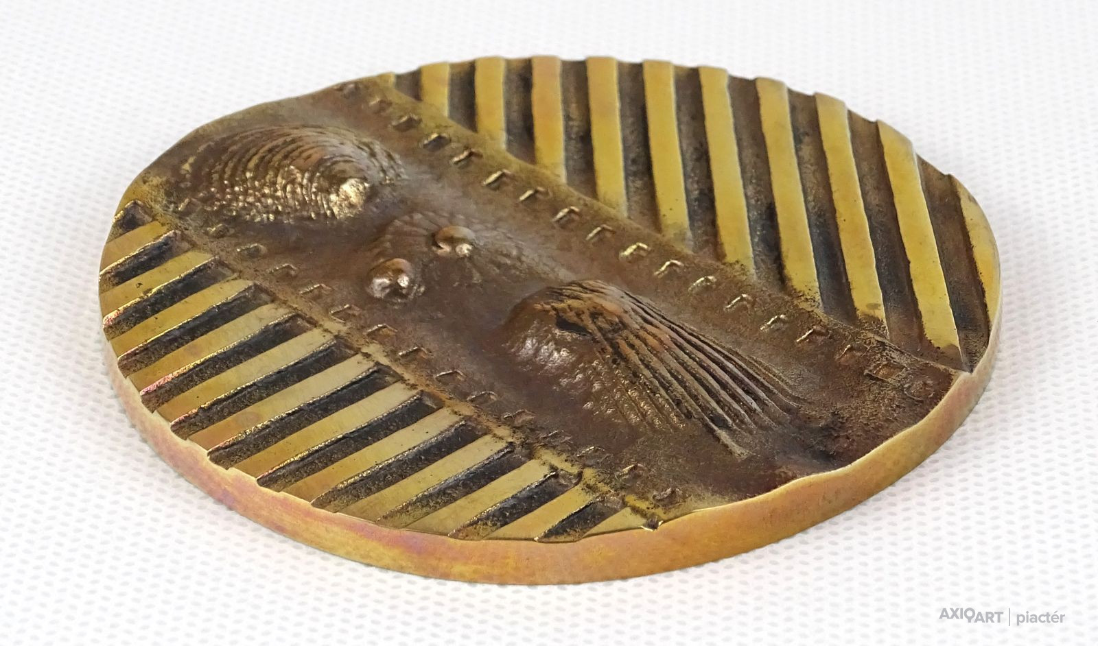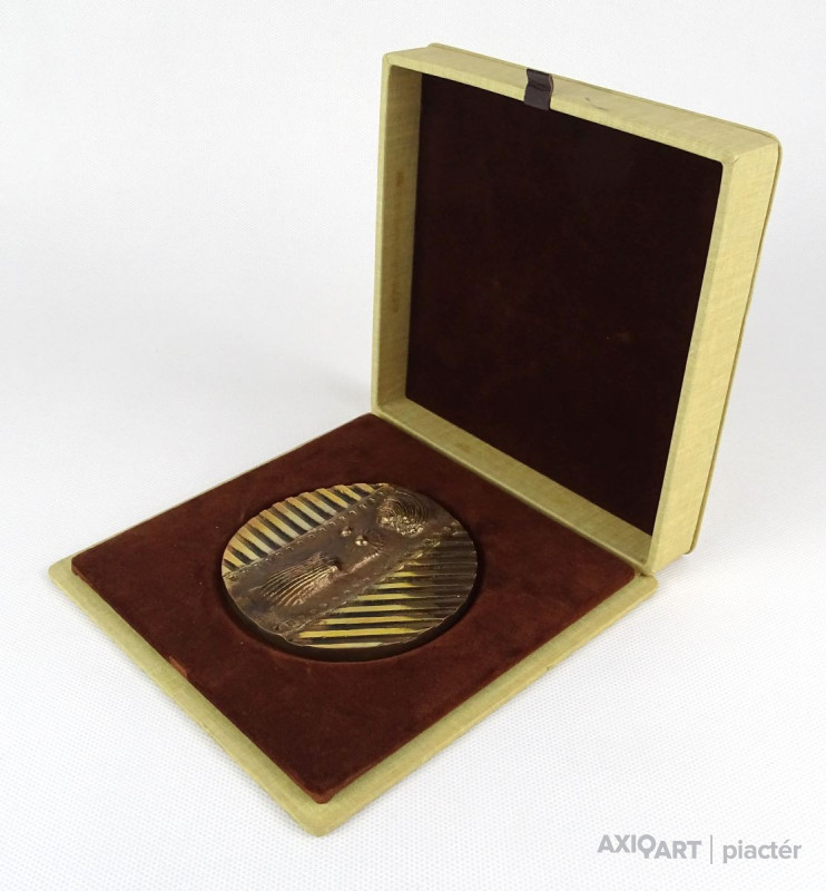 [1I390/X026] Hibátlan állapotú, jelzett bronz plakett szép bőrdíszműves bőr tokban. Elején plasztikus virágdíszítés mellett jelzés: KL Hátoldalán felirat: A KISZ. KIVÁLÓ PROPAGANDISTÁJA Súly: 0.485 kg Kutas László szobrász Budapest, 1936-04-17 Szerző: Matits Ferenc Gimnazistaként Sopronban Ágoston Ernő szabadiskolájában sajátította el a rajzművészet alapismereteit, majd 1954 és 1960 között a Magyar Képzőművészeti Főiskolára járt, ahol Gyenes Tamás és Pátzay Pál voltak a mesterei. Érzékletes mintázás, jó formaérzék, szellemes komponálás, választékos anyaghasználat tünteti ki plasztikai működését. A realista hagyományokra épülő, egyéni stílusát tükröző kő és bronz köztéri szobrokon kívül narratív kisplasztikákat, érmeket készít. A Magyar Nemzeti Bank pályázatain 11 alkalommal nyert emlékpénz készítésére megbízást. A firenzei Giorgio Vasari Nemzetközi emlékérem pályázaton 1974-ben I. díjat kapott, a Sportérem pályázaton 1975-ben II. és III. díjat, az Ezüstgerely pályázaton 1976-ban különdíjat érdemelt ki. 1979-ben a ravennai Dante Biennálé ezüst érmét, 1991-ben és 1995-ben pedig a soproni Országos Éremművészeti Biennálén Roisz Vilmos-díjat nyert. 1990 óta zsűritag a Ravennai Kisplasztikai Dante Biennálén. Figurális kisplasztikái egy-egy történetet mesélnek el. Az alakok kifejező megmintázása, környezetbe helyezése, dinamikus megfogalmazása elgondolkodásra késztetnek. Alkotásai népszerűek a hazai, valamint külföldi gyűjtők körében és szereztek a művésznek világhírnevet. Irodalom (kat. bev., Országos Széchenyi Könyvtár Galéria, 1994) ESZES A.: Otthon útközben. Műteremlátogatás ~nál, Anna, 1994/7. KOVÁCS P.: A tegnap szobrai, Szombathely, 1992 VEKERDY T.: ~ és szobrai, Várhely, 1997/3. Film BAYER I.: Művészportré, Civil Kurázsi Műsor, MTV, 1994-5. Egyéni kiállítások Egyéni kiállítások 1976 • Festőterem, Sopron • Haydn Művelődési Ház, Fertőd 1983 • Bank für Gemeinwirtschaft, Regensburg • Haydn Művelődési Ház, Fertőd • Munkás Művelődési Központ, Paks 1990 • Galerie Meerbusch, Düsseldorf 1993 • Városi Kórház Galéria, Grevenbroich (D) • Galerie Greve, Hamburg 1996 • G. P. Breughel, Venlo (gyűjt.) 1998 • Galéria, Tamási. Válogatott csoportos kiállítások Válogatott csoportos kiállítások Őszi Tárlatoknak és 1977-1999 • Országos Éremművészeti Biennáléknak. 1977-től vett részt a FIDEM nemzetközi kiállításain. A ravennai Dante Biennálén1975-ben, 1977-ben és 1979-ben vett részt. 1964 • Vásárhelyi Tárlatok 1954-1963, Magyar Nemzeti Galéria, Budapest 1968 • Az új Kecskeméti Művésztelep, Katona József Múzeum, Kecskemét 1970 • Kiállítás a Szakszervezetek Országos Tanácsa képzőművészeti pályázatára érkezett alkotásokból, Magyar Nemzeti Galéria, Budapest 1972 • 6. Balatoni Nyári Tárlat, Balatoni Múzeum, Keszthely 1974 • Vásárhelyi Tárlatok 1964-1973, Magyar Nemzeti Galéria, Budapest • G. Vasari nemzetközi Érembiennálé, Firenze 1976 • Balatoni Nyári Tárlat, Balatoni Múzeum, Keszthely 1979 • VI. Országos Kisplasztikai Biennálé, Pécs 1982 • Magyar mesterek, G. P. Breughel, Amszterdam 1990 • Ágoston Ernő tanítványai, Villamosipari Szakközépiskola Galéria, Sopron 1991 • Soproni Képes Céh Kiállítás, Collegium Hungaricum, Bécs • Soproni Képes Céh Kiállítás,Lajtaújfalu [Potzneusiedl] 1992 • Képes Céh Kiállítás, Lábasház, Sopron 1995 • Névjegy-érem kiállítás, OTP Galéria, Budapest 1996 • Képes Céh Kiállítás, Lábasház, Sopron. Művek közgyűjteményekben Művek közgyűjteményekben Királyi Éremtár, Stockholm Liszt Ferenc Múzeum, Sopron Városháza Gyűjteménye, Firenze Windsor Palota Gyűjteménye.  Forrás: artportal.hu