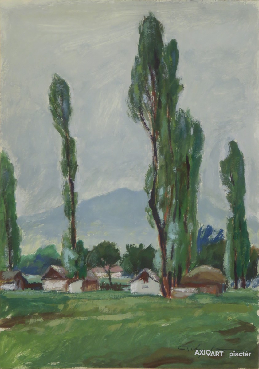 [FKC263/Bp94/66] A kép mérete: 30,5 x 21,5 cm keret nélkül. Készült: Tempera, Papír A kép Csiky András (Zilah, 1894, Budapest, 1971) alkotása. Jelezve jobbra lent "Csiky A. 955" A festmény jó állapotban van. Keret: Ép Egyéb Csiky András festő- és fotóművész életrajza, művészi pályafutása Csiky András 1894. február 28-án született Zilahon, Szilágy megyében. Édesapja az erzsébetvárosi (Bihar megye) nemesi Csiky örmény családból származó dr. Csiky L. János. Édesanyja Verzár Róza, szintén nemesi örmény családból származott. András a tíz gyermekes család elsőszülöttje volt. Közülük 1971-ig nyolcan életben voltak. Születése után nemsokára szülei Háromszék megyébe, Uzonba költöztek, ahol édesapja körorvosi állást kapott. Ide járt elemi iskolába. A középiskolát az erzsébetvárosi Magyar Királyi Állami Gimnáziumban végezte, ahol 1912-ben érettségizett. Az 1913/14-es tanévben a budapesti Országos Magyar Királyi Képzőművészeti Főiskola hallgatója, rajztanári szakon. 1915. október 17-én katonai behívót kapott a Magyar Királyi 24-es Honvéd Gyalogezredhez. Rövidesen a galíciai frontra vitték, ahol 1918. április 14-én tartalékos hadapród lett, később, mint hadapród szakaszparancsnok-helyettest Károly csapatkereszttel tüntették ki, majd zászlósként orosz, később szovjet hadifogságba került. Jekaterinburg, Krasznojárszk, Petrográd, Riga voltak fogva tartásának helyei. Hadifogságának emlékeit ceruzavázlatokon örökítette meg. Pénzszerzés céljából, gyufaszálakból elkészítette egy krasznojárszki pravoszláv templom modelljét, amely hamar gazdára talált. Fogolytársaival műkedvelő színi előadásokat szerveztek, melyre a városból is érkezett nézőközönség. Ezekhez ő készítette a német nyelvű meghívókat és plakátokat. Szökési kísérletei eredménytelenek voltak. A fogságból 1921. október 20-án szabadult. Hazatérésekor, korán, 1921. július 18-án elhunyt édesapját már nem találta életben. Ez részére azt is jelentette, hogy képzőművészeti főiskolai tanulmányait már nem folytathatta. Megélhetése biztosítása végett elsajátította Kolozsvárott Gárdinál a fényképész szakmát, és nagybátyjai támogatásával Tordán fényképészeti műtermet nyitott. A fényképészi munkát művészi színvonalon törekedett végezni. Eredményeiről 1929-1941 között nyert oklevelek és újságközlemények tanúskodnak. Műtermi munkája mellett tájképeket és csendéleteket festett akvarellel, néha olajjal is. Torda környéki és erdélyi kirándulásokon látottak képezték tájképeinek üde témáit. Az 1940-es bécsi döntés után, az év szeptemberében bezárta tordai műtermét, ideiglenesen Kolozsvárra költözött, és ott OTI biztosítási ellenőrként dolgozott. Ez a kényszerű változás egy ideig bizonytalanságot idézett elő megszokott életmódjában. 1942 tavaszán Budapestre jött, és letelepedése után 1944-ig az MFI-HUNNIA filmgyárnak és az MTI-nek dolgozott. Más munkákat is vállalt, de túlnyomóan fényképezésből biztosította megélhetését. Minden szabad idejét kirándulással és festegetéssel töltötte. Festményei iránt megnőtt az érdeklődés, és művészeti körökben is elismerésben részesült. Kellemes társasági magatartásával nagy ismeretségi körre tett szert. Társaságokba szeretettel fogadták be. Erről sok emlékkép tanúskodik. A második világháború vége Ausztria területén érte, és ott 1945. március 30-án angol fogságba került, ahonnan 1946 nyarán szabadult. A nyugati pályaudvarra érkezve a magyar hatóságok azonban nem engedték a szerelvényről leszállni. Annyi lehetősége volt, hogy értesítette Magda húgát és Lajos öccsét, akikkel pár szót tudott váltani. A továbbiakban az 1946. augusztus 28-án kelt orvosi igazolás szerint Debrecenbe vitték, ahonnan ismét szovjet hadifogságba került. Ez alkalommal Lettországba, Valgába vitték. Erről az utóbbi fogságról is sok ceruzavázlat maradt fenn. A hadifogságból 1947. augusztus 30-án érkezett haza, Budapestre. Megélhetése és nyugdíjának biztosítása érdekében dekorációs munkát vállalt, de festményeinek értékesítéséből is jövedelemhez jutott. Üde, kiváló tájképei és ízlésesen jól megkomponált csendéletei iránt megnőtt az érdeklődés. Néhány olaj, zsírkréta és tempera képétől eltekintve túlnyomóan akvarellel festette képeit. Az utóbbiban kiváló ecsetkezelési technikára tett szert. Képei rendkívül gyorsan készültek el. Fáradhatatlanul dolgozott életkörülményeire és időjárás viszonyokra való tekintet nélkül. Az 1950-es évek második felében három képpel szerepelt a Műcsarnokban rendezett kiállításon, ahol ezek el is keltek. 1956 és 1958 között az Új Képzőművészeti Munkaközösség tagja. Itt zsűrizték és értékesítették képeit. A munkaközösség megszüntetése után a Képzőművészeti Alaphoz került, amellyel kezdetben elfogadható volt a viszonya. Néhány képét eladták, három akvarelljét megvették, és ezekről készített másolatait képes levelezőlapként forgalmazták. Később ez a kapcsolat nem volt felhőtlen. Képei sok magyar családnál megtalálhatók, de számos közülük külföldre került: Erdélybe, Ausztriába, Németországba, Svájcba, Franciaországba, Svédországba, Horvátországba, Kanadába, USA-ba, Ausztráliába, stb. Képeinek száma emiatt bizonytalan, de jó becsléssel 500-1000 közé tehető. A családban is maradtak képek, mert szeretettel ajándékozott családi események alkalmával. Budapesten halt meg 1971. november 16-án. A képek hálás birtokosai, rokonai és ismerősei szeretettel őrzik emlékét, és gondozzák sírját a Farkasréti temetőben. Összeállította: Tutsek János fotóművész, Csiky András unokaöccse
