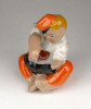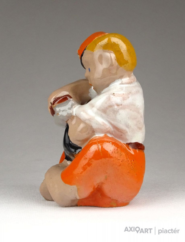 Régi, hibátlan állapotú, art deco Komlós kerámia figura. Kisméretű, huszárcsizmát fényesítő katona gyerek.