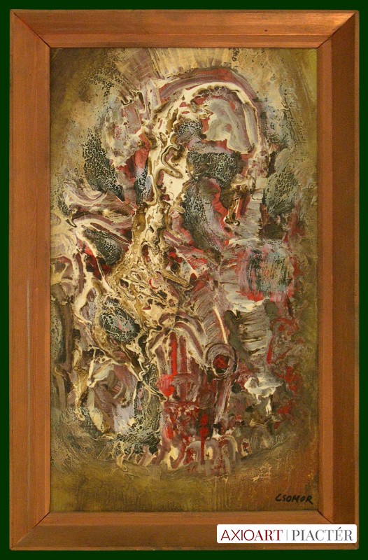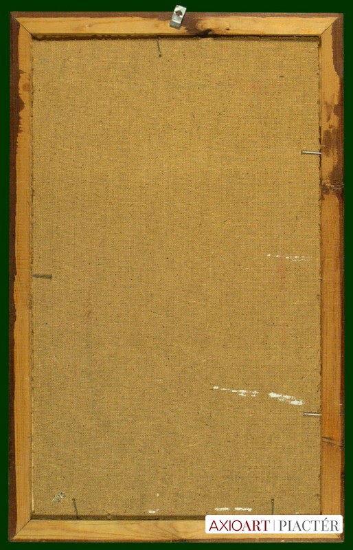 [FK0037/Z018] A kép mérete: 50 x 70 cm keret nélkül. Készült: Olaj, Vászon A kép Paizs László (Szentpéterúr, 1935) alkotása. Jelezve Jobbra lent "P. L." A festmény jó állapotban van. Keret: Ép A festmény hátoldalán a Képcsarnokvállalat címkéje található. Magyar festők és grafikusok életrajzi lexikona I-II. Festő. Tanulmányait a budapesti Iparművészeti Főiskolán végezte 1959-ben. Z. Gács György, Rákosy Zoltán és Szentiványi Lajos növendéke volt. A '60-as évek első felében hagyományosabb felfogású olajképeket festett, mozaikokat, freskókat, utóbb a pop-art körébe tartozó, a francia Arman munkáival rokon műveket alkotott. 1961 óta kiállító művész. Egyéni (Fényes Adolf Terem, Csók Galéria, Műcsarnok, Magyar Nemzeti Galéria, Halászbástya, Bástya Galéria, Vigadó Galéria, Budapest Galéria, Győr, Szombathely, Szeged, Zalaegerszeg, Duisburg, Aix-en-Provence, stb). és vegyes (Ernst Múzeum, Műcsarnok, Óbuda Galéria, Magyar Nemzeti Galéria, Csók Galéria, Vigadó Galéria, Székesfehérvár, Kaposvár, Pécs, Hódmezővásárhely, Firenze, Milano, Padova, Nápoly, Velence, Düsseldorf, Aachen, Genf, stb) tárlatokon vett részt. 1980-ban Munkácsy-díjjal jutalmazták, 1988-ban Érdemes Művész kitüntető elismerésben részesült. Munkáit őrzi a Magyar Nemzeti Galéria, a Fővárosi Képtár, a szombathelyi képtár, a pécsi Janus P. Múzeum, a székesfehérvári István Király Múzeum és a dunaszerdahelyi Kortárs Magyar Galéria. (H.B.: Műv, 1972/4, K.Gy.: Műv. 1977/2, K.G.: Műv. 1978/10, M.L.: Műv, 1983/5, R.G.: Műv, 1987/9, Sz.Gy.: Új Műv. 1995/4, MK) Magyar festők és grafikusok életrajzi lexikona I-II. Műgyűjtők és kereskedők kézikönyve Festő. Tanulmányait a bp.-i Iparművészeti Főiskolán végezte. Mozaikokat ferskókat, utóbb a pop-art körébe tartozó, a francia Arman műveivel rokon műveket alkotott. Mozaikok: a Szegedi Megyei Tanács, a Pécsi Óvoda, a Gödöllői Agrártudományi Egyetem. Freskók: Budapest - Csatárka úti Gyermekotthon. 1971-ben a Fényes Adolf Teremben volt kiállítása, 1983-ban pedig a szegedi Móra Ferenc Múzeumban nagyszabású tárlatokon mutatta be munkáit. 1988-ban érdemes művész kitüntető elismerésben részesült. (MK) Magyar festők és grafikusok adattára Az Iparművészeti Főiskolán végzett 1959-ben. Mozaikokat (Szeged, Megyei Tanács; Pécs, Óvoda; Gödöllő, Agrártudományi Egyetem), freskókat (Budapest, Csatárka úti Gyermekotthon), újabban a pop art körébe tartozó, a francia Arman műveivel rokon műveket alkotott. 1971-ben a Fényes Adolf Teremben nyílt kiállítása. 1983 februárjában a szegedi Móra Ferenc Múzeumban megrendezett nagyszabású tárlaton mutatta be alkotásait. 1988-ban érdemes művész kitüntető elismerésben részesült. - MK Művészeti lexikon I-IV. (Szentpéterur, 1935. dec. 26.- ): festő. Az Iparművészeti Főiskolán 1959-ben végzett Rákosy Zoltán, Z. Gách György és Szentiványi Lajos növendékeként. Épületdiszítő mozaikokat, (Szeged, Megyei Tanács, 1961; Pécs, Óvoda, 1964), műanyagfreskókat (Bp., Csatárka úti Gyermekotthon, 1964) és gobelinterveket készít. Kortárs magyar művészeti lexikon I-III. Festő, szobrász, grafikus. 1959: MIF, mesterei: Z. Gács György, Rákosy Zoltán, Szentiványi Lajos. 1980: Munkácsy-díj; 1988: érdemes művész. Főiskolás éveinek második felében, majd azt követően számos murális munka kivitelezésében vett részt, Fónyi Géza, Konecsni György, Z. Gács György, Rákosi Zoltán és Domanovszky Endre mellett dolgozva. A 60-as évek első felének hagyományosabb fölfogású olajképeket festett. 1964-ben a Velencei B.-n megismerkedett az amerikai pavilonban a pop art Európában akkor még újnak számító törekvésével, és részben ez inspirálta, hogy 1967-ben textil, fém, bőr anyagú "varrottas" képeket küldjön az FKS éves tárlatára; a megnyitó előtt többek között az ő munkáit is eltávolították a falról. A 70-es években pop art-os objekteket (A trónörököspár politikai gyilkosság áldozata lett, 1970, plexiüveg, újság, szarvasbogarak), majd konstruktív, átlátszó plexiüveg plasztikákat készített belső fénytörő határfelületekkel. A 80-as években készültek az anyagában színezett, konstruktív, nagyméretű poliészter szobrai, majd színes poliészter táblaképeket alkotott, mesterségesen roncsolt felületekkel, mintha régészeti leletek vagy atomtámadás utáni festmény-szurrogátumok lennének. Ekkor kezdett organikus plaszikájú bronzszobrokat is mintázni. A 90-es években, a táblaképek és szobrok mellett nagyméretű, egyedi grafikákat készített, formavilágában némileg a roncsolt táblaképekből kiindulva, de szinte kizárólag az emberi alakból elvonatkoztatott torzókat megjelenítve. Ek: 1966: Művészklub, Győr; 1971: Fényes A. T.; 1972: Bercsényi 28-30 G.; 1973: BME B-épület; 1976: Csók G.; 1977: G. Hildebrandt, Duisburg (NSZK); 1979: Bástya G., Halászbástya; Helyőrségi Műv. H., Nagyatád; József A. Műv. Közp., Szeged; Göcsej M., Zalaegerszeg; 1982: Bezzegh G., Küsnacht (CH); 1983: Móra F. M., Szeged; 1987: Műcsarnok (kat.); MNG; 1988: Pandora G., Badacsonytomaj; 1989: Parktheatter, Iserlohn (NSZK); Qualitas G.; Hevesi S. Színház, Zalaegerszeg; 1990: Vasarely Fondation (Ferdinánd Judittal, Fóth Ernővel), Aix-en-Provence (FR); 1994: Vigadó G.; 1997: Pest Center G.; 1998: Budapest G. (kat.); 1999: Pest Center G. (kat); G. Arcis, Sárvár; MMA, Bp.; 2001: SZK, Szhely; Ernst M. (kat.) Vcsk: 1961, 1964, 1966: FKS, Ernst M.; 1962: 9. Magyar Képzőműv. kiállítás, Műcsarnok; 1967: Mai magyar festészet, Új-Delhi; 1969: Vas megyei művészek, Savaria M., Szhely; V. Orsz. Grafikai B., Miskolc; 1971: Új művek, Műcsarnok; 1972: Fiatal művészek Budapestről. Likovni Salon, Újvidék (YU); 1972, 1973: Balatonboglár