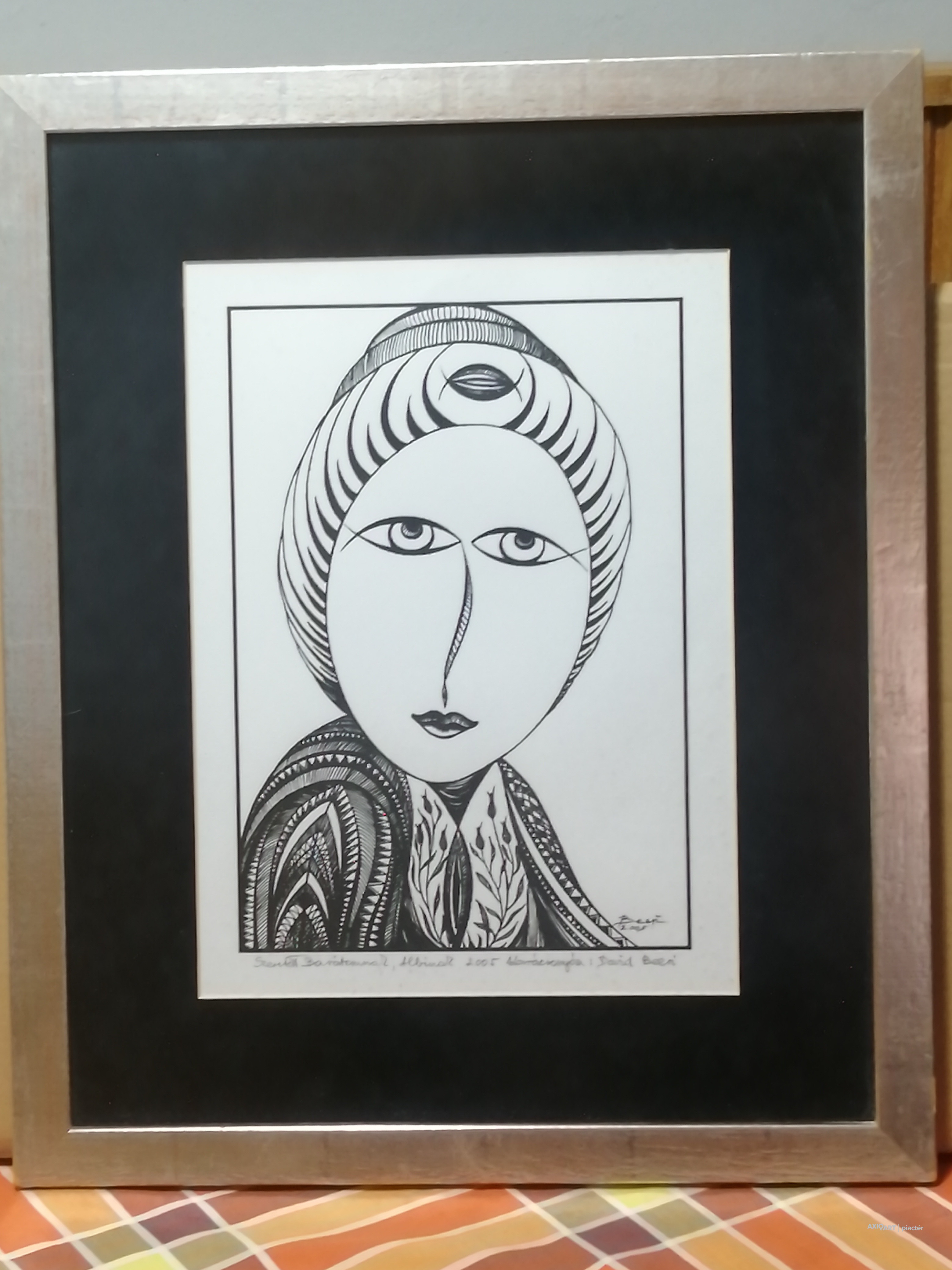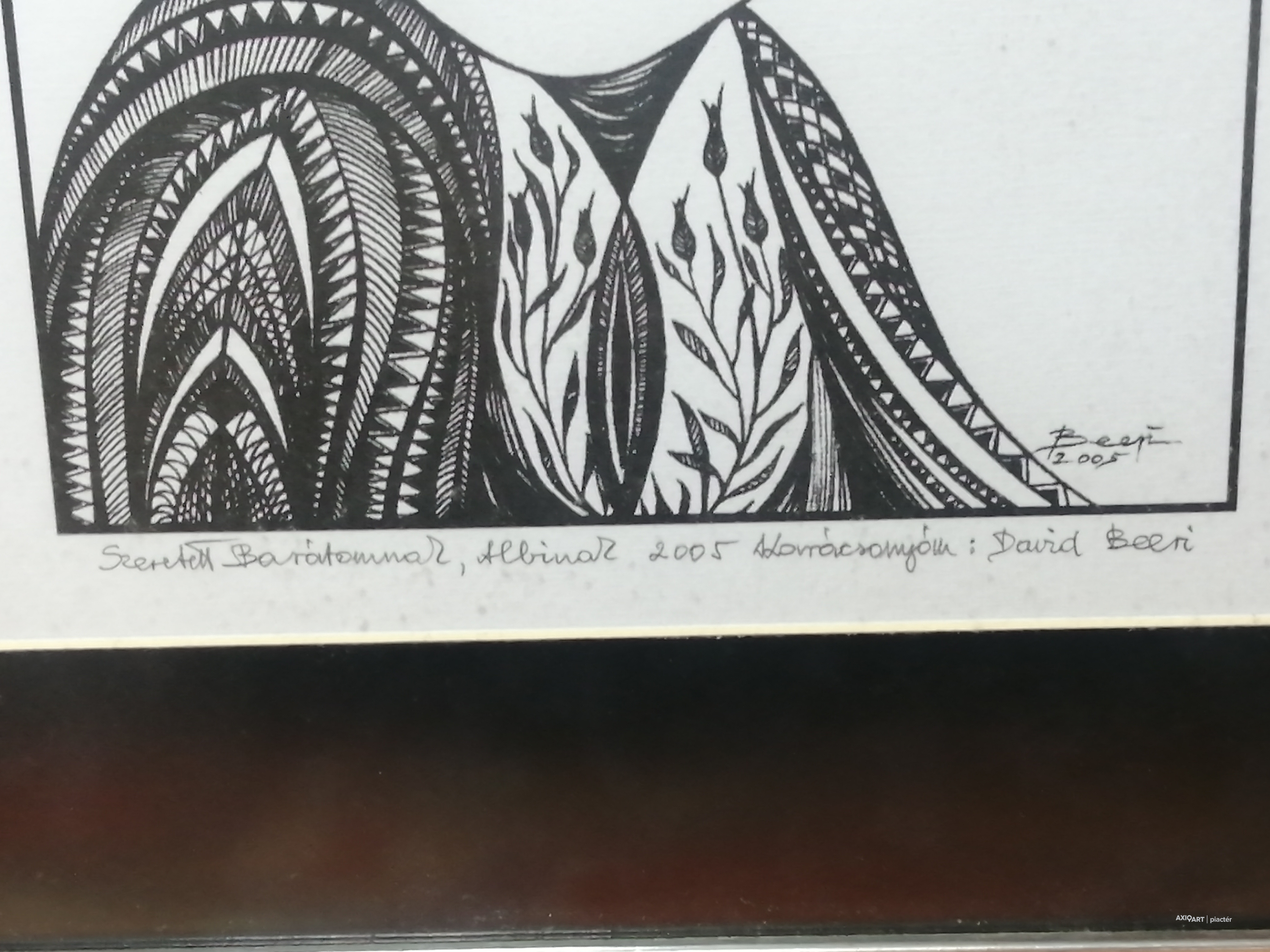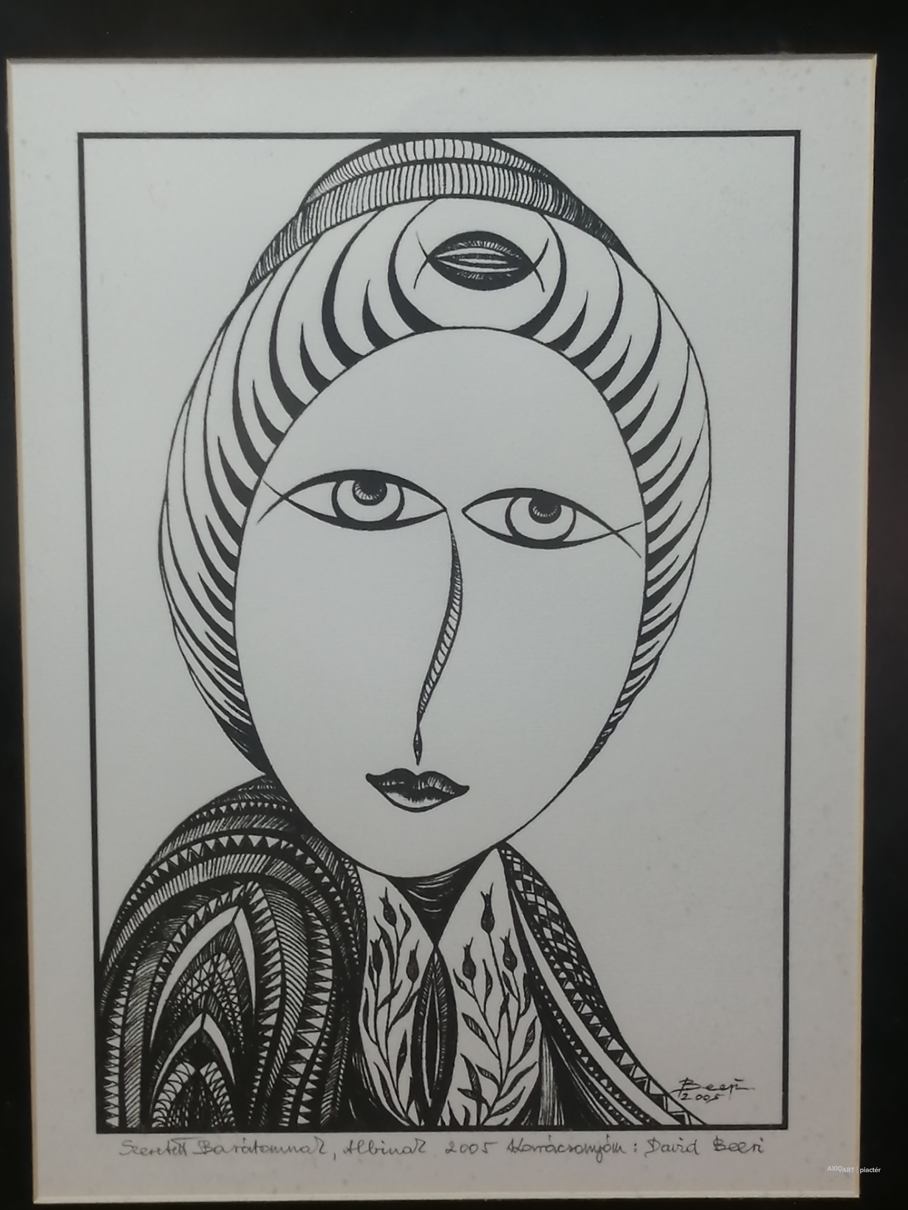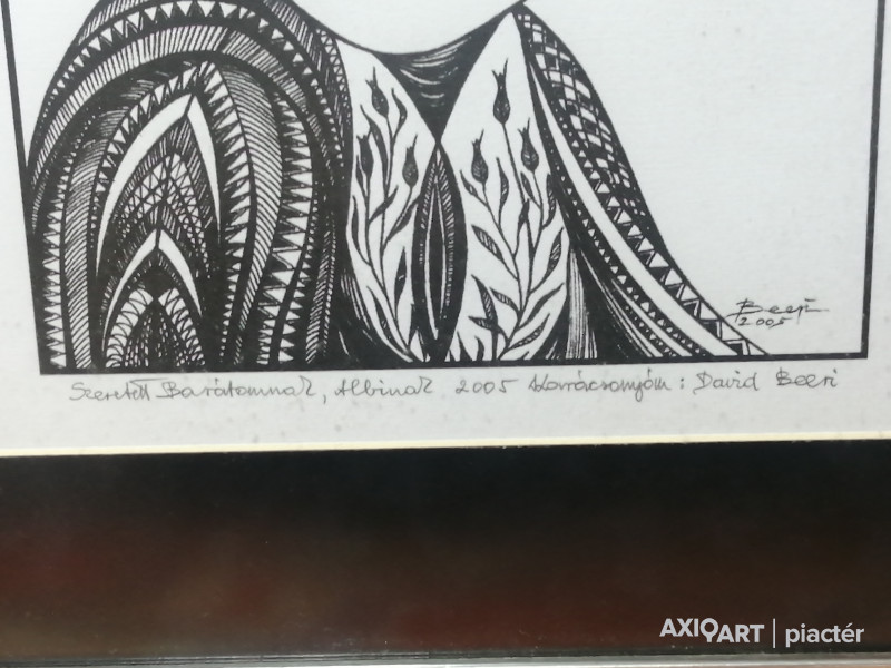 A művész által készített egyedi, 1/1-es tusrajz, amely 2005-ben született. Az alkotás különlegessége a dokumentált proveniencia: a hátoldalon a debreceni Holló László Galéria eredeti pecsétje látható, az előlapon pedig a művész saját kezű, névre szóló dedikációja szerepel („Szeretettel Barátomnak, Albinak...”). A hirdetéshez mellékelt makrofotókon jól látható a tus jellegzetes beszívódása a papír rostjaiba, ami garantálja a technika eredetiségét. Főbb paraméterek: Művész: David Beeri (Pongor Beri Károly) Technika: Egyedi tusrajz papíron (nem nyomat/litográfia!) Mérete: 45 x 55 cm (kerettel együtt) Korszak: 2005 (a művész keresett misztikus korszaka) Állapot: Kifogástalan, galériás állapotú, eredeti keretében, azonnal falra tehető.