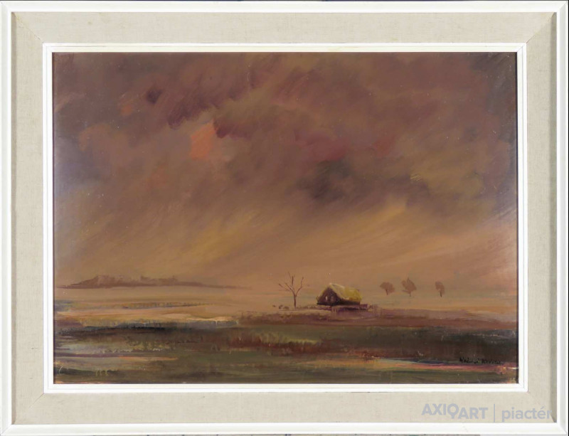 [FK3614/X178] A kép mérete: 50 x 90 cm keret nélkül. Készült: Olaj, Farost A kép Puskás Imre (Szeged, 1933) alkotása. Jelezve jobbra lent "Puskás I." A festmény jó állapotban van. Keret: Ép Hátoldalon autográf írással: 50x90 cm, olaj/farost Puskás Imre Magyar festők és grafikusok életrajzi lexikona I-II. Szeged, 1933 - Festő. A budapesti Iparművészeti Főiskolán végezte tanulmányait 1952-58. Z. Gács György, Rákosi Zoltán, Molnár Béla, Dudás Jenő tanítványa volt. Tanulmányait követően mint textiltervező tevékenykedett másfél évtizeden át. Közben szorgalmasan festette a Szeged környéki falusi, tanyasi világot. 1975 óta szerepel hazai és külhoni kiállításokon (Berlin, Frankfurt, München, New York, Tokió, Prága, Tihany, Veszprém, Miskolc, Nagykanizsa, Szeged, Nyíregyháza, Szombathely, Szolnok, Pécs stb.). Faliszőnyegeket, faliképeket, valamint kötött-anyag és női ruhanemű-terveket alkotott, igazi kifejezőeszköze azonban a festészet, mellyel a '70-es évek óta foglalkozik. Alkotásain a paraszti élet jelenik meg, a tanyasi házak, ezek udvarai, inkább széles ecsetvonásokkal, erős hangulati, érzelmi telítettséggel. (MÉ, Műv. 1971/1) Magyar festők és grafikusok adattára (Szeged, 1933 - ) Mint textiltervező az Iparművészeti Főiskolán tanult és másfél évtizeden át sikeresen dolgozott ezen a pályán. Közben festett is, mert a Szeged-környéki falusi, tanyasi világ táblaképbe kívánkozott. Festőként 1975 óta jelentkezik önálló kiállításokon s képein az alföldi paraszti élet jelenik meg, mindenekelőtt a tanyasi házak, ezek udvarai, többnyire széles ecsetvonásokkal, erős hangulati, érzelmi telítettséggel. Számos külföldi kiállításon szerepelt (Prága, Moszkva, Berlin, Frankfurt, München, New York, Tokió stb.). Egyéni kiállításai: Budapest, 1960, 1961, 1962, 1963, 1965, 1968, 1982, 1983, Tihany, Veszprém 1964, Miskolc, 1976, 1980, Nagykanizsa 1969, Szeged 1970, 1985, 1988, Szombathely 1970, Nyíregyháza 1973, Szolnok 1975, Pécs 1978, Békéscsaba, Bonyhád 1981. - Irod.: P. Sz. T.: Művész életrajzok. Bp. 1985. Magyar festők és grafikusok életrajzi lexikona I-II. Műgyűjtők és kereskedők kézikönyve Szeged, 1933 - Festő, A bp.-i Iparművészeti Főiskolán végezte tanulmányait. Később mint textiltervező dolgozott másfél évtizeden át. Közben festette a Szeged-környéki falusi, tanyasi világot, 1975 óta szerepel hazai és külföldi tárlatokon (Prága, Berlin, Frankfurt, München, New York, Tokio, Tihany, Veszprém, Miskolc, Nagykanizsa, Szeged, Szolnok, Nyíregyháza, Szombathely, Pécs, stb.). Alkotásain a paraszti élet jelenik meg, tanyasi házak, ezek udvarai, többnyire széles ecsetvonásokkal, erős hangulati, érzelmi telítettséggel. (MÉ) Művész életrajzok kortárs magyar képzőművészek Festő, Szeged, 1933 Mint textiltervező az Iparművészeti Főiskolán tanult s másfél évtizeden át sikeresen dolgozott ezen a pályán. Közben festett is, mert a Szeged-környéki falusi, tanyasi világ táblaképbe kívánkozott. Festőként 1975 óta jelentkezik önálló kiállításokon s képein az alföldi paraszti élet jelenik meg, mindenekelőtt a tanyai házak, ezek udvarai, többnyire széles ecsetvonásokkal, erős hangulati, érzelmi telítettséggel. Számos külföldi kiállításon szerepelt, (Prága, Moszkva, Berlin, Frankfurt, München, New York, Tokió stb.). - Egyéni kiállításai: Budapest, 1960, 1961, 1962, 1963, 1965, 1968, 1982, 1983, Tihany, Veszprém 1964, Miskolc 1967, 1980, Nagykanizsa 1969, Szeged, Szombathely 1970, Nyíregyháza 1973, Szolnok 1975, Pécs 1978, Békéscsaba, Bonyhád 1981. Egyéb Puskás Imre festő, textiltervező Születési hely: Szeged Születési dátum: 1933 Mesterei: Z. Gács György, Rákosi Zoltán, Molnár Béla, Dudás Jenő. 1952-58: Magyar Iparművészeti Főiskola (textiltervező szak), mesterei: Z. Gács György, Rákosi Zoltán, Molnár Béla, Dudás Jenő. Pályája első mintegy másfél évtizedében textiltervezéssel foglalkozott. Csőtűs technikával készített, ősi óceániai és kelet-európai motívumokat felhasználó faliszőnyegeket, faliképeket, valamint kötött-anyag és női ruhanemű-terveket alkotott. Igazi kifejezőeszköze azonban a festészet, amellyel a 70-es évek vége óta foglalkozik. Rendszeresen szerepelnek képei a Japánban rendezett csoportos kiállításokon. Képeinek fő témáit a Szeged környéki tanyák házacskáinak ábrázolásai, valamint a Tisza-parti táj sajátos hangulatát megragadó művei adják. Szívesen fest portékat jellegzetes paraszti karakterekről. Egyéni kiállítások 1970 • Képcsarnok, Szeged 1973 • Benczúr Terem, Nyíregyháza 1975 • Aba-Novák Terem, Szolnok 1980 • Szőnyi István Terem, Miskolc 1981 • Művelődési Központ, Bonyhád 1982 • Mednyánszky Terem, Budapest 1983 • Művelődési Ház, Tiszalúc 1984 • Gulácsy Terem, Szeged (leporelló) 1986 • Fórum Hotel Galéria, Budapest 1989 • Művelődési Ház, Veszprém 1993 • Derkovits Terem, Budapest 1997 • Művelődési Ház, Tiszalúc. Válogatott csoportos kiállítások 1959 • 4. Országos Iparművészeti Kiállítás, Műcsarnok, Budapest 1961 • Az Iparművészeti Vállalat Komplex Stúdiójának I. Textil Kiállítása, Csók István Galéria 1967 • A Kör iparművész csoport kiállítása, Szőnyi István Terem, Miskolc 1968 • Textil falikép, Ernst Múzeum, Budapest • A Kör iparművész csoport kiállítása, Ferencvárosi Pincetárlat, Budapest 1970 • I. Fal- és Tértextil Biennálé, Savaria Múzeum, Szombathely 1972 • Textil- és Ötvösbemutató, Csontváry Terem, Budapest 1976-1979 • Tokió 1982 • Kobe • Kiotó • Oita (JP) 1998 • Tokió. Irodalom KOCZOGH Á.: ~, Művészet, 1971/1. CSORBA M.: ~ festőművész kiállítása, Pesti Műsor, 1980. március 19. Gyulai Gergely 1993 • Der
