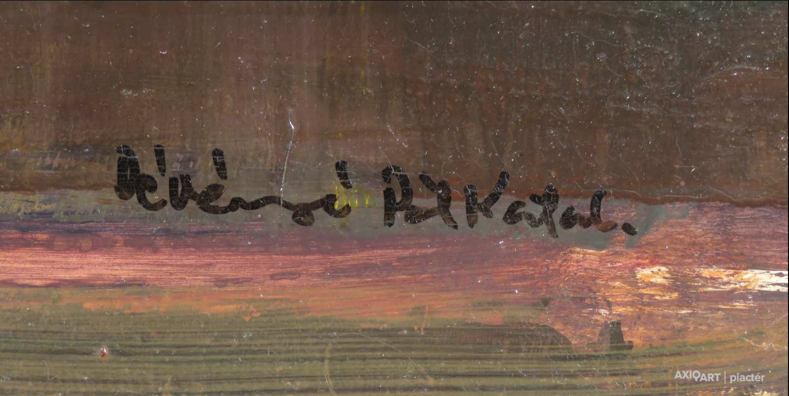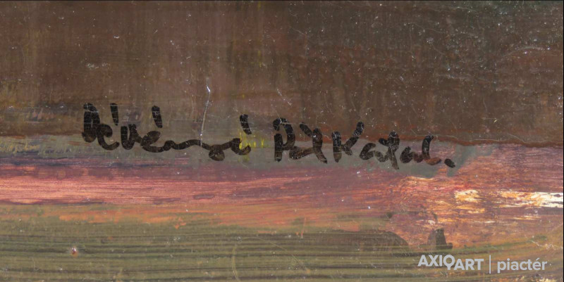 [FK3264/FL-4] A kép mérete: 31,5 x 70,5 cm keret nélkül. Készült: Olaj, tempera, Farostlemez A kép Kurucz D. István (Hódmezővásárhely, 1914, Budapest, 1996) alkotása. Jelezve Jobbra lent "Kurucz 977" A festmény jó állapotban van. Keret: Ép A festmény hátoldalán a Képcsarnokvállalat raglapja látható. Magyar festők és grafikusok életrajzi lexikona I-II. Festő, grafikus. Vásárhelyről, ahol Darvasy István festőművész figyelt fel tehetségére, került Szőnyi István magániskolájába. A fővárosi Képzőművészeti Főiskolának, ahol Rudnay Gyula, Réti István, Benkhard Ágost, Szőnyi István voltak a tanítómesterei 1940-ig volt a tanítványa. A monumentális festészetet Nagy Sándor tanította. Tanulmányúton járt több kelet- és nyugat-európai államban, Mongóliában, Japánban, Algériában. 1940-ben Hódmezővásárhelyen telepedett le, 1943-1947 között bekapcsolódott szülővárosa művészeti és közéletébe. A Vásárhely Népe c. lap munkatársa volt. 1949-59 között Szőnyi tanársegédjeként freskótechnikát tanított a főiskolán. 1951-52-ben megszervezte a Honvédségi Képzőművészeti Stúdiót, majd kinevezték a Honvéd Képzőművészeti Iskola igazgatójának. A vásárhelyi iskola reprezentáns egyéniségeként jelentős szerepe volt a Vásárhelyi Őszi Tárlatok elindításában. Megszervezete és vezette a Mednyánszky Társaságot, s haláláig művészeti vezetője volt a Hajdúböszörményi Nemzetközi Művésztelepnek. Évekig elnöke volt a Hortobágyi Alkotótábornak. Az alföldi parasztok életét megörökítő képei a falképek összefoglaló stílusában a népi realizmus és a dekoratív sommázás szellemében készültek. Számos falképet festett (Kossuth Akadémia, hódmezővásárhelyi iskola, stb.). 1941-től számos kisebb-nagyobb egyéni kiállítása volt, bemutatkozott több hazai és külhoni városban. 1941-től minden jelentősebb országos rendezvény és a magyar művészek külföldi bemutatóinak résztvevője. Rendszeresen szerepelt a Vásárhelyi Őszi Tárlatokon, a Hatvani Tájkép és Portrébiennálékon, a Szegedi Nyári Tárlatokon. Képei bemutatásra kerültek a vásárhelyi iskola jubileumi rendezvényein. 1962-ben több alkotásával szerepelt a Velencei Biennálén. Díjak: SZOT-díj, Munkácsy-díj, Érdemes és Kiváló Művész kitüntetés, Tornyai-plakett, római ösztöndíj, a Munka Érdemrend arany fokozata, Káplár Miklós-díj és emlékplakett, Kossuth-díj. Művei megtalálhatók minden jelentősebb hazai, több olasz és japán közgyűjteményben. (ML, D.J.: Műv. 1985/5, Tasnádi Attila adatközlése nyomán, L.L.: Műv. 1983/3) Magyar festők és grafikusok életrajzi lexikona I-II. Műgyűjtők és kereskedők kézikönyve Festő, grafikus. Vásárhelyről, ahol Darvasy István festőművész figyelt fel tehetségére, került Szőnyi István magániskolájába. A fővárosi Képzőművészeti Főiskolának, ahol Rudnay Gyula, Réti István, Benkhard Ágost, Szőnyi István voltak a tanítómesterei 1941-ig volt a növendéke. A monumentális festészetet Nagy Sándor tanította. Egy ideig tanársegédként működött Szőnyi mellett. Több ízben járt Itáliában tanulmányúton. Évekig művészeti vezetője volt a Hajdúböszörményi Nemzetközi Művésztelepnek. Az alföldi parasztok életét megörökítő képei a falképek összefoglaló stílusában a népi realizmus és a dekoratív sommázás szellemében készülnek. A II. világháború alatt szerepet vállalt a Szocialista Képzőművészek Csoportjának akcióiban. 1949-1960 k. a Képzőművészeti Főiskola falképtanszékének tanára volt. Több falképet festett (Kossuth Akadémia, hódmezővásárhelyi iskola, stb.). 1962-ben több alkotásával szerepelt a Velencei Biennálén, SZOT-díjas, Munkácsy-díjas, érdemes és kiváló művész kitüntető elismerésében részesült. (ML, D.J.: Műv.-1985/5, L.L: Műv.-1983/3) Magyar festők és grafikusok adattára Tanulmányait a Képzőművészeti Főiskolán végezte, ahol Rudnay Gyula és Réti István voltak a mesterei. 1941-1943-ban ösztöndíjas Rómában. 1943-1947 között Hódmezővásárhelyen dolgozik, egyidejűleg a Vásárhelyi Hétfő c. hetilap szerkesztője. 1949-1960 közötti években a budapesti Képzőművészeti Főiskola freskó tanszékének tanára. Az 1940-es évek eleje óta kiállító művész. 1962-ben a Velencei Biennálén állították ki műveit. 1970-ben Csók István Galériában volt kiállítása. A Vásárhelyi Őszi Tárlatok és a Szegedi Nyári Tárlatok rendszeres kiállító művésze. Az alföldi festészet egyéni hangú továbbfejlesztője. Táblaképeket, freskókat és kerámia falképeket alkot. Munkácsy-díjas, érdemes és kiváló művész kitüntető elismerésében részesült. A SZOT a legelső képzőművészek közt, 1962-ben tüntette ki díjával. A 70. születésnapját ünneplő művész 1984 decemberében életmű kiállítást rendezett műveiből a hódmezővásárhelyi Tornyai János Múzeumban. 1986-ban a budapesti Hollósy Galériában nyílt kiállítása. - Irod.: Szij Rezső: Kurucz Dezső István festőművész. Bp. 1967.; Kulcsár Ödön: SZOT-díjasok. Bp., 1981.; Lóska Lajos: Mindig freskót szerettem volna festeni. Beszélgetés Kurucz Dezső Istvánnal. Művészet, 1984. 3. Művészeti lexikon I-IV. Festő, Munkácsy-díjas. A Képzőművészeti Főiskolán Rudnay Gyula, Réti István, Benkhard Ágost, Szőnyi István növendéke volt 1934-40 között. Több ízben járt külföldi tanulmányúton. Az alföldi parasztok életét megörökítő képei a falképek összefoglaló stílusában a népi realizmus és a dekoratív sommázás szellemében készülnek. 1949-60 között a Képzőművészeti Főiskola falképtanszékének tanára volt. Több falképet festett (Kossuth Akadémia; Hódmezővásárhely, iskola, pápai pártház, 1965). Legutóbb 195