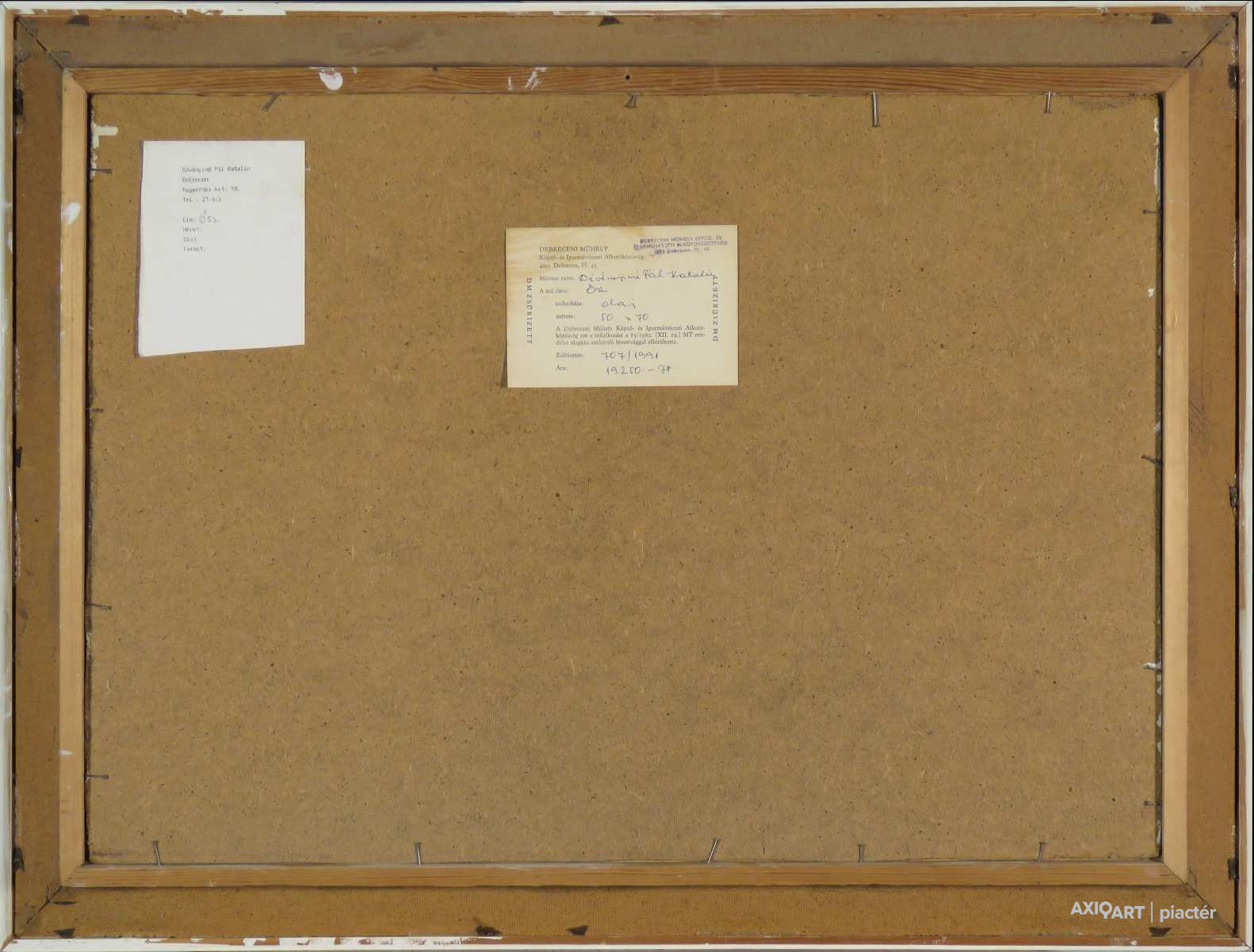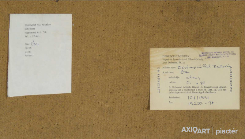 [FKC862/Bp50/21] A kép mérete: 50 x 70 cm keret nélkül. Készült: Olaj, Farostlemez A kép Dévényiné Pál Katalin (Debrecen, 1929, 2000) alkotása. Jelezve jobbra lent "Dévényiné Pál Katalin" A festmény jó állapotban van. Keret: Új Magyar festők és grafikusok életrajzi lexikona I-II. Debrecen, 1929 - Festő és grafikus. 1977-től a debreceni Képzőművészeti Stúdió tagjaként Félegyházi László és Biró Lajos irányításával képezte magát. Tanulmányúton járt több európai országban. 1988-ban a Szakszervezetek Hajdú-Bihar megyei Tanács Képzőművészeti díjával jutalmazták. A sokszínű magyar tájat festi, a Hortobágy tanyáitól, a Balaton-part csodálatos világáig. Olajban és pasztellben alkot. Jelentősek pasztell portréi és aktjai. Több nemzetközi művésztelep munkájában részt vett. Debreceni, megyei, országos és külföldi tárlatokon szerepel. (LÁ, Kiállítási Tájékoztató)
