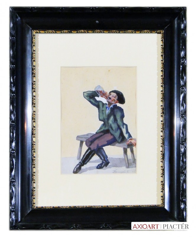 [6544/033] Jelezve jobbra lent DINNYÉS F. Paszpartúban, üveg mögött, azonnal falra akasztható állapotban. Szélesség: 21 cm Hosszúság: 14 cm Dinnyés Ferenc festő Születési hely: Budapest Születési dátum: 1886 Honlap: Kiállítások az adatbázisban:  Egy század sokszínűsége - a szegedi kisgrafika megteremtői és folytatói Mesterei: Ferenczy Károly, Hegedűs László. 1907-1910: Magyar Képzőművészeti Főiskola, mesterei: Ferenczy Károly, Hegedűs László. Szegeden élt. 1910 körül tanulmányúton járt Párizsban, ahol mindenekelőtt Van Gogh és a Fauve-ok művészete hatott rá. Képein a kontrasztos színek ritmikus gazdagságát éppúgy kihasználta, akár a fény-árnyék jelenségekben rejlő drámai, dinamikus lehetőségeket. ~ festészete egészében az expresszív színkezelés és a szerkesztő elvű építkezés egységére alapozódott, ami főként a Szocialista Képzőművészek Csoportja szellemiségével rokonítható. Az 1930-as évektől azonban elvontabb, zaklatottabb és misztikusabb képek kerültek ki az alkotó műhelyéből. Előtérbe kerültek a szimbolikus, biblikus látomások, amiket organikus, csavart, vonagló formákkal közvetített. Itt a szecessziós kifejezés nyugtalansága szervesen összefonódott az expresszív előadás érzelmi lendületével. Egyéni kiállítások 1968 • Magyar Nemzeti Galéria, Budapest • Móra Ferenc Múzeum Képtára, Szeged (gyűjteményes kiáll., kat.) Válogatott csoportos kiállítások 1958 • Szegedi művészek retrospektív tárlata, Móra Ferenc Múzeum Képtára, Szeged. Művek közgyűjteményekben Irodalom SZELESI Z.: ~ emlékezete, Tiszatáj, 1958/5. ~ emlékkiállításáról, Tiszatáj, 1961/10. Móra Ferenc Múzeum, Szeged, 1968. SZELESI Z.: Festészet a Tisza partján, Művészet, 1973/8. SZUROMI P.: Nyugtalan tájakon. ~ művészete, Művészet, 1987/1. DÖMÖTÖR J.: ~, Szeged, 1992. Szuromi Pál Forrás: artportal.hu