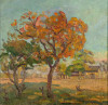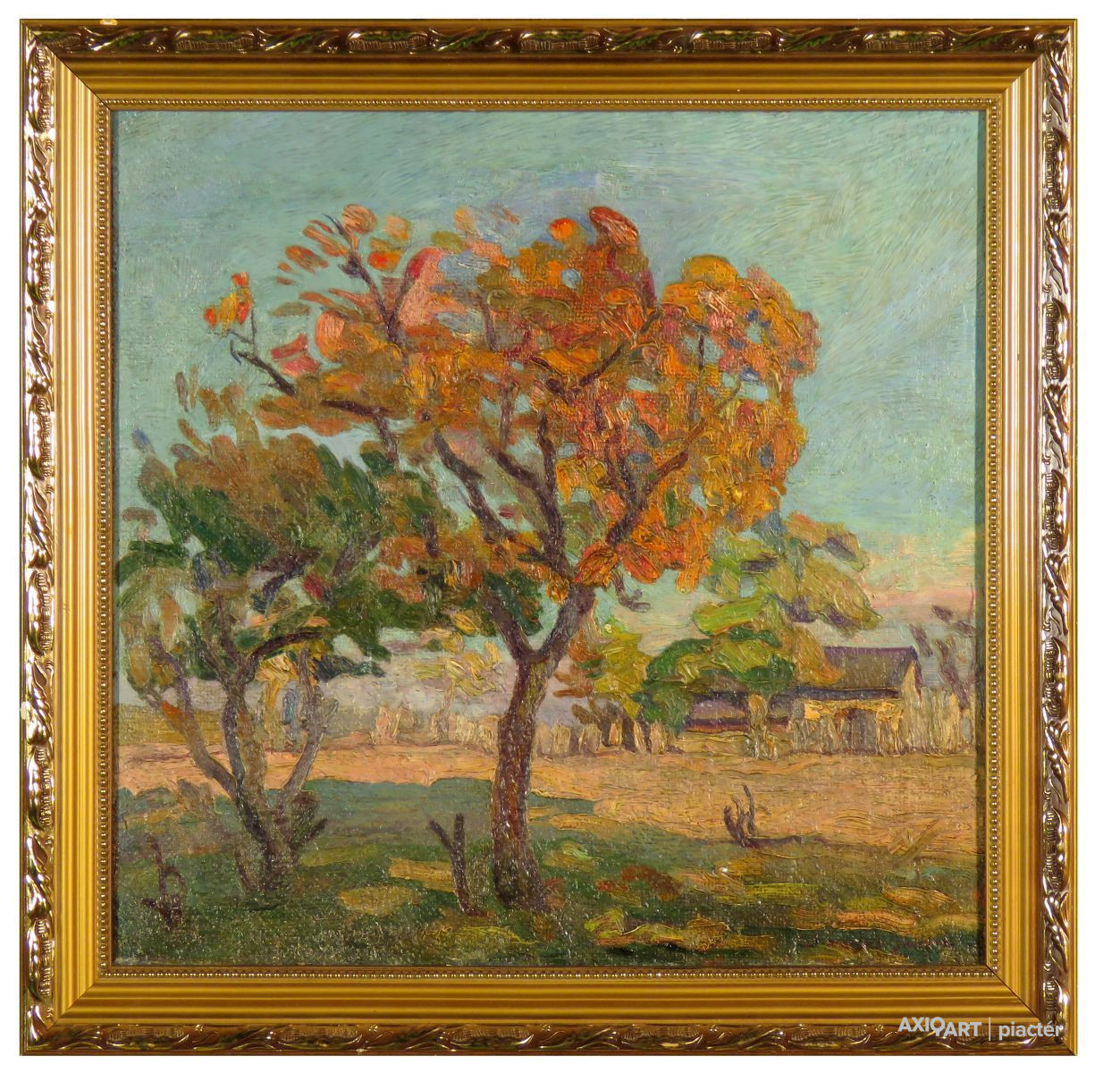 [FKB833/BX-1] A kép mérete: 43,5 x 44,5 cm keret nélkül. Készült: Olaj, Vászon A kép Dinnyés Ferenc (Budapest, 1886, Szeged, 1958) alkotása. Jelezve jobbra lent "Dinnyés Ferenc" A festmény jó állapotban van. Keret: Ép Magyar festők és grafikusok életrajzi lexikona I-II. Festő. Tanulmányait a budapesti Képzőművészeti Főiskolán végezte. Ferenczy Károly és Hegedűs László voltak a tanárai. 1910 körül tanulmányúton járt Párizsban. A nagybányai festőkolónián is folytatott művészi stúdiumokat. A plein airben jelentkező fény- és színproblémák iránti érzékenységet mesterétől, Ferenczytől sajátította el. A nagybányai eredmények kamatoztatása Dinnyés művészi kibontakozásának alapjaivá vált és a Tiszatáj helyi karakterét megragadó festészete ebben gyökerezik. Budapesten állította ki a pointillizmus felé hajló impresszionista táj- és arcképeit. Többször szerepelt a bécsi Sezessionban. 1919-ben Szegeden telepedett le, ahol több kiállítása volt. 1927-ben kollektív bemutatója volt a Nemzeti Szalonban. Képeinek témái Szegedhez és közvetlen környezetéhez kötődnek: a mély fekvésű Alsóváros parasztházai, a nádasoktól övezett Rókus-tó és a festői Móraváros egykori tanyái gyakran kerültek vásznaira. A városrészleteken kívül szeretettel jelenített meg egy-egy öreg munkást, de az itteni paprikahasító asszonyokat is gyakran megfestette. A '30-as évektől elvontabb, zaklatottabb, misztikusabb képek kerültek ki az alkotó műhelyéből. Előtérbe kerültek a szimbolikus, biblikus látomások, amiket organikus, csavart, vonagló formákkal közvetített. Itt a szecessziós kifejezés nyugtalansága szervesen összefonódott az expresszív előadás érzelmi lendületével. Emlékkiállításokat a Magyar Nemzeti Galériában, a szegedi Művészklubban és a Móra Ferenc Múzeumban rendeztek számára. Több alkotása található a szegedi Móra Ferenc Múzeumban. (ML, Éber, Sz.Z.: Műv. 1973/8, Szuromi Pál) Magyar festők és grafikusok életrajzi lexikona I-II. Műgyűjtők és kereskedők kézikönyve Festő. Tanulmányait a bp.-i Képzőművészeti Főiskolán végezte. Ferenczy Károly és Hegedűs László voltak a tanárai. A nagybányai művésztelepen is megfordult. A plein-air-ban jelentkező fény- és színproblémák iránti érzékenységet Ferenczy Károlytól sajátította el. A nagybányai eredmények kamatoztatása Dinnyés művészi kibontakozásának alapjaivá vált és a Tiszatáj helyi karakterét megragadó festészete ebben gyökerezik. Budapesten állította ki a pointillizmus felé hajló impresszionista táj- és arcképeit. Többször szerepelt a Bécsi Sezessionban. 1919-ben Szegeden telepedett le, ahol több kiállítása volt. 1927-ben kollektív kiállítása volt a Nemzeti Szalonban. Képeinek témái Szegedhez kötődnek: a mély fekvésű Alsóváros parasztházai, a nádasoktól övezett Rókus-tó és Móraváros egykori tanyái gyakran kerültek vásznaira. A városrészleteken kívül szeretettel jelenített meg egy-egy öreg munkást, de az itteni paprikahasító asszonyokat is gyakran megfestette. Emlékkiállításokat a Magyar Nemzeti Galériában, Szegeden a Művészklubban és a Móra Ferenc Múzeumban rendeztek számára. Több műve található a szegedi Móra Ferenc Múzeumban. (ML, Éber, Sz.Z.: Műv.-1973/8) Magyar festők és grafikusok adattára Tanulmányait Budapesten végezte, ahol Ferenczy Károly és Hegedűs László voltak a mesterei. 1910-ben Szegeden telepedett le. Első szegedi bemutatkozása 1919-ben történt. Hol melegen vöröslő, hol ezüstös finom színekkel festett vásznai a nagybányai mesterek, elsősorban Ferenczy Károly festészetének tanulságairól vallanak. Emlékkiállítását 1968-ban a Móra Ferenc Múzeumban, a következő évben pedig a MNG rendezte meg. 1973-ban a szegedi Művészklubban rendeztek emlékére kiállítást. - Irod.: Szelesi Zoltán: Szeged Képzőművészete. Szeged, 1945.; Szuromi Pál: Nyugtalan tájakon. Dinnyés Ferenc emlékezete. Művészet, 1987. 1. Művészeti lexikon I-IV. Festő. Tanulmányait Bp.-en végezte, s ugyanott állította ki a pointillizmus felé hajló impresszionista táj- és arcképeit. Többször szerepelt a bécsi Sezessionban. Később Szegeden telepedett le. 1927-ben kollektív kiállítása volt a Nemzeti Szalonban. Több képe található a szegedi Móra Ferenc-múzeumban, ahol 1960-ban rendezték meg emlékkiállítását. Művészeti lexikon I-II. Festő. Budapesten végezte tanulmányait. Táj- és arcképeket állított ki Budapesten, 1927. koll. kiállítása volt a Nemzeti Szalonban. Szegeden él. Pointillizmus felé hajló impresszionista.