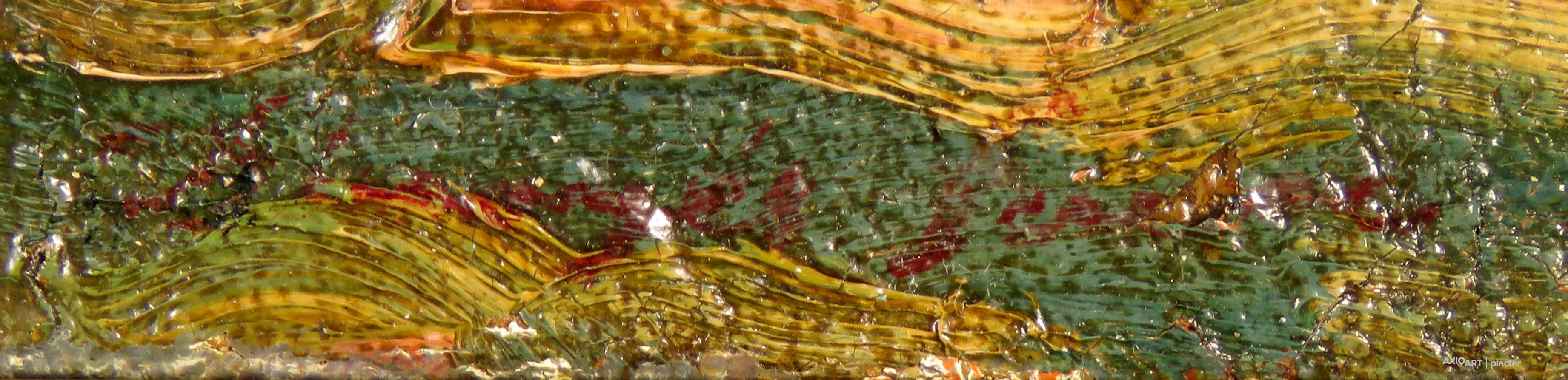 [FK0037/Z018] A kép mérete: 50 x 70 cm keret nélkül. Készült: Olaj, Vászon A kép Paizs László (Szentpéterúr, 1935) alkotása. Jelezve Jobbra lent "P. L." A festmény jó állapotban van. Keret: Ép A festmény hátoldalán a Képcsarnokvállalat címkéje található. Magyar festők és grafikusok életrajzi lexikona I-II. Festő. Tanulmányait a budapesti Iparművészeti Főiskolán végezte 1959-ben. Z. Gács György, Rákosy Zoltán és Szentiványi Lajos növendéke volt. A '60-as évek első felében hagyományosabb felfogású olajképeket festett, mozaikokat, freskókat, utóbb a pop-art körébe tartozó, a francia Arman munkáival rokon műveket alkotott. 1961 óta kiállító művész. Egyéni (Fényes Adolf Terem, Csók Galéria, Műcsarnok, Magyar Nemzeti Galéria, Halászbástya, Bástya Galéria, Vigadó Galéria, Budapest Galéria, Győr, Szombathely, Szeged, Zalaegerszeg, Duisburg, Aix-en-Provence, stb). és vegyes (Ernst Múzeum, Műcsarnok, Óbuda Galéria, Magyar Nemzeti Galéria, Csók Galéria, Vigadó Galéria, Székesfehérvár, Kaposvár, Pécs, Hódmezővásárhely, Firenze, Milano, Padova, Nápoly, Velence, Düsseldorf, Aachen, Genf, stb) tárlatokon vett részt. 1980-ban Munkácsy-díjjal jutalmazták, 1988-ban Érdemes Művész kitüntető elismerésben részesült. Munkáit őrzi a Magyar Nemzeti Galéria, a Fővárosi Képtár, a szombathelyi képtár, a pécsi Janus P. Múzeum, a székesfehérvári István Király Múzeum és a dunaszerdahelyi Kortárs Magyar Galéria. (H.B.: Műv, 1972/4, K.Gy.: Műv. 1977/2, K.G.: Műv. 1978/10, M.L.: Műv, 1983/5, R.G.: Műv, 1987/9, Sz.Gy.: Új Műv. 1995/4, MK) Magyar festők és grafikusok életrajzi lexikona I-II. Műgyűjtők és kereskedők kézikönyve Festő. Tanulmányait a bp.-i Iparművészeti Főiskolán végezte. Mozaikokat ferskókat, utóbb a pop-art körébe tartozó, a francia Arman műveivel rokon műveket alkotott. Mozaikok: a Szegedi Megyei Tanács, a Pécsi Óvoda, a Gödöllői Agrártudományi Egyetem. Freskók: Budapest - Csatárka úti Gyermekotthon. 1971-ben a Fényes Adolf Teremben volt kiállítása, 1983-ban pedig a szegedi Móra Ferenc Múzeumban nagyszabású tárlatokon mutatta be munkáit. 1988-ban érdemes művész kitüntető elismerésben részesült. (MK) Magyar festők és grafikusok adattára Az Iparművészeti Főiskolán végzett 1959-ben. Mozaikokat (Szeged, Megyei Tanács; Pécs, Óvoda; Gödöllő, Agrártudományi Egyetem), freskókat (Budapest, Csatárka úti Gyermekotthon), újabban a pop art körébe tartozó, a francia Arman műveivel rokon műveket alkotott. 1971-ben a Fényes Adolf Teremben nyílt kiállítása. 1983 februárjában a szegedi Móra Ferenc Múzeumban megrendezett nagyszabású tárlaton mutatta be alkotásait. 1988-ban érdemes művész kitüntető elismerésben részesült. - MK Művészeti lexikon I-IV. (Szentpéterur, 1935. dec. 26.- ): festő. Az Iparművészeti Főiskolán 1959-ben végzett Rákosy Zoltán, Z. Gách György és Szentiványi Lajos növendékeként. Épületdiszítő mozaikokat, (Szeged, Megyei Tanács, 1961; Pécs, Óvoda, 1964), műanyagfreskókat (Bp., Csatárka úti Gyermekotthon, 1964) és gobelinterveket készít. Kortárs magyar művészeti lexikon I-III. Festő, szobrász, grafikus. 1959: MIF, mesterei: Z. Gács György, Rákosy Zoltán, Szentiványi Lajos. 1980: Munkácsy-díj; 1988: érdemes művész. Főiskolás éveinek második felében, majd azt követően számos murális munka kivitelezésében vett részt, Fónyi Géza, Konecsni György, Z. Gács György, Rákosi Zoltán és Domanovszky Endre mellett dolgozva. A 60-as évek első felének hagyományosabb fölfogású olajképeket festett. 1964-ben a Velencei B.-n megismerkedett az amerikai pavilonban a pop art Európában akkor még újnak számító törekvésével, és részben ez inspirálta, hogy 1967-ben textil, fém, bőr anyagú "varrottas" képeket küldjön az FKS éves tárlatára; a megnyitó előtt többek között az ő munkáit is eltávolították a falról. A 70-es években pop art-os objekteket (A trónörököspár politikai gyilkosság áldozata lett, 1970, plexiüveg, újság, szarvasbogarak), majd konstruktív, átlátszó plexiüveg plasztikákat készített belső fénytörő határfelületekkel. A 80-as években készültek az anyagában színezett, konstruktív, nagyméretű poliészter szobrai, majd színes poliészter táblaképeket alkotott, mesterségesen roncsolt felületekkel, mintha régészeti leletek vagy atomtámadás utáni festmény-szurrogátumok lennének. Ekkor kezdett organikus plaszikájú bronzszobrokat is mintázni. A 90-es években, a táblaképek és szobrok mellett nagyméretű, egyedi grafikákat készített, formavilágában némileg a roncsolt táblaképekből kiindulva, de szinte kizárólag az emberi alakból elvonatkoztatott torzókat megjelenítve. Ek: 1966: Művészklub, Győr; 1971: Fényes A. T.; 1972: Bercsényi 28-30 G.; 1973: BME B-épület; 1976: Csók G.; 1977: G. Hildebrandt, Duisburg (NSZK); 1979: Bástya G., Halászbástya; Helyőrségi Műv. H., Nagyatád; József A. Műv. Közp., Szeged; Göcsej M., Zalaegerszeg; 1982: Bezzegh G., Küsnacht (CH); 1983: Móra F. M., Szeged; 1987: Műcsarnok (kat.); MNG; 1988: Pandora G., Badacsonytomaj; 1989: Parktheatter, Iserlohn (NSZK); Qualitas G.; Hevesi S. Színház, Zalaegerszeg; 1990: Vasarely Fondation (Ferdinánd Judittal, Fóth Ernővel), Aix-en-Provence (FR); 1994: Vigadó G.; 1997: Pest Center G.; 1998: Budapest G. (kat.); 1999: Pest Center G. (kat); G. Arcis, Sárvár; MMA, Bp.; 2001: SZK, Szhely; Ernst M. (kat.) Vcsk: 1961, 1964, 1966: FKS, Ernst M.; 1962: 9. Magyar Képzőműv. kiállítás, Műcsarnok; 1967: Mai magyar festészet, Új-Delhi; 1969: Vas megyei művészek, Savaria M., Szhely; V. Orsz. Grafikai B., Miskolc; 1971: Új művek, Műcsarnok; 1972: Fiatal művészek Budapestről. Likovni Salon, Újvidék (YU); 1972, 1973: Balatonboglár
