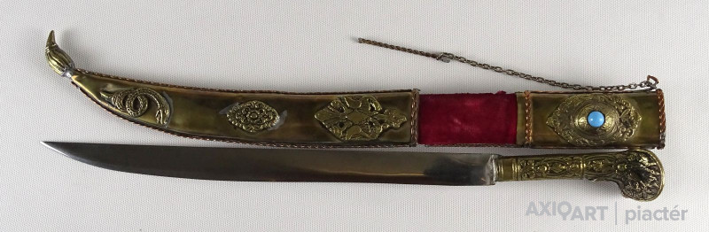 [1P727/X204] Réz tőr, dísztőr, díszes hüvelyben. A hüvely mindkét oldala gazdagon díszített, rajta kígyóval, türkizkék kővel. A markolat szintén rézből készült, virágdíszes, csont alakú. Pengéje szép állapotú. Hosszúság: 58 cm Súly: 0.76 kg Görög függetlenségi háború Görög függetlenségi háború A forradalmak része az 1820-as években Balra fent: A phalirói tábor . Jobbra fent: Egy oszmán fregatt felgyújtása egy görög tűzoltóhajó által . Jobbra lent: A navarinói csata . Balra lent: Ibrahim Pasha Egyiptomból Missolonghi harmadik ostrománál . Dátum 1821. február 21. – 1829. szeptember 12. [2] (8 év, 6 hónap és 3 hét) Elhelyezkedés Oszmán Görögország (a mai Görögország ) Eredmény Görög győzelem: A görög függetlenség Az Első Görög Köztársaság megalakulása (1822-1832) Az orosz-török ​​háború kezdete (1828-1829) Londoni Jegyzőkönyv konstantinápolyi szerződés A Görög Királyság megalakulása (1832) Az első egyiptomi-oszmán háború kezdete A szamoszi hercegség autonómiája (1834) Az Oszmán Birodalom elismeri Görögországot Területi változások A Peloponnészosz , a Szaron-szigetek , a Kikládok , a Sporadok és a kontinentális Görögország átengedték a független görög államot Kréta átengedte Egyiptomnak   A görög függetlenségi háború,  más néven görög forradalom vagy 1821-es görög forradalom , a görög forradalmárok sikeres függetlenségi háborúja volt az Oszmán Birodalom ellen 1821 és 1829 között.1826-ban a görögök segítséget kaptak. a Brit Birodalom , a Francia Királyság és az Orosz Birodalom , míg az oszmánokat észak-afrikai vazallusaik, különösen Egyiptom eyalet segítették . A háború a modern Görögország kialakulásához vezetett, amelyet a későbbi években modern méretűre bővítenek. A forradalmat a görögök világszerte a függetlenség napjaként ünneplik minden év március 25-én. Az egész görög terület, kivéve a Jón-szigeteket , a Mani-félszigetet és Epirus egyes hegyvidékeit, oszmán uralom alá került a 15. században, a Konstantinápoly eleste körüli évtizedekben . A következő évszázadok során számos görög felkelés volt az oszmán uralom ellen. A legtöbb felkelés a Mani-félsziget független görög birodalmában kezdődött, amelyet soha nem hódítottak meg az oszmánok, a legnagyobb háború pedig 1770-ben, az Orlov-lázadás idején tetőzött. 1814-ben egy titkos szervezet, a Filiki Eteria(Baráti Társaság) azzal a céllal alakult, hogy felszabadítsa Görögországot, a forradalom ösztönzésére , amely akkoriban általános volt Európában. A Filiki Eteria lázadásokat tervezett a Peloponnészoszban , a Duna-menti Fejedelemségekben és Konstantinápolyban . A felkelést 1821. március 25-re tervezték (a Julianus-naptár szerint ), az ortodox keresztények angyali üdvözletének ünnepére . A Filiki Eteria terveit azonban az oszmán hatóságok fedezték fel, így a forradalom korábban elkezdődött. Az első lázadás 1821. február 21-én kezdődött a Duna-parti Fejedelemségekben , de az oszmánok hamarosan leverték. Ezek az események sürgették a peloponnészoszi görögöket (Morea ) akcióba lépett, és 1821. március 17-én a manióták először üzentek háborút. 1821 szeptemberében a görögök Theodoros Kolokotronis vezetésével elfoglalták Tripolitsát . Krétán , Macedóniában és Közép-Görögországban lázadások törtek ki, de végül elfojtották őket. Eközben a rögtönzött görög flották sikereket értek el az oszmán haditengerészet ellen az Égei-tengeren , és megakadályozták az oszmán erősítések tengeri érkezését. Hamarosan feszültség alakult ki a különböző görög frakciók között, ami két egymást követő polgárháborúhoz vezetett. Az oszmán szultán behívta az egyiptomi Muhammad Alit , aki beleegyezett abba, hogy fiát, Ibrahim pasát Görögországba küldi egy hadsereggel, hogy területi nyereségért cserébe leverje a lázadást. Ibrahim 1825 februárjában szállt partra a Peloponnészoszon, és az év végére a félsziget nagy részét egyiptomi ellenőrzés alá vonta. Missolonghi városa 1826 áprilisában esett el a törökök egy évig tartó ostroma után. Mani sikertelen inváziója ellenére Athén is elesett, és a forradalmi morál csökkent. Ekkor a három nagyhatalom – Oroszország, Nagy-Britannia és Franciaország – úgy döntött, hogy beavatkoznak, és 1827-ben Görögországba küldték haditengerészeti osztagaikat. Miután a hírek szerint az egyesített oszmán-egyiptomi flotta megtámadja a szövetséges európai Hydra szigetét . flották feltartóztatták az oszmán haditengerészetet Navarinonál . Egy hetes feszült patthelyzet után a navarinói csata az oszmán-egyiptomi flotta megsemmisítéséhez vezetett, és a forradalmárok javára fordította a helyzetet. 1828-ban az egyiptomi hadsereg egy francia expedíciós erő nyomására kivonult. A peloponnészoszi oszmán helyőrségek megadták magukat, és a görög forradalmárok megkezdték Görögország középső részének visszafoglalását. Az Oszmán Birodalom hadat üzent Oroszországnak, lehetővé téve az orosz hadsereg bevonulását a Balkánra, Konstantinápoly közelébe. Ez arra kényszerítette az oszmánokat, hogy az adriánópolyi szerződésben elfogadják a görög autonómiát, valamint Szerbia és a román fejedelemségek autonómiáját. Kilenc év háború után az 1830. februári Londoni Jegyzőkönyv értelmében Görögországot végül független államként ismerték el. A további tárgyalások 1832-ben a londoni konferenciához és a konstantinápolyi szerződéshez vezettek , amelyek meghatározták az új állam végső ha