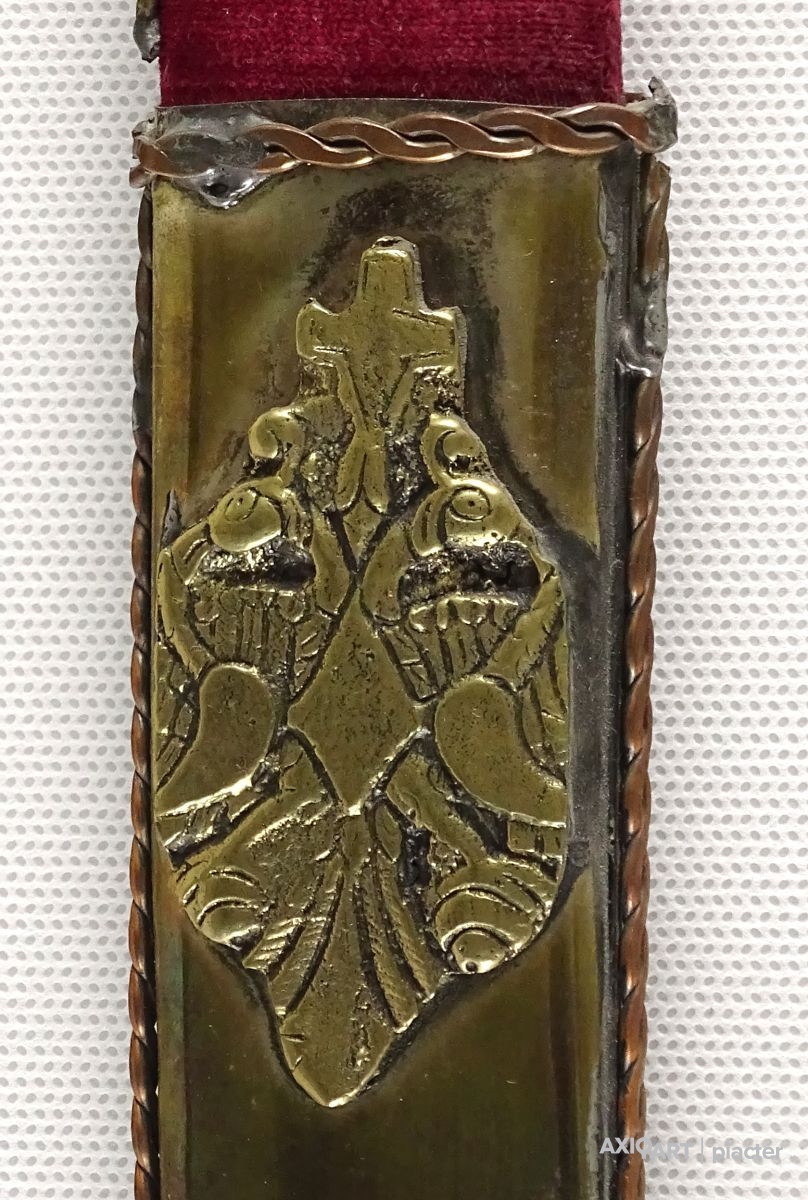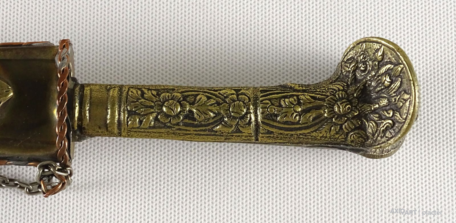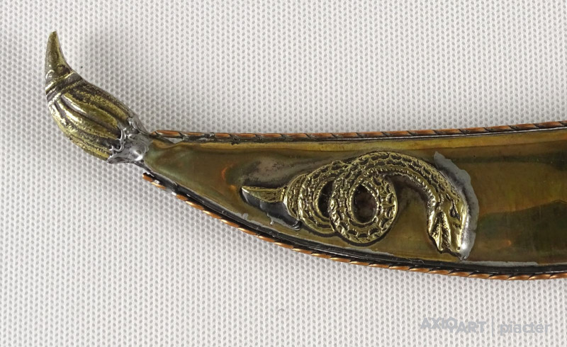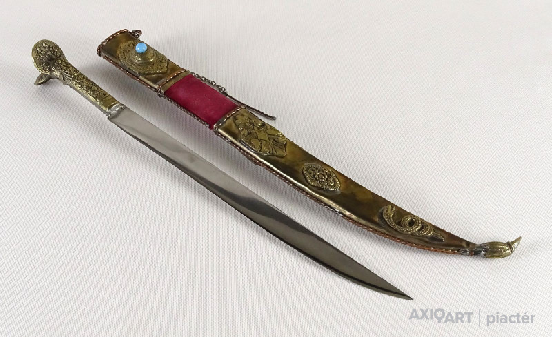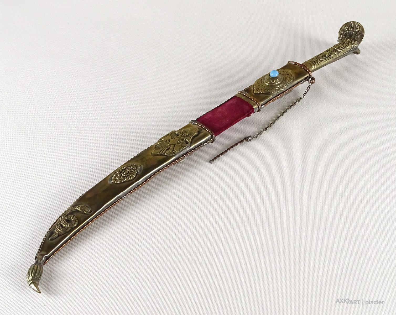 Réz tőr, dísztőr, díszes hüvelyben. A hüvely mindkét oldala gazdagon díszített, rajta kígyóval, türkizkék kővel. A markolat szintén rézből készült, virágdíszes, csont alakú. Pengéje szép állapotú.