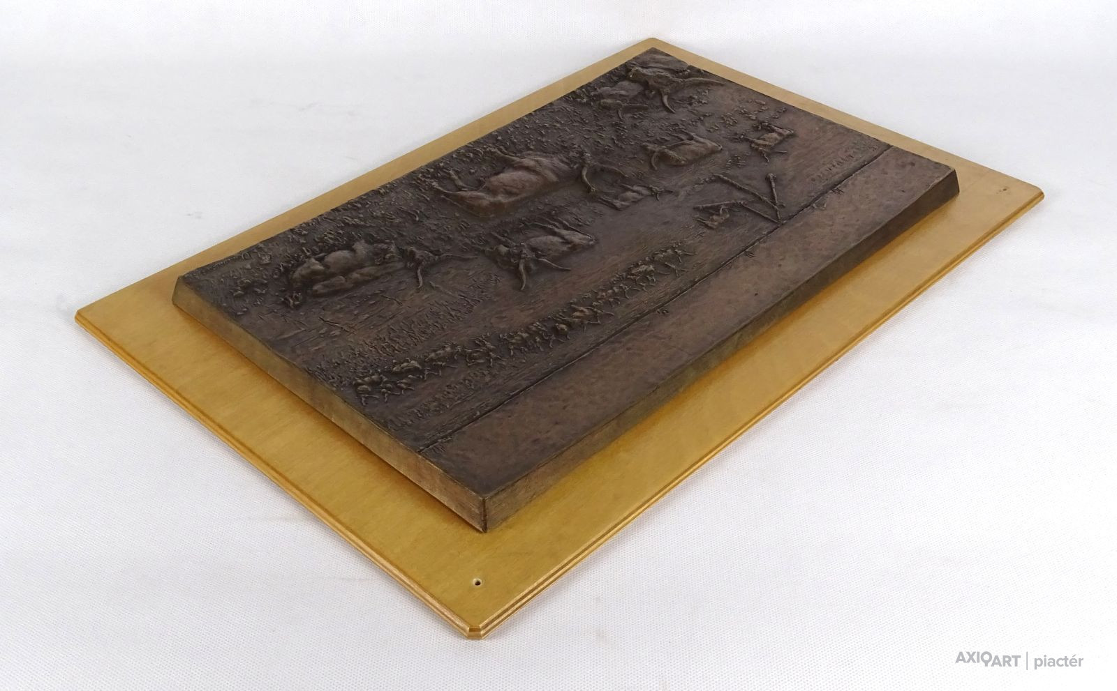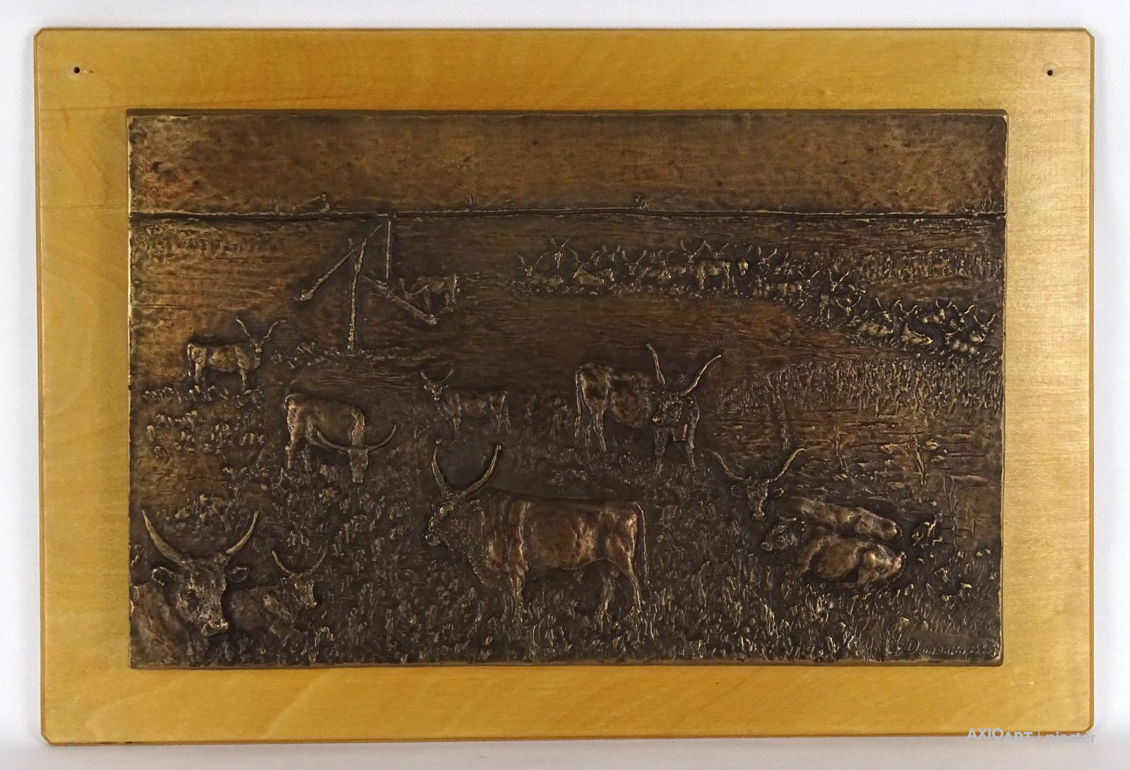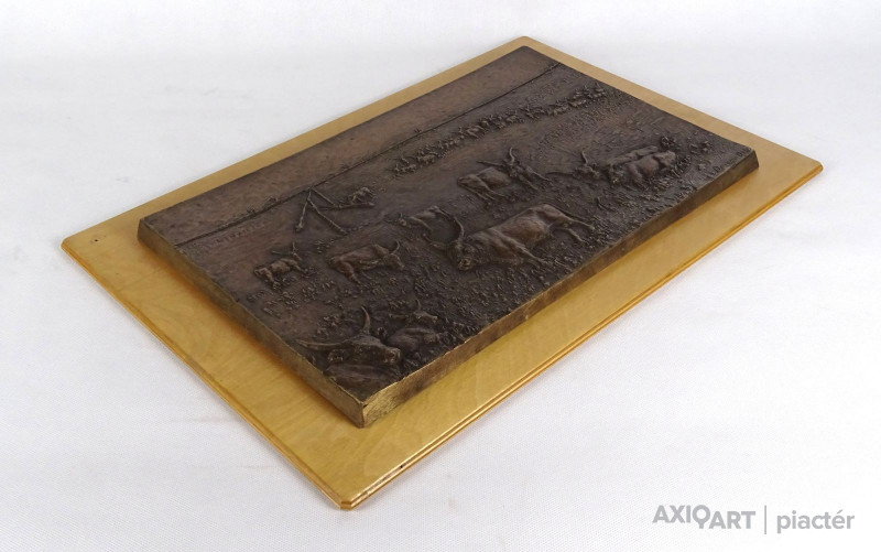 Fa lapra illesztett jelzett nagy méretű bronz plakett. Hortobágyi puszta, szürkemarha és gémeskút plasztikus megjelenítéssel.