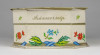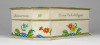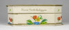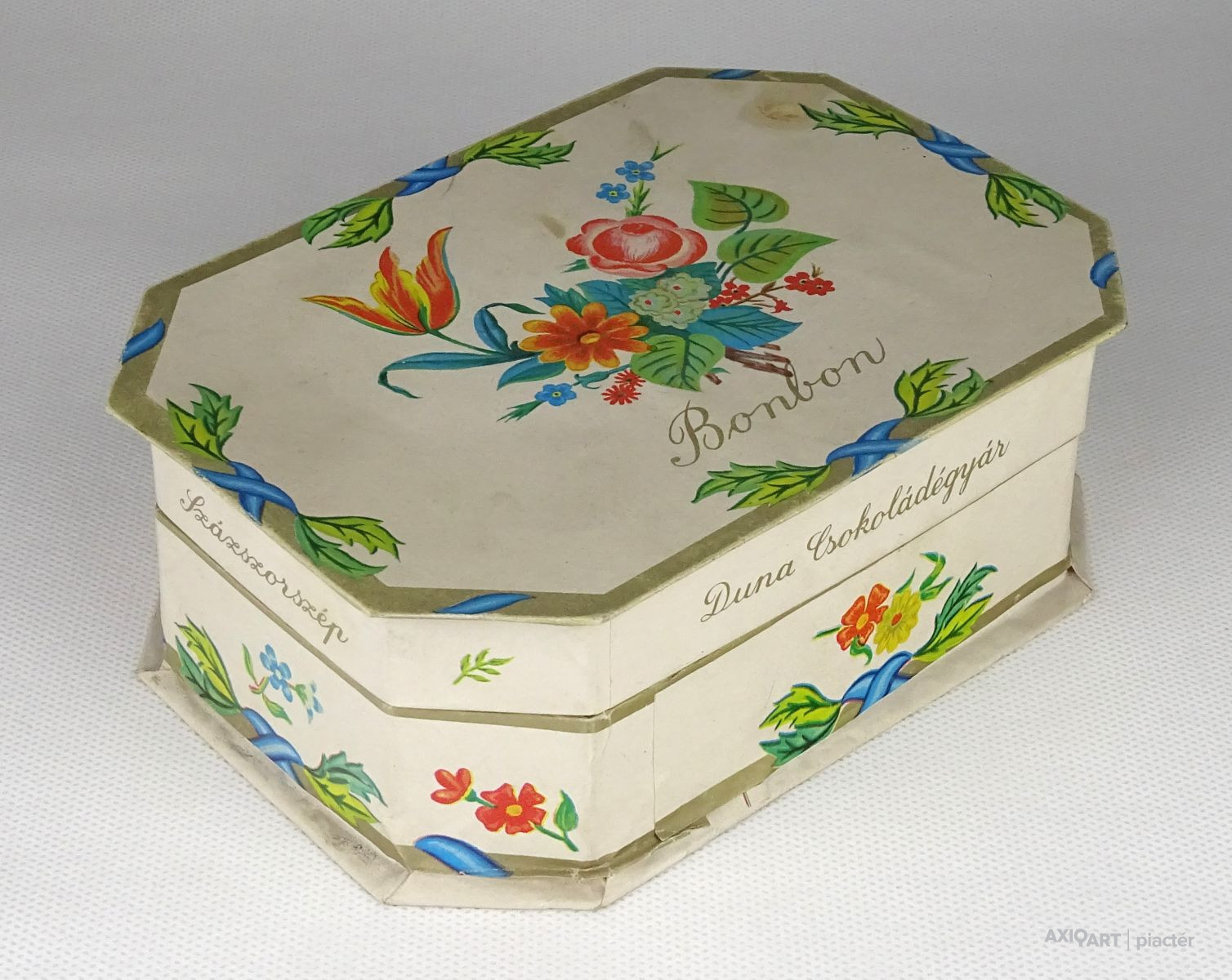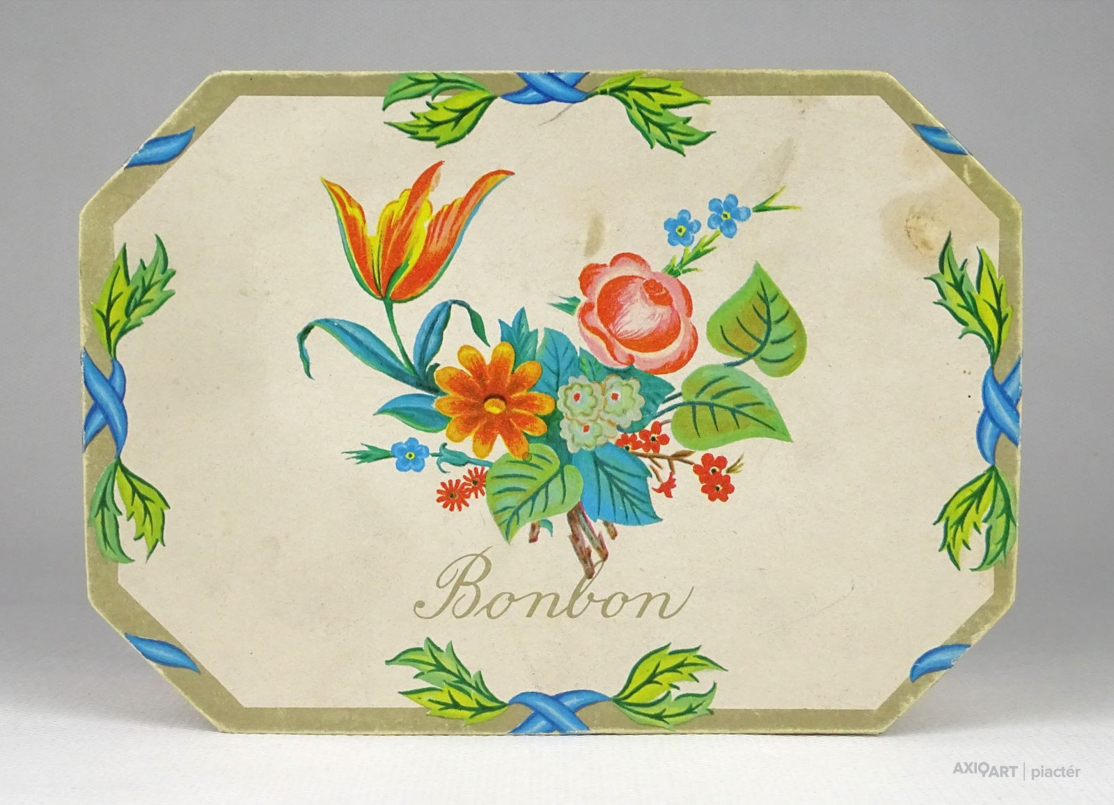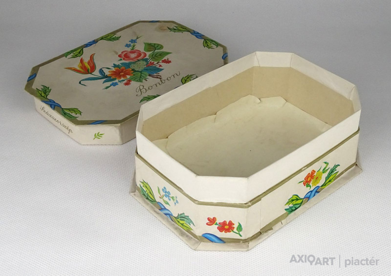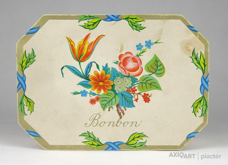 Régi, szép állapotú, feliratos, virágdíszes kemény karton díszdoboz, bonbon doboz.